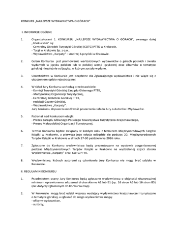 KONKURS „NAJLEPSZE WYDAWNICTWA O GÓRACH” I. INFORMCJE OGÓLNE 1. Organizatorami 1. KONKURSU „NAJLEPSZE WYDAWNICTWA O GÓRACH”, zwanego dalej „Konkursem” są: - Centralny Ośrodek Turystyki Górskiej (COTG) PTTK w Krakowie, - Targi w Krakowie Sp. z o.o., - Wydawnictwo „Karpaty” – Andrzej Łączyński w Krakowie. 2. Celem Konkursu jest promowanie wartościowych wydawnictw o górach polskich i świata wydanych w języku polskim lub w polskiej wersji językowej oraz albumów o tematyce górskiej niezależnie od języka, w którym zostały wydane. 3. Uczestnictwo w Konkursie jest bezpłatne dla Zgłaszającego wydawnictwa i nie wiąże się z uiszczeniem opłaty rejestracyjnej. 4. W skład Jury Konkursu wchodzą przedstawiciele: - Komisji Turystyki Górskiej Zarządu Głównego PTTK, - Małopolskiej Organizacji Turystycznej, - Centralnej Biblioteki Górskiej PTTK, - redakcji Gazety Górskiej, - Wydawnictwa „Karpaty”. Jury Konkursu dopuszcza możliwość poszerzenia składu Jury o Autorów i Wydawców. 5. Patronat nad Konkursem objęli: - Prezes Zarządu Głównego Polskiego Towarzystwa Turystyczno-Krajoznawczego, - Prezes Małopolskiej Organizacji Turystycznej. 6. Termin Konkursu będzie związany w każdym roku z terminem Międzynarodowych Targów Książki w Krakowie, a pierwsza jego edycja odbędzie się podczas 20. Międzynarodowych Targów Książki w Krakowie w dniach 27-30 października 2016 roku. 7. Zgłoszone do Konkursu wydawnictwa będą prezentowane na wystawie zorganizowanej podczas Międzynarodowych Targów Książki w Krakowie na wydzielonej części stoiska Wydawnictwa „Karpaty” oraz COTG PTTK. 8. Wydawnictwa, których autorami są członkowie Jury Konkursu nie mogą brać udziału w Konkursie. II. REGULAMIN KONKURSU 1. Przedmiotem oceny Jury Konkursu będą zgłoszone wydawnictwa o objętości równoważnej minimum oprawionemu arkuszowi drukarskiemu A1 lub B1 (np. 16 stron A5 lub 16 stron B5) (nie dotyczy zgłoszonych do Konkursu map). 2. W Konkursie mogą brać udział wszyscy wydający wydawnictwa krajoznawcze i turystyczne o tematyce górskiej, a zgłaszać do niego wydawnictwa mogą: - oficyny wydawnicze, - autorzy, - związki twórcze, - organizacje społeczne i stowarzyszenia, - samorządy, - parki narodowe i krajobrazowe, - inne nie wymienione uprzednio instytucje i organizacje po wcześniejszym uzgodnieniu z COTG PTTK w Krakowie. Adres do korespondencji: Centralny Ośrodek Turystyki Górskiej PTTK ul. Jagiellońska 6, 31 – 010 Kraków lub [email protected], telefon +48 12 422 28 40. 3. Każdy zgłaszający może do Konkursu zgłosić dowolną ilość wydawnictw, które ukazały się z wydrukowaną datą wydania w latach 2014-2016. W następnych latach do Konkursu mogą być zgłaszane wydawnictwa, które ukazały się z datą wydania w roku organizacji danej edycji Konkursu oraz w kolejnych dwóch latach poprzedzających tę edycję Konkursu. Nie mogą być zgłaszane wydawnictwa, które brały udział w poprzednich edycjach Konkursu. 4. Wydawnictwa mogą być zgłaszane do Konkursu i będą oceniane w następujących kategoriach: I. albumy – wydane w dowolnym języku, II. przewodniki – wydane w języku polskim lub polskiej wersji językowej, III. monografie, wydawnictwa popularnonaukowe oraz inne – wydane w języku polskim lub w polskiej wersji językowej, IV. poezja – wydana w języku polskim, V. mapy i atlasy – wydane z tekstem lub przynajmniej z legendą w języku polskim. 5. Warunkiem udziału w Konkursie jest: - przesłanie lub dostarczenie najpóźniej do dnia 20 września każdego roku kalendarzowego pisemnego zgłoszenia, wypełniając osobne formularze zgłoszeniowe dla każdego zgłaszanego wydawnictwa oraz załączając po jednym egzemplarzu zgłaszanych wydawnictw na adres: Centralny Ośrodek Turystyki Górskiej PTTK, ul. Jagiellońska 6, 31-010 Kraków, z dopiskiem: KONKURS „NAJLEPSZE WYDAWNICTWA O GÓRACH”, - 20 września jest terminem, w którym zgłoszenie i egzemplarze zgłoszonych wydawnictw muszą znaleźć się pod adresem podanym powyżej. 6. Formularz zgłoszeniowy jest dostępny na www.cotg.pttk.pl i zawiera: - pełną nazwę lub nazwisko i imię oraz adres zgłaszającego, a także imię i nazwisko osoby upoważnionej do kontaktów z organizatorami Konkursu wraz z jej telefonem i adresem e-mail, - wykaz zgłaszanych wydawnictw obejmujący następujące dane: tytuły, ich autorów, miejsca i rok oraz numery wydań lub wznowień, a także numery ISBN i kategorie Konkursu, do których są zgłaszane, (wydawnictwo można zgłaszać tylko do jednej wybranej kategorii), - termin przyjmowania zgłoszeń do Konkursu. 7. Zgłaszający przesyłają wydawnictwa na swój koszt i ryzyko, w opakowaniu odpowiednio zabezpieczającym przesyłkę przed uszkodzeniem. 8. Zgłoszone wydawnictwa oceni oraz wybierze laureatów Jury Konkursu. Jury Konkursu ma prawo nie przyznawać wszystkich regulaminowych nagród i wyróżnień. 9. Przedmiotem oceny będzie merytoryczna zawartość wydawnictw, ich użyteczność, formy prezentacji walorów opisywanego terenu oraz poziom edytorski. 10. Organizatorzy zastrzegają sobie prawo wyeliminowania z Konkursu wydawnictw, które nie noszą cech literatury związanej swą tematyką z górami lub nie spełniają warunków regulaminu. Wymienione w tym punkcie wydawnictwa nie będą zwracane ich nadawcom. 11. Wydawcy zgłoszeni do Konkursu, będący jego laureatami, otrzymają honorowe dyplomy oraz drewniane trofea przyznane za pierwsze, drugie i trzecie miejsce w poszczególnych kategoriach. Przewidywane jest również przyznanie nagród i wyróżnień specjalnych ufundowanych przez organizatorów lub sponsorów Konkursu. Wszyscy pozostali Wydawcy biorący udział w Konkursie otrzymają dyplomy uczestnictwa. 12. Ogłoszenie wyników Konkursu, wraz z uroczystym wręczeniem honorowych dyplomów, nagród i wyróżnień, będzie się odbywać w każdym roku kalendarzowym w pierwszym dniu Mię