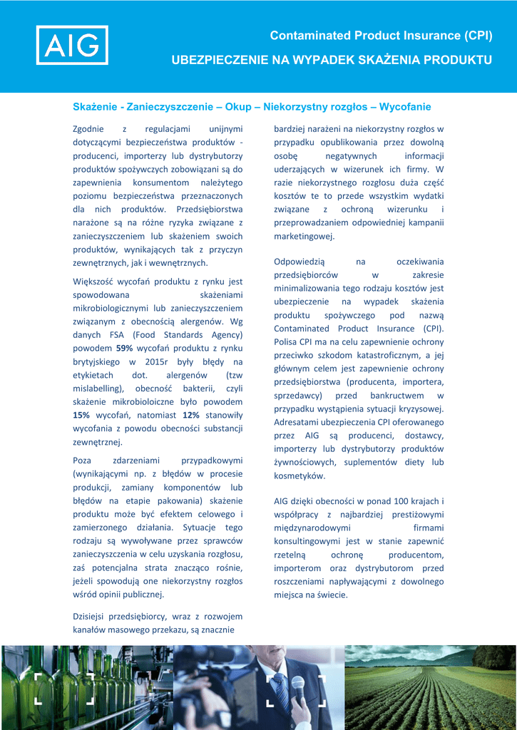 Contaminated Product Insurance (CPI) UBEZPIECZENIE NA WYPADEK SKAŻENIA PRODUKTU Skażenie - Zanieczyszczenie – Okup – Niekorzystny rozgłos – Wycofanie Zgodnie z regulacjami unijnymi dotyczącymi bezpieczeństwa produktów producenci, importerzy lub dystrybutorzy produktów spożywczych zobowiązani są do zapewnienia konsumentom należytego poziomu bezpieczeństwa przeznaczonych dla nich produktów. Przedsiębiorstwa narażone są na różne ryzyka związane z zanieczyszczeniem lub skażeniem swoich produktów, wynikających tak z przyczyn zewnętrznych, jak i wewnętrznych. Większość wycofań produktu z rynku jest spowodowana skażeniami mikrobiologicznymi lub zanieczyszczeniem związanym z obecnością alergenów. Wg danych FSA (Food Standards Agency) powodem 59% wycofań produktu z rynku brytyjskiego w 2015r były błędy na etykietach dot. alergenów (tzw mislabelling), obecność bakterii, czyli skażenie mikrobioloiczne było powodem 15% wycofań, natomiast 12% stanowiły wycofania z powodu obecności substancji zewnętrznej. Poza zdarzeniami przypadkowymi (wynikającymi np. z błędów w procesie produkcji, zamiany komponentów lub błędów na etapie pakowania) skażenie produktu może być efektem celowego i zamierzonego działania. Sytuacje tego rodzaju są wywoływane przez sprawców zanieczyszczenia w celu uzyskania rozgłosu, zaś potencjalna strata znacząco rośnie, jeżeli spowodują one niekorzystny rozgłos wśród opinii publicznej. Dzisiejsi przedsiębiorcy, wraz z rozwojem kanałów masowego przekazu, są znacznie bardziej narażeni na niekorzystny rozgłos w przypadku opublikowania przez dowolną osobę negatywnych informacji uderzających w wizerunek ich firmy. W razie niekorzystnego rozgłosu duża część kosztów te to przede wszystkim wydatki związane z ochroną wizerunku i przeprowadzaniem odpowiedniej kampanii marketingowej. Odpowiedzią na oczekiwania przedsiębiorców w zakresie minimalizowania tego rodzaju kosztów jest ubezpieczenie na wypadek skażenia produktu spożywczego pod nazwą Contaminated Product Insurance (CPI). Polisa CPI ma na celu zapewnienie ochrony przeciwko szkodom katastroficznym, a jej głównym celem jest zapewnienie ochrony przedsiębiorstwa (producenta, importera, sprzedawcy) przed bankructwem w przypadku wystąpienia sytuacji kryzysowej. Adresatami ubezpieczenia CPI oferowanego przez AIG są producenci, dostawcy, importerzy lub dystrybutorzy produktów żywnościowych, suplementów diety lub kosmetyków. AIG dzięki obecności w ponad 100 krajach i współpracy z najbardziej prestiżowymi międzynarodowymi firmami konsultingowymi jest w stanie zapewnić rzetelną ochronę producentom, importerom oraz dystrybutorom przed roszczeniami napływającymi z dowolnego miejsca na świecie. Contaminated Product Insurance (CPI) UBEZPIECZENIE NA WYPADEK SKAŻENIA PRODUKTU AIG, jako jedyna firma na polskim rynku oferuje stały dostęp do swoich konsultantów poprzez całodobową infolinię. Takie rozwiązanie pozwala nam na natychmiastową reakcję w przypadku wystąpienia zdarzenia ubezpieczeniowego, co często skutkuje zażegnaniem sytuacji kryzysowej, zanim osiągnie ona katastroficzne rozmiary. Najważniejsze zalety ubezpieczenia to m.in.: ochrona bezpośrednich kosztów wycofania produktu z rynku, w tym testów laboratoryjnych, utylizacji i pozbycia się skażonych produktów, wynajęcia dodatkowych magazynów lub siły roboczej, naprawy lub demontażu wadliwego produktu, pokrycie kosztów ogłoszeń w prasie i innych środkach komunikacji masowej, ochrona dodatkowych kosztów związanych z prowadzeniem biznesu i wynikających bezpośrednio ze zdarzenia objętego ubezpieczeniem takich jak np. udokumentowany spadek sprzedaży będący wynikiem wycofania produktu z rynku, ochrona marki poprzez wykorzystanie wiedzy konsultantów specjalizujących się w zarządzaniu kryzysowym, ochrona w sytuacji zagrożenia celowym i zamierzonym skażeniem produktu. objęcie ochroną kosztów okupu związanego z groźbą zatrucia lub skażenia produktu, objęcie ochroną kosztów zastąpienia skażonych produktów, ochrona bezpośrednich kosztów wycofania produktu z rynku przez osobę trzecią w interesie i w imieniu Ubezpieczonego. NASI PARTNERZY NYA International – wsparcie w sytuacji zdarzeń mających znamiona Celowej Niekorzystnej Ingerencji w Produkt lub Wymuszenia Okupu za Produkty (Szantaż) NSF International – pomoc w razie zdarzeń mających znamiona Przypadkowego Skażenia FleishmanHillard – wsparcie w obszarze komunikacji w mediach
