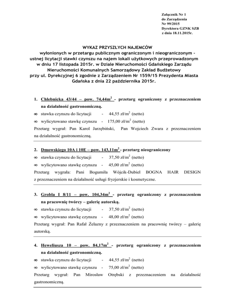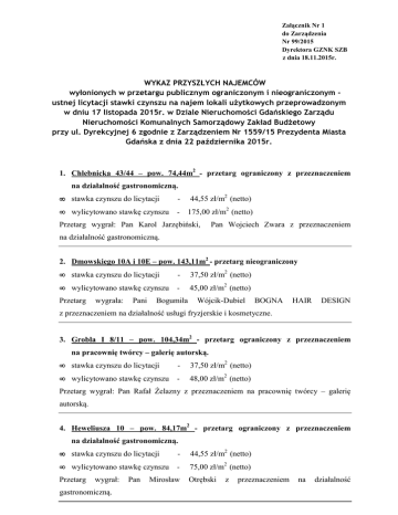 Załącznik Nr 1 do Zarządzenia Nr 99/2015 Dyrektora GZNK SZB z dnia 18.11.2015r. WYKAZ PRZYSZŁYCH NAJEMCÓW wyłonionych w przetargu publicznym ograniczonym i nieograniczonym ustnej licytacji stawki czynszu na najem lokali użytkowych przeprowadzonym w dniu 17 listopada 2015r. w Dziale Nieruchomości Gdańskiego Zarządu Nieruchomości Komunalnych Samorządowy Zakład Budżetowy przy ul. Dyrekcyjnej 6 zgodnie z Zarządzeniem Nr 1559/15 Prezydenta Miasta Gdańska z dnia 22 października 2015r. 1. Chlebnicka 43/44 – pow. 74,44m2 - przetarg ograniczony z przeznaczeniem na działalność gastronomiczną. • stawka czynszu do licytacji - • wylicytowano stawkę czynszu - 175,00 zł/m2 (netto) 44,55 zł/m2 (netto) Przetarg wygrał: Pan Karol Jarzębiński, Pan Wojciech Zwara z przeznaczeniem na działalność gastronomiczną. 2. Dmowskiego 10A i 10E – pow. 143,11m2 - przetarg nieograniczony • stawka czynszu do licytacji - 37,50 zł/m2 (netto) • wylicytowano stawkę czynszu - 45,00 zł/m2 (netto) Przetarg wygrała: Pani Bogumiła Wójcik-Dubiel BOGNA HAIR DESIGN z przeznaczeniem na działalność usługi fryzjerskie i kosmetyczne. 3. Grobla I 8/11 – pow. 104,34m2 - przetarg ograniczony z przeznaczeniem na pracownię twórcy – galerię autorską. • stawka czynszu do licytacji - 37,50 zł/m2 (netto) • wylicytowano stawkę czynszu - 48,00 zł/m2 (netto) Przetarg wygrał: Pan Rafał Żelazny z przeznaczeniem na pracownię twórcy – galerię autorską. 4. Heweliusza 10 – pow. 84,17m2 - przetarg ograniczony z przeznaczeniem na działalność gastronomiczną. • stawka czynszu do licytacji - 44,55 zł/m2 (netto) • wylicytowano stawkę czynszu - 75,00 zł/m2 (netto) Przetarg wygrał: gastronomiczną. Pan Mirosław Otrębski z przeznaczeniem na działalność 5. Miodowa 32 – pow. 68,19m2 - przetarg nieograniczony • stawka czynszu do licytacji - 9,29 zł/m2 (netto) • wylicytowano stawkę czynszu - 12,00 zł/m2 (netto) Przetarg wygrał: Pan Mirosław Otrębski z przeznaczeniem na działalność sklep spożywczy. 6. Wróbla 15 – pow. 15,92m2 - przetarg ograniczony z przeznaczeniem na działalność: usługi towarzyszące działalności gastronomicznej z opcją dostosowania lokalu do działalności gastronomicznej. • stawka czynszu do licytacji - 16,34 zł/m2 (netto) • wylicytowano stawkę czynszu - 20,00 zł/m2 (netto) Przetarg wygrała: Pani Bożena Krzemińska PHU BOME z przeznaczeniem na działalność: usługi towarzyszące działalności gastronomicznej z opcją dostosowania lokalu do działalności gastronomicznej. Sporządził: Przewodniczący Komisji Przetargowej: Specjalista ds. lokali użytkowych Kierownik Działu Nieruchomości mgr Irena Kordel Małgorzata Mitrus