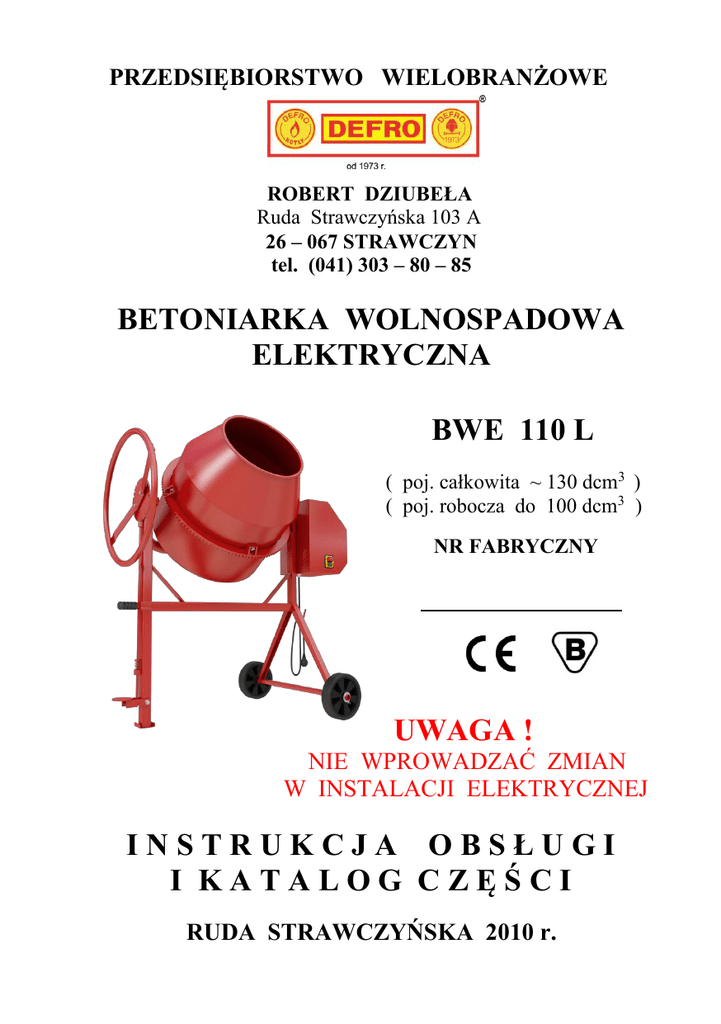 PRZEDSIĘBIORSTWO WIELOBRANŻOWE ROBERT DZIUBEŁA Ruda Strawczyńska 103 A 26 – 067 STRAWCZYN tel. (041) 303 – 80 – 85 BETONIARKA WOLNOSPADOWA ELEKTRYCZNA BWE 110 L ( poj. całkowita ~ 130 dcm3 ) ( poj. robocza do 100 dcm3 ) NR FABRYCZNY UWAGA ! NIE WPROWADZAĆ ZMIAN W INSTALACJI ELEKTRYCZNEJ INSTRUKCJA OBSŁUGI I KATALOG CZĘŚCI RUDA STRAWCZYŃSKA 2010 r. -1- -2D E K L A R A C J A Z G O D N O Ś C I WE Przedsiębiorstwo Wielobranżowe „ DEFRO ” ROBERT DZIUBEŁA Ruda Strawczyńska 103 A 26 – 067 Strawczyn Imię i nazwisko osoby upoważnionej do przygotowania dokumentacji technicznej: Czesław Dusza Deklarujemy na naszą wyłączną odpowiedzialność, że produkt : Betoniarka Wolnospadowa Elektryczna BWE 110 L Przeznaczona do produkcji mieszanek betonowych, zapraw cementowo – wapiennych oraz do mieszania materiałów sypkich na sucho lub mokro Nr fabryczny ........................... Rok produkcji ........................... do którego ta deklaracja się odnosi, odpowiada przepisom bezpieczeństwa, zdrowia i ochrony środowiska zawartych w Dyrektywach: - 2006 /42 /WE, dot. Maszyn i elementów bezpieczeństwa wdrożonej do prawa polskiego Rozporządzeniem Ministra Gospodarki z dn. 21.10.2009 r. ( Dz.U.Nr 199,poz 1228 ) . - 2006 /95 / WE dot. sprzętu elektrycznego, wdrożonej do prawa polskiego Rozporządzeniem Ministra Gospodarki z dnia 21 sierpnia 2007 r. w sprawie zasadniczych wymagań dla sprzętu elektrycznego ( Dz. U. Nr 155 z 2007, poz.1089 ), - 2000/14/WE, zmieniona dyrektywą 2005/88/WE dot. zasadniczych wymagań dla urządzeń używanych na zewnątrz pomieszczeń w zakresie emisji hałasu do środowiska wdrożonej do prawa polskiego Rozporządzeniem Ministra Gospodarki z dnia 15 lutego 2006 r. ( Dz. U. Nr 32 poz.223 ) - 2004 / 108 / WE ) dot. dokonania oceny zgodności aparatury z zasadniczymi wymaganiami dotyczącymi kompatybilności elektromagnetycznej oraz sposobu jej oznakowania, wdrożonej do polskiego prawodawstwa Ustawą z dn. 13.04.2007 r. o kompatybilności elektromagnetycznej ( Dz. U. Nr 82, poz.556 ) W celu uzupełnienia odpowiednich wymogów bezpieczeństwa, zdrowia i ochrony środowiska, zawartych w Dyrektywach uwzględniono: -31. 2006/42/WE, następujące normy zharmonizowane: - PN – EN ISO 12100–2: 2005 + PN – EN ISO 12100–2; 2005/A1: 2009; PN – EN ISO 13857:2008; 2. 2006 /95 / WE, następujące normy zharmonizowane: - PN – EN 60204 – 1:2006 + PN – EN 60204 – 1: 2006/A1: 2009 3. Inne normy: - PN – ISO 3600: 1998; PN – ISO 11684: 1998. oraz wymagania określone w dyrektywie 2000/14/WE potwierdzone przez jednostkę notyfikowaną IBMER Laboratorium Badawcze Elektryki Rolniczej ( LBER ) – Warszawa ul. Rakowiecka 32 ( Dokumentacja techniczna w tym Sprawozdanie z badań nr LBER / 03 / 08 z dnia 27.02.2008r w posiadaniu Pana Roberta Dziubeła, 26-067 Ruda Strawczyńska 103 A ). Metoda pomiarów: zgodna z PN – EN ISO 3744: 1999 Zmierzony poziom mocy akustycznej Gwarantowany poziom mocy akustycznej LWA = 86 dB LWA = 89 dB (A) Numer i nazwa akredytowanej jednostki certyfikującej, która brała udział w procesie certyfikacji zgodności: Certyfikat Akredytacji Nr AC 006 Jednostki Certyfikującej Wyroby, Instytut Budownictwa, Mechanizacji i Elektryfikacji Rolnictwa, Zakład Jakości i Niezawodności ul. Rakowiecka 32, 02 – 532 Warszawa Jednostka Certyfikująca Wyroby wydała Certyfikat Zgodności Nr EC / 026 / 08 dotyczący betoniarki BWE 110 L . Ta deklaracja zgodności traci swą ważność, jeżeli w betoniarce BWE 110 L wprowadzono zmiany, została przebudowana bez naszej zgody lub jest użytkowana niezgodnie z instrukcją obsługi. Niniejsza deklaracja musi towarzyszyć betoniarce w przypadku przekazania własności innej osobie. Dwie ostatnie cyfry roku, w którym oznakowanie zostało naniesione: 08. Imię i nazwisko oraz podpis osoby upoważnionej do sporządzenia deklaracji zgodności w imieniu producenta – Robert Dziubeła. Prezes „ DEFRO ”- producent Ruda Strawczyńska styczeń 2010 r. Robert Dziubeła -4- -5IDENTYFIKACJA BETONIARKI Dane identyfikacyjne betoniarki umieszczone są na tabliczce znamionowej znajdującej się na osłonie napędu. Poniżej wpisać : nr fabryczny i rok produkcji betoniarki. Te dane można odczytać z tabliczki znamionowej, będą one potrzebne przy zamawianiu części zamiennych. Przedsiębiorstwo Wielobranżowe „ DEFRO ” ROBERT DZIUBEŁA Ruda Strawczyńska 103 A 26 – 067 Strawczyn BETONIARKA WOLNOSPADOWA ELEKTRYCZNA Symbol BWE 110 L Nr fabryczny Zasilanie Moc 230V / 50HZ 1,1 kW KJ Rok produkcji Pojemność całkowita ~ 130 dcm3 Pojemność użyteczna ~ 100 dcm3 Stopień ochrony Masa IP 44 ~ 70 kg Wszystkie informacje, rysunki zawarte w tej instrukcji i katalogu części odpowiadają konstrukcji dla betoniarki BWE 110 L wg daty wydania ( patrz okładka ). Producent zastrzega sobie prawo do wprowadzania wszelkich zmian i usprawnień, które uważać będzie za celowe. Wszelkie prawa do przedruku są zastrzeżone Przedruk jedynie za zgodą producenta P. W. „ DEFRO ” INSTRUKCJA OBSŁUGI STANOWI PODSTAWOWE WYPOSAŻENIE BETONIARKI -6- SPIS TREŚCI 1. WSTĘP .............................................................................. 7 2. ZASADY BEZPIECZEŃSTWA PRACY .................... 8 2.1 2.2 2.3 2.4 2.5 Uwagi wstępne ................................................................... 8 Bezpieczeństwo użytkownika ............................................ 8 Znaki bezpieczeństwa umieszczone na betoniarce ............. 9 Opis ryzyka resztkowego ..................................................., 11 Ocena ryzyka resztkowego ................................................. 12 3. PRZEZNACZENIE .......................................................... 13 4. OPIS TECHNICZNY BETONIARKI BWE 110L ....... 13 4.1 Charakterystyka techniczna ................................................ 15 5. INSTALACJA ELEKTRYCZNA .................................. 16 6. URUCHOMIENIE I ZATRZYMAN