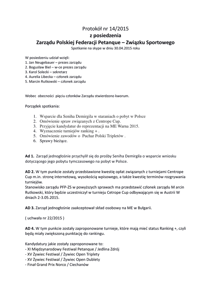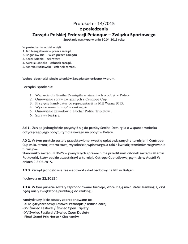 Protokół nr 14/2015 z posiedzenia Zarządu Polskiej Federacji Petanque – Związku Sportowego Spotkanie na skype w dniu 30.04.2015 roku W posiedzeniu udział wzięli: 1. Jan Neugebauer – prezes zarządu 2. Bogusław Biel – w-ce prezes zarządu 3. Karol Solecki – sekretarz 4. Aurelia Libecka – członek zarządu 5. Marcin Rutkowski – członek zarządu Wobec obecności pięciu członków Zarządu stwierdzono kworum. Porządek spotkania: 1. 2. 3. 4. 5. 6. Wsparcie dla Seniha Demirgila w staraniach o pobyt w Polsce Omówienie spraw związanych z Centrope Cup. Przyjęcie kandydatur do reprezentacji na ME Warna 2015. Wyznaczenie turniejów ranking + . Omówienie zawodów o Puchar Polski Tripletów . Sprawy bieżące. Ad 1. Zarząd jednogłośnie przychylił się do prośby Seniha Demirgila o wsparcie wniosku dotyczącego jego pobytu tymczasowego na pobyt w Polsce. AD 2. W tym punkcie zostały przedstawione kwestię opłat związanych z turniejami Centrope Cup m.in. stronę internetową, wysokością wpisowego, a także kwestię terminów rozgrywania turniejów. Stanowisko zarządu PFP-ZS w powyższych sprawach ma przedstawić członek zarządu M arcin Rutkowski, który będzie uczestniczył w turnieju Cetrope Cup odbywającym się w Austrii W dniach 2-3.05.2015. AD 3. Zarząd jednogłośnie zaakceptował skład osobowy na ME w Bułgarii. ( uchwała nr 22/2015 ) AD 4. W tym punkcie zostały zaproponowane turnieje, które mają mieć status Ranking +, czyli będą miały zwiększoną punktację do rankingu. Kandydatury jakie zostały zaproponowane to: - XI Międzynarodowy Festiwal Petanque / Jedlina Zdrój - XV Żywiec Festiwal / Żywiec Open Triplety - XV Żywiec Festiwal / Żywiec Open Dublety - Finał Grand Prix Norco / Ciechanów Zarząd przy 5 głosach Za i 1 Wstrzymującym się przyjął propozycję Turniejów Ranking + ( uchwała nr 23/2015 ) AD 5. W tym punkcie został „przeanalizowany turniej” Puchar Polski Tripletów” , który odbył się w Żywcu w dniach 25.04.2015. Kilku uczestników zebrania brało udział w powyższym turnieju wobec czego mogli przedstawić swoją opinię zarządowi. Była ona pozytywna odnośnie organizacji turnieju, dość wczesnej godziny zakończenia ( około godziny 19, często turnieje w poprzednich latach kończyły się w późnych godzinach nocnych). Również po dogłębnej analizie „nowego systemu” jakim rozgrywany był turniej zarząd uznał, że generalnie system się sprawdził mimo wielu obaw różnych środowisk „Petankowych”. Jedyny wniosek na tym etapie to przy udziale powyżej 64 drużyn do play-off powinny awansować 32 drużyny. AD 6. Ustalono kolejne posiedzenie zarządu na dzień 07.05.2015. Na tym punkcie posiedzenie zakończono. Sekretarz Karol Solecki Prezes PFP Jan Neugebauer