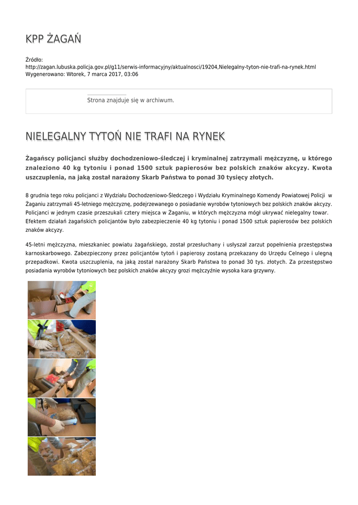 KPP ŻAGAŃ Źródło: http://zagan.lubuska.policja.gov.pl/g11/serwis-informacyjny/aktualnosci/19204,Nielegalny-tyton-nie-trafi-na-rynek.html Wygenerowano: Wtorek, 7 marca 2017, 03:06 Strona znajduje się w archiwum. NIELEGALNY TYTOŃ NIE TRAFI NA RYNEK Żagańscy policjanci służby dochodzeniowo-śledczej i kryminalnej zatrzymali mężczyznę, u którego znaleziono 40 kg tytoniu i ponad 1500 sztuk papierosów bez polskich znaków akcyzy. Kwota uszczuplenia, na jaką został narażony Skarb Państwa to ponad 30 tysięcy złotych. 8 grudnia tego roku policjanci z Wydziału Dochodzeniowo-Śledczego i Wydziału Kryminalnego Komendy Powiatowej Policji w Żaganiu zatrzymali 45-letniego mężczyznę, podejrzewanego o posiadanie wyrobów tytoniowych bez polskich znaków akcyzy. Policjanci w jednym czasie przeszukali cztery miejsca w Żaganiu, w których mężczyzna mógł ukrywać nielegalny towar. Efektem działań żagańskich policjantów było zabezpieczenie 40 kg tytoniu i ponad 1500 sztuk papierosów bez polskich znaków akcyzy. 45-letni mężczyzna, mieszkaniec powiatu żagańskiego, został przesłuchany i usłyszał zarzut popełnienia przestępstwa karnoskarbowego. Zabezpieczony przez policjantów tytoń i papierosy zostaną przekazany do Urzędu Celnego i ulegną przepadkowi. Kwota uszczuplenia, na jaką został narażony Skarb Państwa to ponad 30 tys. złotych. Za przestępstwo posiadania wyrobów tytoniowych bez polskich znaków akcyzy grozi mężczyźnie wysoka kara grzywny. Zainstaluj wtyczkę Flash, aby zobaczyć odtwarzacz. pobierz film - 8.94 MB Ocena: 0/5 (0) Tweetnij