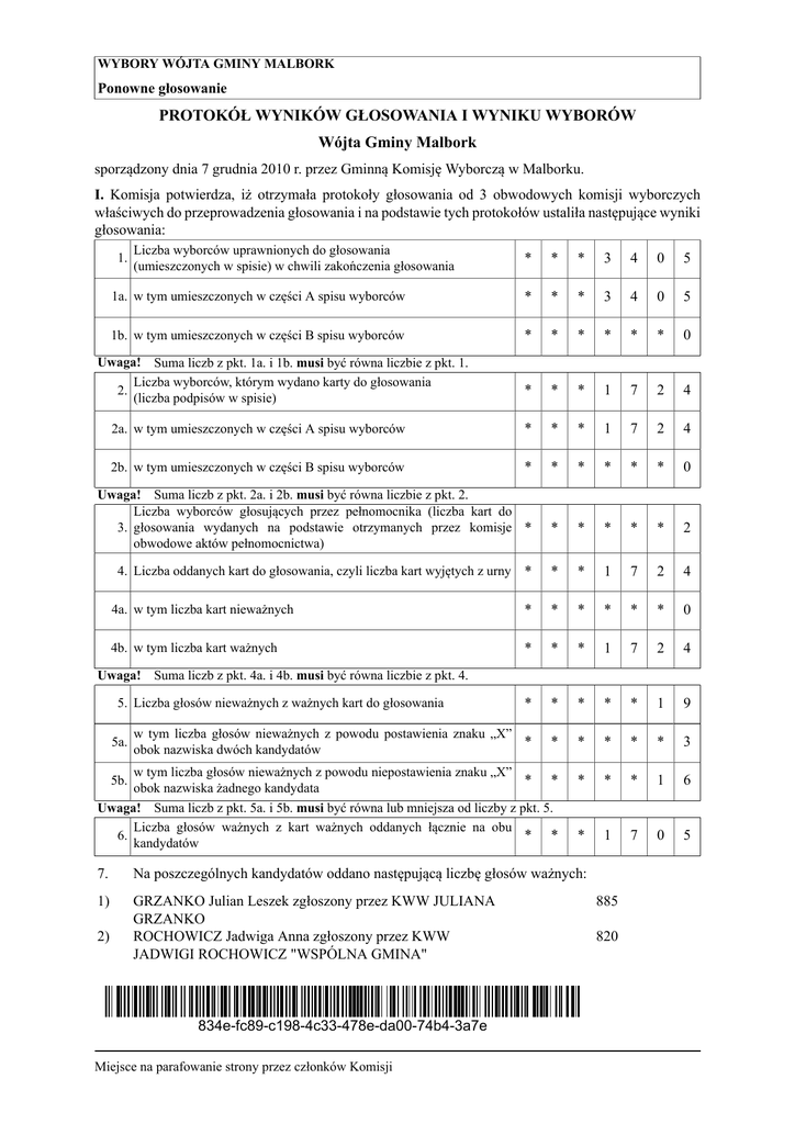 WYBORY WÓJTA GMINY MALBORK Ponowne głosowanie PROTOKÓŁ WYNIKÓW GŁOSOWANIA I WYNIKU WYBORÓW Wójta Gminy Malbork sporządzony dnia 7 grudnia 2010 r. przez Gminną Komisję Wyborczą w Malborku. I. Komisja potwierdza, iż otrzymała protokoły głosowania od 3 obwodowych komisji wyborczych właściwych do przeprowadzenia głosowania i na podstawie tych protokołów ustaliła następujące wyniki głosowania: Liczba wyborców uprawnionych do głosowania (umieszczonych w spisie) w chwili zakończenia głosowania * * * 3 4 0 5 1a. w tym umieszczonych w części A spisu wyborców * * * 3 4 0 5 1b. w tym umieszczonych w części B spisu wyborców * * * * * * 0 * * * 1 7 2 4 2a. w tym umieszczonych w części A spisu wyborców * * * 1 7 2 4 2b. w tym umieszczonych w części B spisu wyborców * * * * * * 0 * * * * * 2 4. Liczba oddanych kart do głosowania, czyli liczba kart wyjętych z urny * * * 1 7 2 4 4a. w tym liczba kart nieważnych * * * * * * 0 4b. w tym liczba kart ważnych * * * 1 7 2 4 * * * * * 1 9 w tym liczba głosów nieważnych z powodu postawienia znaku „X” * obok nazwiska dwóch kandydatów * * * * * 3 * * * 1 6 * 1 7 0 5 1. Uwaga! Suma liczb z pkt. 1a. i 1b. musi być równa liczbie z pkt. 1. Liczba wyborców, którym wydano karty do głosowania 2. (liczba podpisów w spisie) Uwaga! Suma liczb z pkt. 2a. i 2b. musi być równa liczbie z pkt. 2. Liczba wyborców głosujących przez pełnomocnika (liczba kart do 3. głosowania wydanych na podstawie otrzymanych przez komisje * obwodowe aktów pełnomocnictwa) Uwaga! Suma liczb z pkt. 4a. i 4b. musi być równa liczbie z pkt. 4. 5. Liczba głosów nieważnych z ważnych kart do głosowania 5a. w tym liczba głosów nieważnych z powodu niepostawienia znaku „X” * * obok nazwiska żadnego kandydata Uwaga! Suma liczb z pkt. 5a. i 5b. musi być równa lub mniejsza od liczby z pkt. 5. Liczba głosów ważnych z kart ważnych oddanych łącznie na obu 6. * * kandydatów 5b. 7. Na poszczególnych kandydatów oddano następującą liczbę głosów ważnych: 1) GRZANKO Julian Leszek zgłoszony przez KWW JULIANA GRZANKO ROCHOWICZ Jadwiga Anna zgłoszony przez KWW JADWIGI ROCHOWICZ "WSPÓLNA GMINA" 2) 834e-fc89-c198-4c33-478e-da00-74b4-3a7e Miejsce na parafowanie strony przez członków Komisji 885 820 –2– II. Komisja stwierdziła, że: A. 1) Więcej głosów ważnych uzyskał i został wybrany na wójta GRZANKO Julian Leszek zgłoszony przez KWW JULIANA GRZANKO. III.*) Zarzuty mężów zaufania; jeżeli nie zgłoszono wpisać „zarzutów nie zgłoszono”: **) ......................................................................................................................................................... ......................................................................................................................................................... IV.*) Zarzuty członków Komisji; jeżeli nie zgłoszono wpisać „zarzutów nie zgłoszono”: **) ......................................................................................................................................................... ......................................................................................................................................................... V.*) Uwagi Komisji związane z ustaleniem wyników wyborów oraz ewentualnymi zarzutami pełnomocników i członków Komisji; jeżeli nie zgłoszono wpisać „brak uwag”: ......................................................................................................................................................... ......................................................................................................................................................... Przy sporządzeniu protokołu obecni byli: 1) ........................................................................................... ................................................................ 2) ........................................................................................... ................................................................ 3) ........................................................................................... ................................................................ 4) ........................................................................................... ................................................................ 5) ........................................................................................... ................................................................ 6) ........................................................................................... ................................................................ 7) ........................................................................................... ................................................................ 8) ........................................................................................... ................................................................ 9) ........................................................................................... ................................................................ (pieczęć Komisji) Jeżeli treść dotycząca danego punktu nie mieści się na formularzu, należy dołączyć ją do protokołu, zaznaczając to w odpowiednim punkcie protokołu. **) W razie zgłoszenia uwag przez mężów zaufania lub członków Komisji, stanowisko Komisji do zarzutów należy dołączyć do protokołu. 1) Wypełnia się, jeżeli zachodzi sytuacja, o której mowa w art. 4 ust. 5 ustawy o bezpośrednim wyborze wójta, burmistrza i prezydenta miasta. 2) Wypełnia się, jeżeli zachodzi sytuacja, o której mowa w art. 4 ust. 8 ustawy o bezpośrednim wyborze wójta, burmistrza i prezydenta miasta. 3) Wypełnia się, jeżeli zachodzi sytuacja, o której mowa w art. 4 ust. 9 ustawy o bezpośrednim wyborze wójta, burmist