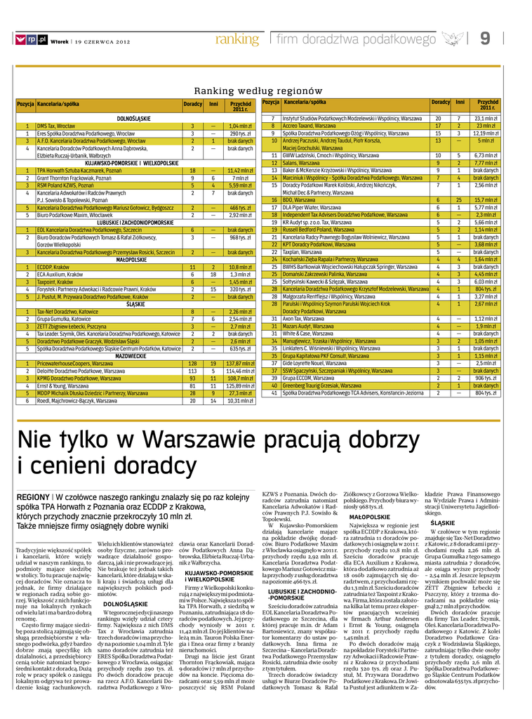 ◊ rp .pl ranking Wtorek | 19 czerwca 2012 9 firm doradztwa podatkowego Ranking według regionów Pozycja Kancelaria/spółka 1 1 3 4 1 2 3 4 5 5 1 2 3 1 2 3 4 5 1 2 3 4 5 5 1 2 3 4 5 6 DOLNOŚLĄSKIE DMS Tax, Wrocław Eres Spółka Doradztwa Podatkowego, Wrocław A.F.O. Kancelaria Doradztwa Podatkowego, Wrocław Kancelaria Doradców Podatkowych Anna Dąbrowska, Elżbieta Ruczaj-Urbanik, Wałbrzych KUJAWSKO-POMORSKIE I WIELKOPOLSKIE TPA Horwath Sztuba Kaczmarek, Poznań Grant Thornton Frąckowiak, Poznań RSM Poland KZWS, Poznań Kancelaria Adwokatów i Radców Prawnych P.J. Sowisło & Topolewski, Poznań Kancelaria Doradztwa Podatkowego Mariusz Gotowicz, Bydgoszcz Biuro Podatkowe Maxim, Włocławek LUBUSKIE I ZACHODNIOPOMORSKIE EOL Kancelaria Doradztwa Podatkowego, Szczecin Biuro Doradców Podatkowych Tomasz & Rafał Ziółkowscy, Gorzów Wielkopolski Kancelaria Doradztwa Podatkowego Przemysław Rosicki, Szczecin MAŁOPOLSKIE ECDDP, Kraków ECA Auxilium, Kraków Taxpoint, Kraków Forystek i Partnerzy Adwokaci i Radcowie Prawni, Kraków J. Pustuł, M. Przywara Doradztwo Podatkowe, Kraków ŚLĄSKIE Tax-Net Doradztwo, Katowice Grupa Gumułka, Katowice ZETT Zbigniew Łebecki, Pszczyna Tax Leader. Szymik, Oleś. Kancelaria Doradztwa Podatkowego, Katowice Doradztwo Podatkowe Graczyk, Wodzisław Śląski Spółka Doradztwa Podatkowego Śląskie Centrum Podatków, Katowice MAZOWIECKIE PricewaterhouseCoopers, Warszawa Deloitte Doradztwo Podatkowe, Warszawa KPMG Doradztwo Podatkowe, Warszawa Ernst & Young, Warszawa MDDP Michalik Dłuska Dziedzic i Partnerzy, Warszawa Roedl, Majchrowicz-Bączyk, Warszawa Doradcy Inni Przychód 2011 r. 3 3 2 2 — — 1 — 1,04 mln zł 290 tys. zł brak danych brak danych 18 9 5 2 — 6 4 7 11,42 mln zł 7 mln zł 5,59 mln zł brak danych 2 2 — — 466 tys. zł 2,92 mln zł 6 3 — — brak danych 968 tys. zł 2 — brak danych 11 6 6 2 2 2 18 — 15 — 10,8 mln zł 1,3 mln zł 1,45 mln zł 320 tys. zł brak danych 8 7 3 2 2 2 — 6 — 2 — — 2,26 mln zł 2,54 mln zł 2,7 mln zł brak danych 2,6 mln zł 635 tys. zł 128 113 93 81 28 20 19 5 11 11 9 14 137,87 mln zł 114,46 mln zł 108,7 mln zł 125,89 mln zł 27,3 mln zł 10,31 mln zł Pozycja Kancelaria/spółka 7 8 9 10 11 12 13 14 15 16 17 18 19 19 21 22 22 24 25 25 25 28 28 28 31 31 31 34 35 35 37 37 39 40 41 Doradcy Inni Instytut Studiów Podatkowych Modzelewski i Wspólnicy, Warszawa Accreo Taxand, Warszawa Spółka Doradztwa Podatkowego Ożóg i Wspólnicy, Warszawa Andrzej Paczuski, Andrzej Taudul, Piotr Korszla, Maciej Grochulski, Warszawa GWW Ladziński, Cmoch i Wspólnicy, Warszawa Salans, Warszawa Baker & McKenzie Krzyżowski i Wspólnicy, Warszawa Marciniuk i Wspólnicy – Spółka Doradztwa Podatkowego, Warszawa Doradcy Podatkowi Marek Kolibski, Andrzej Nikończyk, Michał Dec & Partnerzy, Warszawa BDO, Warszawa DLA Piper Wiater, Warszawa Independent Tax Advisers Doradztwo Podatkowe, Warszawa KR Audyt sp. z o.o. Tax, Warszawa Russell Bedford Poland, Warszawa Kancelaria Radcy Prawnego Bogusław Wolniewicz, Warszawa KPT Doradcy Podatkowi, Warszawa Taxplan, Warszawa Kochański Zięba Rapala i Partnerzy, Warszawa BWHS Bartkowiak Wojciechowski Hałupczak Springer, Warszawa Domański Zakrzewski Palinka, Warszawa Sołtysiński Kawecki & Szlęzak, Warszawa Kancelaria Doradztwa Podatkowego Krzysztof Modzelewski, Warszawa Małgorzata Rentflejsz i Wspólnicy, Warszawa Parulski i Wspólnicy Szymon Parulski Wojciech Krok Doradcy Podatkowi, Warszawa Axon Tax, Warszawa Mazars Audyt, Warszawa White & Case, Warszawa Manugiewicz, Trzaska i Wspólnicy , Warszawa Linklaters C. Wiśniewski i Wspólnicy, Warszawa Grupa Kapitałowa PKF Consult, Warszawa Gide Loyrette Nouel, Warszawa SSW Spaczyński, Szczepaniak i Wspólnicy, Warszawa Grupa ECCOM, Warszawa Greenberg Traurig Grzesiak, Warszawa Spółka Doradztwa Podatkowego TCA Advisers, Konstancin-Jeziorna Przychód 2011 r. 20 17 15 13 7 2 3 — 23,1 mln zł 23 mln zł 12,19 mln zł 5 mln zł 10 9 9 7 7 5 2 1 4 1 6,73 mln zł 7,77 mln zł brak danych brak danych 2,56 mln zł 6 6 6 5 5 5 5 5 4 4 4 4 4 4 4 25 1 — 2 2 1 — — 4 3 3 3 1 1 1 15,7 mln zł 5,77 mln zł 2,3 mln zł 5,66 mln zł 1,14 mln zł brak danych 3,68 mln zł brak danych 1,64 mln zł brak danych 4,45 mln zł 6,03 mln zł 804 tys. zł 3,27 mln zł 2,67 mln zł 4 4 4 3 3 3 3 3 2 2 2 — — — 2 1 1 — — 2 1 — 1,12 mln zł 1,9 mln zł brak danych 1,05 mln zł brak danych 1,15 mln zł 2,5 mln zł brak danych 906 tys. zł brak danych 804 tys. zł Nie tylko w Warszawie pracują dobrzy i cenieni doradcy REGIONY | W czołówce naszego rankingu znalazły się po raz kolejny spółka TPA Horwath z Poznania oraz ECDDP z Krakowa, których przychody znacznie przekroczyły 10 mln zł. Także mniejsze firmy osiągnęły dobre wyniki Tradycyjnie większość spółek i kancelarii, które wzięły udział w naszym rankingu, to podmioty mające siedzibę w stolicy. To tu pracuje najwięcej doradców. Nie oznacza to jednak, że firmy działające w regionach radzą sobie gorzej. Większość z nich funkcjonuje na lokalnych rynkach od wielu lat i ma bardzo dobrą renomę. Często firmy mające siedzibę poza stolicą zajmują się obsługą przedsiębiorstw z własnego podwórka, gdyż bardzo dobrze znają specyfikę ich działalności, a przedsiębiorcy cenią sobie natomiast bezpośredni kontakt z doradcą. Dużą rolę w pracy spółek o zasięgu lokalnym odgrywa też prowadzenie ksiąg rachunkowych. Wielu ich klientów stanowią też osoby fizyczne, zarówno prowadzące działalność gospodarczą, jak i nie prowadzące jej. Nie brakuje też jednak takich kancelarii, które działają w skali kraju i świadczą usługi dla największych polskich podmiotów. DOLNOŚLĄSKIE W tegorocznej edycji naszego rankingu wzięły udział cztery firmy. Największa z nich DMS Tax z Wrocławia zatrudnia trzech doradców i ma przychody na poziomie 1,04 mln zł. Tyle samo doradców zatrudnia też ERES Spółka Doradztwa 