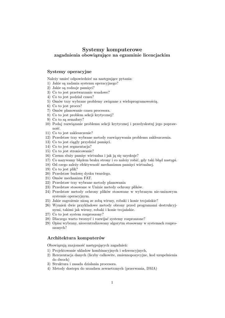 Systemy komputerowe zagadnienia obowiązujące na egzaminie licencjackim Systemy operacyjne Należy umieć odpowiedzieć na następujące pytania: 1) Jakie są zadania systemu operacyjnego? 2) Jakie są rodzaje pamięci? 3) Co to jest przetwarzanie wsadowe? 4) Co to jest podział czasu? 5) Omów trzy wybrane problemy związane z wieloprogramowością. 6) Co to jest proces? 7) Omów planowanie czasu procesora. 8) Co to jest problem sekcji krytycznej? 9) Co to są semafory? 10) Podaj rozwiązanie problemu sekcji krytycznej i przedyskutuj jego poprawność. 11) Co to jest zakleszczenie? 12) Przedstaw trzy wybrane metody rozwiązywania problemu zakleszczenia. 13) Co to jest ciągły przydział pamięci. 14) Co to jest segmentacja? 15) Co to jest stronicowanie? 16) Czemu służy pamięc wirtualna i jak ją się uzyskuje? 17) Co nazywamy błędem braku strony i co należy robić, gdy taki błąd nastąpi. 18) Od czego zależy efektywność mechanizmu pamięci wirtualnej. 19) Co to jest plik? 20) Przedstaw budowę dysku twardego. 21) Omów mechanizm FAT. 22) Przedstaw trzy wybrane metody planowania 23) Przedstaw stosowane w Unixie metedy ochrony plików. 24) Przedstaw metody ochrony plików stosowane w wybranym nie-unixowym systemie operacyjnym. 25) Jakie zagrożenie niosą ze zobą wirusy, robaki i konie trojańskie? 26) Wymień dwie przykładowe metody obrony przed programami destrukcyjnymi, takimi jak wirusy, robaki i konie trojańskie. 27) Co to jest system rozproszony? 28) Dlaczego warto tworzyć i rozwijać systemy rozproszone? 29) Opisz wybrany, niescentralizowany algorytm stosowany w systemach rozproszonych? Architektura komputerów Obowiązują znajomość następujących zagadnień: 1) Projektowanie ukladow kombinacyjnych i sekwencyjnych, 2) Rerezentacja danych (liczby calkowite, zmiennopozycyjne, kod uzupelnienia do dwoch) 3) Struktura i zasada dzialania procesora. 4) Metody dostepu do urzadzen zewnetrznych (przerwania, DMA) 1 5) Pamiec podreczna (CASH) 6) Pamiec wirtualna (stronicowanie,układy zarzadzania pamiecia - MMU, TLB) 7) Klasyfikacja systemow wieloprocesorowych (SIMD, MIMD) i topologie polaczeń (w tym hiperkostki, mesh, shuffle-exchange, butterfly)) Sieci komputerowe I) Modele, podziały na warstwy a) Opisz model ISO/OSI. Wskaż wady i zalety tego standardu. Jaki ma wpływ na projektowanie zasad komunikacji w sieci? b) Jakie znasz media transmisji w sieciach komputerowych? Jakie charakterystyki reprezentują (przepustowość, opóźnienia,...)? Jaki wpływ mają te parametry na projektowanie protokołów wyższych warstw? c) Wskaż jakie zależności łączą drugą, trzecią i czwartą warstwę modelu OSI? W jaki sposób zmiany w jednej z warstw wpływają na pozostałe? II) Protokoły komunikacyjne a) Krótko opisz protokół warstwy sieciowej popularny w sieci Internet. Jakie mechanizmy umożliwiają dostarczanie informacji pomiędzy komputerami? Czy protokół ten zapewnia, że dane zostaną dostarczone do odbiorcy w niezmienionej postaci? b) Opisz zasady i sposoby adresowania w protokole IP. Jak są przypisywane takie adresy? Czy jest możliwe dostarczanie informacji do wielu użytkowników jednocześnie? Jakie problemy z adresami występują obecnie i jakie są próby temu zaradzenia? c) Jakie protokoły umożliwiają niezawodne dostarczanie informacji? Jak to jest realizowane? d) Opisz mechanizmy umożliwiające komunikację protokołu IP między komputerami z różnych sieci fizycznych? e) Jakie są możliwości zawiadamiania nadawców o problemach w trakcie dostarczania informacji w sieci komputerowej? Jaki te protokoły mają wpływ na ruch w sieci? III) Usługi a) Duża część usług w sieci oparta jest na modelu klient-serwer. Opisz ten model i procedury jakie muszą wykonać obie strony aby nawiązać komunikację. b) Opisz zasadę działania usługi FTP. Ile połączeń otwiera serwer i w jakim celu? Jaki to ma wpływ na ruch w sieci i szybkość transmisji? c) W jaki sposób można zapewnić użytkownikom serwisu WWW dostęp do ciągle aktualnych danych? Opisz przykładowe działające rozwiązanie. d) Czy cały program uruchamiany w środowisku sieciowym musi wykonywać się na jednym komputerze? Podaj i opisz inne możliwości. e) Jakie są możliwości zdalnego zarządzania urządzeniami w sieci? W jaki sposób można przekazywać parametry konfiguracyjne dla komputerów bezdyskowych? Jak odbywa się ta komunikacja. f) W jaki sposób dostarczany jest list poczty elektronicznej? Co się dzieje podczas transmisji z załączonym do niego plikiem binarnym? IV) Bezpieczeństwo 2 a) Jakie korzyści i zagrożenia niesie ze sobą możliwość wykonywania apletów Javy ze stron WWW w sieci Internet? Jakie mechanizmy muszą być wbudowane w przeglądarkę aby zapewnić minimum bezpieczeństwa? b) Do czego służą Firewalle ściany ogniowe? Jakie reguły filtrowania zaproponował byś dla udostępnienia możliwości przeglądania stron WWW w Internecie z sieci prywatnej? c) Jakie są możliwości zdalnego sprawdzenia stanu bezpieczeństwa sieci? Czy takie testy wystarczą? d) Czy uruchomienie Firewalla w sieci zapewni jej pełne bezpieczeństwo? Jakie są inne mechanizmy zwiększające bezpieczeństwo? 3
