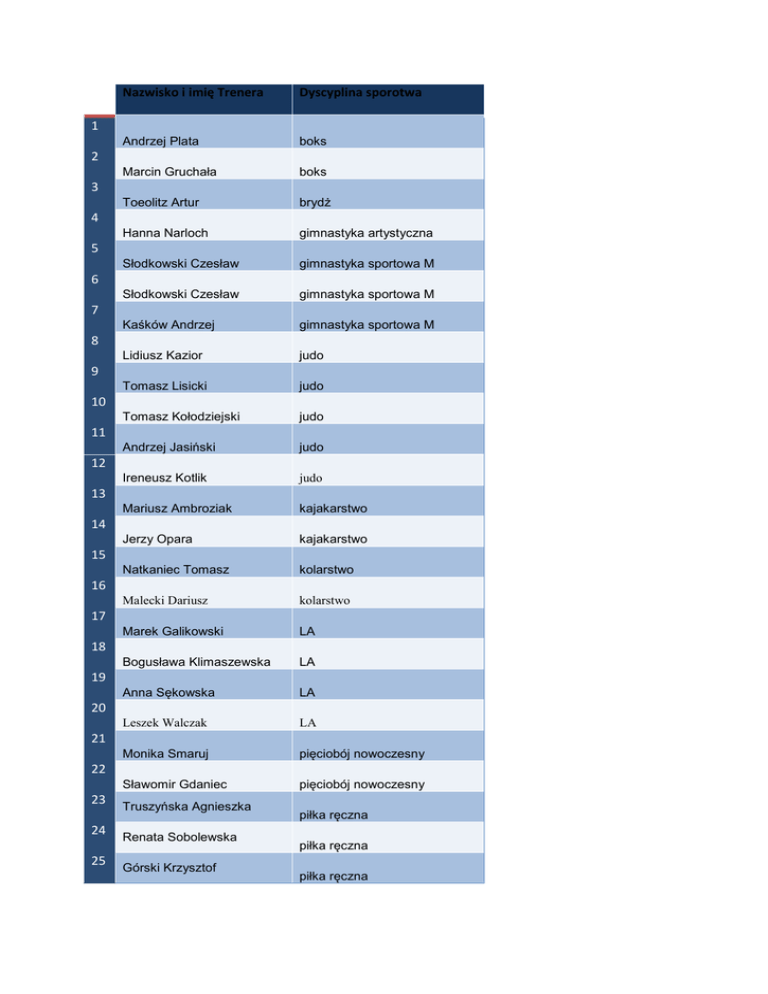 Nazwisko i imię Trenera Dyscyplina sporotwa Andrzej Plata boks Marcin Gruchała boks Toeolitz Artur brydż Hanna Narloch gimnastyka artystyczna Słodkowski Czesław gimnastyka sportowa M Słodkowski Czesław gimnastyka sportowa M Kaśków Andrzej gimnastyka sportowa M Lidiusz Kazior judo Tomasz Lisicki judo Tomasz Kołodziejski judo Andrzej Jasiński judo Ireneusz Kotlik judo Mariusz Ambroziak kajakarstwo Jerzy Opara kajakarstwo Natkaniec Tomasz kolarstwo Malecki Dariusz kolarstwo Marek Galikowski LA Bogusława Klimaszewska LA Anna Sękowska LA Leszek Walczak LA Monika Smaruj pięciobój nowoczesny Sławomir Gdaniec pięciobój nowoczesny 1 2 3 4 5 6 7 8 9 10 11 12 13 14 15 16 17 18 19 20 21 22 23 24 25 Truszyńska Agnieszka Renata Sobolewska Górski Krzysztof piłka ręczna piłka ręczna piłka ręczna 26 27 28 29 30 31 Kupc Mariusz Ringwelska Anna Truszyńska Agnieszka Górski Krzysztof Artur Wierzbicki Ringwelska Anna piłka ręczna piłka ręczna piłka ręczna piłka ręczna piłka ręczna piłka ręczna 32 Mikołajczak Mateusz piłka siatkowa Herrmann Leszek piłka-siatkowa plaz Jolanta Samulewicz strzelectwo Jędrzej Długosz szachy Krzysztof Walka szermierka Longin Szmit szermierka Krzysztof Walka szermierka Stanisław Szymański szermierka Longin Szmit szermierka drużyna Karol Skolimowski, Alan Woś tenis stołowy Józef Alijew zapasy Bartłomiej Pryczkowski zapasy Przemysław Struś żeglarstwo Seweryn Kosznik żeglarstwo Paweł Nowakowski żeglarstwo Bohdan Goralski żeglarstwo 33 34 35 36 37 38 39 40 41 42 43 44 45 46 47 48 Mirosław Laskowski 49 Seweryn Kosznik żeglarstwo żeglarstwo