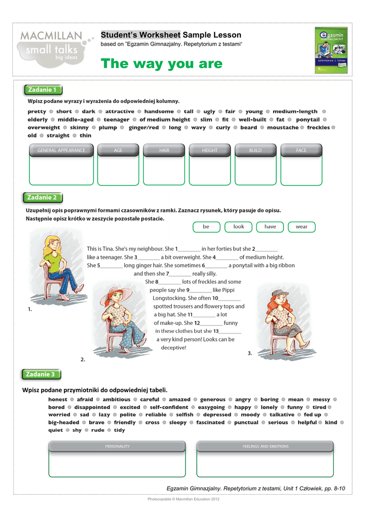 Student’s Worksheet Sample Lesson based on ”Egzamin Gimnazjalny. Repetytorium z testami” The way you are Wpisz podane przymiotniki do odpowiedniej tabeli. Egzamin Gimnazjalny. Repetytorium z testami, Unit 1 Człowiek, pp. 8-10 Photocopiable © Macmillan Education 2012 Student’s Worksheet Homework based on ”Egzamin Gimnazjalny. Repetytorium z testami” The way you are Egzamin Gimnazjalny. Repetytorium z testami, Unit 1 Człowiek, p. 14 Photocopiable © Macmillan Education 2012 Teacher’s Notes Sample Lesson based on “Egzamin Gimnazjalny. Repetytorium z testami” The way you are AIMS OF THE LESSON 1) 2) 3) Remind the students of the vocabulary connected with the topic of appearance and personality. Activate the vocabulary through a number of activities including peer testing and speaking practice. Prepare the students for a possible exam writing task, such as an e-mail or a letter describing eg. a new friend. LEAD-IN 1) Ask the students to work in pairs and make a list of features they find attractive in other people. Suggest these two categories: appearance and personality. Prepare slips of paper and ask your students to write their words and expressions there. Allow 5 minutes. 2) In the meantime draw two columns on the board corresponding to the two categories above. When the students are ready with their ideas, encourage them to come up to the board and put their ideas in the relevant columns. Ask some students for explanations as to why they have chosen certain features. VOCABULARY PRACTICE 1 1) Direct the students to Zadanie 1. Shout out the Polish equivalents and ask the students to find the English equivalents to make sure the learners know the meaning of the lexical items and/or have the chance to remind themselves. Ask them to complete Zadanie 1. 2) Ask the students to look at Zadanie 2 and underline all the vocabulary connected with appearance in the text. Put the students in pairs and ask them to tell each other to quickly draw the items eg. spotted trousers or freckles. Then get the students to complete the text. VOCABULARY PRACTICE 2 1) Direct the students to Zadanie 3. Ask the students to compare the adjectives with their own ideas on the board. Explain any vocabulary that the students may have forgotten. Ask the students to group the words accordingly. 2) When they finish, ask them to work in pairs again and test each other on the vocabulary they have just been working on. The students could just select 10 items each, and ask each other for the translation of the word/expression. SPEAKING PRACTICE 1) Ask the students in work in pairs or groups of three and describe to each other/one another a) their best friend/friends b) their favourite musicians, actors, TV personalities c) people they met during their holidays. 2) Encourage the students to use the vocabulary they were practising in class. You may ask your students to count who uses the most of the presented vocabulary. HOMEWORK Ask your students to do Zadanie 1. Encourage the students to make a list of expressions connected with one’s personality and behaviour. Go to www.macmillan.pl/e-planner and prepare an effective revision plan for the gimnazjum exam! Photocopiable © Macmillan Education 2012