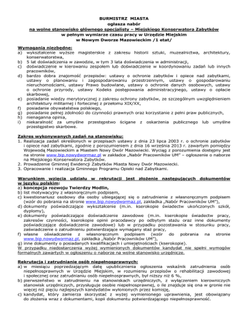 BURMISTRZ MIASTA ogłasza nabór na wolne stanowisko głównego specjalisty – Miejskiego Konserwatora Zabytków w pełnym wymiarze czasu pracy w Urzędzie Miejskim w Nowym Dworze Mazowieckim /1 etat/ Wymagania niezbędne: a) wykształcenie wyższe magisterskie z zakresu historii sztuki, muzealnictwa, architektury, konserwatorstwa, b) 5 lat doświadczenia w zawodzie, w tym 3 lata doświadczenia w administracji, c) doświadczenie w kierowaniu zespołem lub doświadczenie w koordynowaniu zadań lub innych pracowników, d) bardzo dobra znajomość przepisów: ustawy o ochronie zabytków i opiece nad zabytkami, ustawy o planowaniu i zagospodarowaniu przestrzennym, ustawy o gospodarowaniu nieruchomościami, ustawy Prawo budowlane, ustawy o ochronie danych osobowych, ustawy o ochronie przyrody, ustawy Kodeks postępowania administracyjnego, ustawy o opłacie skarbowej, e) posiadanie wiedzy merytorycznej z zakresu ochrony zabytków, ze szczególnym uwzględnieniem architektury militarnej i fortecznej z przełomu XIX/XX, f) posiadanie obywatelstwa polskiego, g) posiadanie pełnej zdolności do czynności prawnych oraz korzystanie z pełni praw publicznych, h) nienaganna opinia, i) niekaralność za umyślne przestępstwo ścigane z oskarżenia publicznego lub umyślne przestępstwo skarbowe. Zakres wykonywanych zadań na stanowisku: 1. Realizacja zadań określonych w przepisach ustawy z dnia 23 lipca 2003 r. o ochronie zabytków i opiece nad zabytkami, zgodnie z porozumieniem z dnia 16 września 2013 r. zawartym pomiędzy Wojewodą Mazowieckim a Miastem Nowy Dwór Mazowiecki. Wyciąg z porozumienia dostępny jest na stronie www.bip.nowydwormaz.pl w zakładce „Nabór Pracowników UM” – ogłoszenie o naborze na Miejskiego Konserwatora Zabytków. 2. Prowadzenie Gminnej Ewidencji Zabytków Miasta Nowy Dwór Mazowiecki. 3. Opracowanie i realizacja Gminnego Programu Opieki nad Zabytkami. Warunkiem wzięcia udziału w rekrutacji jest złożenie następujących dokumentów w języku polskim: a) koncepcja rozwoju Twierdzy Modlin, b) list motywacyjny z własnoręcznym podpisem, c) kwestionariusz osobowy dla osoby ubiegającej się o zatrudnienie z własnoręcznym podpisem (wzór do pobrania na stronie www.bip.nowydwormaz.pl, zakładka „Nabór Pracowników UM”), d) dokumenty poświadczające wykształcenie (m.in. kserokopie świadectw ukończonych szkół, dyplomy), e) dokumenty poświadczające doświadczenie zawodowe (m.in. kserokopie świadectw pracy, zakresów czynności, kserokopie opinii pracodawcy po odbytym stażu oraz inne dokumenty poświadczające doświadczenie zawodowe) lub w przypadku pozostawania w stosunku pracy, zaświadczenie o zatrudnieniu potwierdzające wymagany staż pracy, f) własne oświadczenie z własnoręcznym podpisem (wzór do pobrania na stronie www.bip.nowydwormaz.pl, zakładka „Nabór Pracowników UM”), g) inne dokumenty o posiadanych kwalifikacjach i umiejętnościach (kserokopie). W przypadku niedostarczenia wyżej wymienionych dokumentów kandydat nie spełni wymogów formalnych zawartych w ogłoszeniu o naborze na wolne stanowisko urzędnicze. Rekrutacja i zatrudnianie osób niepełnosprawnych: a) w miesiącu poprzedzającym datę upublicznienia ogłoszenia wskaźnik zatrudnienia osób niepełnosprawnych w Urzędzie Miejskim, w rozumieniu przepisów o rehabilitacji zawodowej i społecznej oraz zatrudnianiu osób niepełnosprawnych, był niższy niż 6 %, b) pierwszeństwo w zatrudnieniu na stanowiskach urzędniczych, z wyłączeniem kierowniczych stanowisk urzędniczych, przysługuje osobie niepełnosprawnej, o ile znajduje się ona w gronie nie więcej niż pięciu najlepszych kandydatów wyłonionych przez komisję, c) kandydat, który zamierza skorzystać z wyżej wymienionego uprawnienia, jest obowiązany do złożenia wraz z dokumentami, kopii dokumentu potwierdzającego niepełnosprawność. Przed podjęciem zatrudnienia wybrany kandydat ma obowiązek przedłożyć aktualne zaświadczenie z Krajowego Rejestru Karnego o niekaralności. Warunki pracy: a) praca w siedzibie Urzędu Miejskiego w Nowym Dworze Mazowieckim ul. Zakroczymska 30 i poza nią, b) wymiar czasu pracy: pełen etat, przeciętnie 40 godzin tygodniowo (w przypadku osób niepełnosprawnych, zgodnie z odrębnymi przepisami), c) umowa o pracę: pierwsza umowa o pracę zawierana jest na czas określony, a w przypadku braku zastrzeżeń po upływie tego okresu, zostanie zawarta kolejna umowa, d) budynek Urzędu nie jest wyposażony w windę ani w toalety dla osób niepełnosprawnych, w pomieszczeniach pracy wąskie przejścia i dojścia, e) specyfika pracy wymaga przemieszczania się wewnątrz budynku oraz w terenie. Wymagane dokumenty aplikacyjne należy składać w Wydziale Kadr, pokój 310, w Urzędzie Miejskim w Nowym Dworze Mazowieckim ul. Zakroczymska 30, w zamkniętych kopertach lub przesyłać na adres : Urząd Miejski w Nowym Dworze Mazowieckim ul. Zakroczymska 30 05-100 Nowy Dwór Mazowiecki z dopiskiem: „nabór na stanowisko Miejskiego Konserwatora Zabytków w Urzędzie Miejskim w Nowym Dworze Mazowieckim”, w terminie do 15.01.2014 r. w godzinach pracy Urzędu, decyduje data wpływu oferty do Urzędu (nie liczy się data stempla pocztowego). Oferty otrzymane po terminie nie będą rozpatrywane. W ofercie należy podać adres e-mail i numer telefonu. Najpóźniej do dnia 31.01.2014 r. zakwalifikowani kandydaci zostaną poinformowani mailowo bądź telefonicznie o miejscu i terminie dalszego procesu rekrutacji. Proces rekrutacji będzie składał się z: I etap – weryfikacja dokumentów kandydatów pod względem spełnienia wymagań niezbędnych. II etap – test wiedzy z zakresu ustawy o ochronie zabytków i opiece nad zabytkami, ustawy o planowaniu i zagospodarowaniu przestrzennym, ustawy o gospodarowaniu nieruchomościami, ustawy Prawo budowlane, ustawy o ochronie danych osobowych, ustawy o ochronie przyrody, ustawy Kodeks postępowania administracyjnego, ustawy o opłac