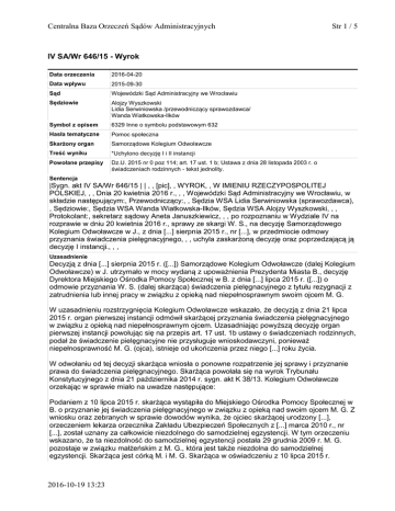 Centralna Baza Orzeczeń Sądów Administracyjnych Str 1 / 5 IV SA/Wr 646/15 - Wyrok Data orzeczenia 2016-04-20 Data wpływu 2015-09-30 Sąd Wojewódzki Sąd Administracyjny we Wrocławiu Sędziowie Alojzy Wyszkowski Lidia Serwiniowska /przewodniczący sprawozdawca/ Wanda Wiatkowska-Ilków Symbol z opisem 6329 Inne o symbolu podstawowym 632 Hasła tematyczne Pomoc społeczna Skarżony organ Samorządowe Kolegium Odwoławcze Treść wyniku *Uchylono decyzję I i II instancji Powołane przepisy Dz.U. 2015 nr 0 poz 114; art. 17 ust. 1 b; Ustawa z dnia 28 listopada 2003 r. o świadczeniach rodzinnych - tekst jednolity. Sentencja |Sygn. akt IV SA/Wr 646/15 | | , , [pic], , WYROK, , W IMIENIU RZECZYPOSPOLITEJ POLSKIEJ, , , Dnia 20 kwietnia 2016 r., , , Wojewódzki Sąd Administracyjny we Wrocławiu, w składzie następującym:, Przewodniczący:, , Sędzia WSA Lidia Serwiniowska (sprawozdawca), , Sędziowie:, Sędzia WSA Wanda Wiatkowska-Ilków, Sędzia WSA Alojzy Wyszkowski, , , Protokolant:, sekretarz sądowy Aneta Januszkiewicz, , , po rozpoznaniu w Wydziale IV na rozprawie w dniu 20 kwietnia 2016 r., sprawy ze skargi W. S., na decyzję Samorządowego Kolegium Odwoławcze w J., z dnia [...] sierpnia 2015 r., nr [...], w przedmiocie odmowy przyznania świadczenia pielęgnacyjnego, , , uchyla zaskarżoną decyzję oraz poprzedzającą ją decyzję I instancji., , , Uzasadnienie Decyzją z dnia [...] sierpnia 2015 r. ([...]) Samorządowe Kolegium Odwoławcze (dalej Kolegium Odwoławcze) w J. utrzymało w mocy wydaną z upoważnienia Prezydenta Miasta B., decyzję Dyrektora Miejskiego Ośrodka Pomocy Społecznej w B. z dnia [...] lipca 2015 r. ([...]) o odmowie przyznania W. S. (dalej skarżąca) świadczenia pielęgnacyjnego z tytułu rezygnacji z zatrudnienia lub innej pracy w związku z opieką nad niepełnosprawnym swoim ojcem M. G. W uzasadnieniu rozstrzygnięcia Kolegium Odwoławcze wskazało, że decyzją z dnia 21 lipca 2015 r. organ pierwszej instancji odmówił skarżącej przyznania świadczenia pielęgnacyjnego w związku z opieką nad niepełnosprawnym ojcem. Uzasadniając powyższą decyzję organ pierwszej instancji powołując się na przepis art. 17 ust. 1b ustawy o świadczeniach rodzinnych, podał że świadczenie pielęgnacyjne nie przysługuje wnioskodawczyni, ponieważ niepełnosprawność M. G. (ojca), istnieje od ukończenia przez niego [...] roku życia. W odwołaniu od tej decyzji skarżąca wniosła o ponowne rozpatrzenie jej sprawy i przyznanie prawa do świadczenia pielęgnacyjnego. Skarżąca powołała się na wyrok Trybunału Konstytucyjnego z dnia 21 października 2014 r. sygn. akt K 38/13. Kolegium Odwoławcze orzekając w sprawie miało na uwadze następujące: Podaniem z 10 lipca 2015 r. skarżąca wystąpiła do Miejskiego Ośrodka Pomocy Społecznej w B. o przyznanie jej świadczenia pielęgnacyjnego w związku z opieką nad swoim ojcem M. G. Z wniosku oraz zebranych w sprawie dowodów wynika, że ojciec skarżącej urodzony [...], orzeczeniem lekarza orzecznika Zakładu Ubezpieczeń Społecznych z [...] marca 2010 r., nr [...], został uznany za całkowicie niezdolnego do samodzielnej egzystencji. W tym orzeczeniu wskazano, że ta niezdolność do samodzielnej egzystencji postała 29 grudnia 2009 r. M. G. pozostaje w związku małżeńskim z M. G., która jest także niezdolna do samodzielnej egzystencji. Skarżąca jest córką M. i M. G. Skarżąca w oświadczeniu z 10 lipca 2015 r. 2016-10-19 13:23 Centralna Baza Orzeczeń Sądów Administracyjnych Str 2 / 5 oświadczyła, że sprawuje osobistą opiekę nad swoim ojcem. Na podstawie art. 17 ust. 1 ustawy z dnia 28 listopada 2003 r. o świadczeniach rodzinnych (Dz. U. z 2015 r., poz. 114 z późn. zm.), zwanej dalej ustawą, świadczenie pielęgnacyjne z tytułu rezygnacji z zatrudnienia lub innej pracy zarobkowej przysługuje: 1) matce albo ojcu, 2) opiekunowi faktycznemu dziecka, 3) osobie będącej rodziną zastępczą spokrewnioną w rozumieniu ustawy z dnia 9 czerwca 2011 r. o wspieraniu rodziny i systemie pieczy zastępczej, 4) innym osobom, na których zgodnie z przepisami ustawy z dnia 25 lutego 1964 r. - Kodeks rodzinny i opiekuńczy ciąży obowiązek alimentacyjny, z wyjątkiem osób o znacznym stopniu niepełnosprawności - jeżeli nie podejmują lub rezygnują z zatrudnienia lub innej pracy zarobkowej w celu sprawowania opieki nad osobą legitymującą się orzeczeniem o znacznym stopniu niepełnosprawności albo orzeczeniem o niepełnosprawności łącznie ze wskazaniami: konieczności stałej lub długotrwałej opieki lub pomocy innej osoby w związku ze znacznie ograniczoną możliwością samodzielnej egzystencji oraz konieczności stałego współudziału na co dzień opiekuna dziecka w procesie jego leczenia, rehabilitacji i edukacji. Jednakże w myśl art. 17 ust. 1b ustawy świadczenie pielęgnacyjne przysługuje, jeżeli niepełnosprawność osoby wymagającej opieki powstała: 1) nie później niż do ukończenia 18. roku życia lub 2) w trakcie nauki w szkole lub w szkole wyższej, jednak nie później niż do ukończenia 25 roku życia. Odnosząc ustalony w sprawie stan faktyczny do przywołanych przepisów ustawy także w ocenie organu odwoławczego skarżącej nie przysługuje prawo do świadczenia pielęgnacyjnego. W pierwszej kolejności wskazać należy, że wnioskodawczyni jest z M. G. spokrewniona w pierwszym stopniu (jest jego córką). Nie jest też kwestionowane, że wymaga on konieczności stałej lub długotrwałej opieki lub pomocy innej osoby w związku z niezdolnością do samodzielnej egzystencji. Nie jest też sporne, że wnioskodawczyni sprawuje opiekę nad ojcem. Jednakże przeszkodą do przyznania prawa do świadczenia pielęgnacyjnego jest fakt, iż niepełnosprawność M. powstała po upływie okresów wymienionych w art. 17 ust. 1b ustawy, bo powstała w jego [...] roku życia (wynika to z orzeczenia o jego niezdolności do samodzielnej egzystencji). Wniosko