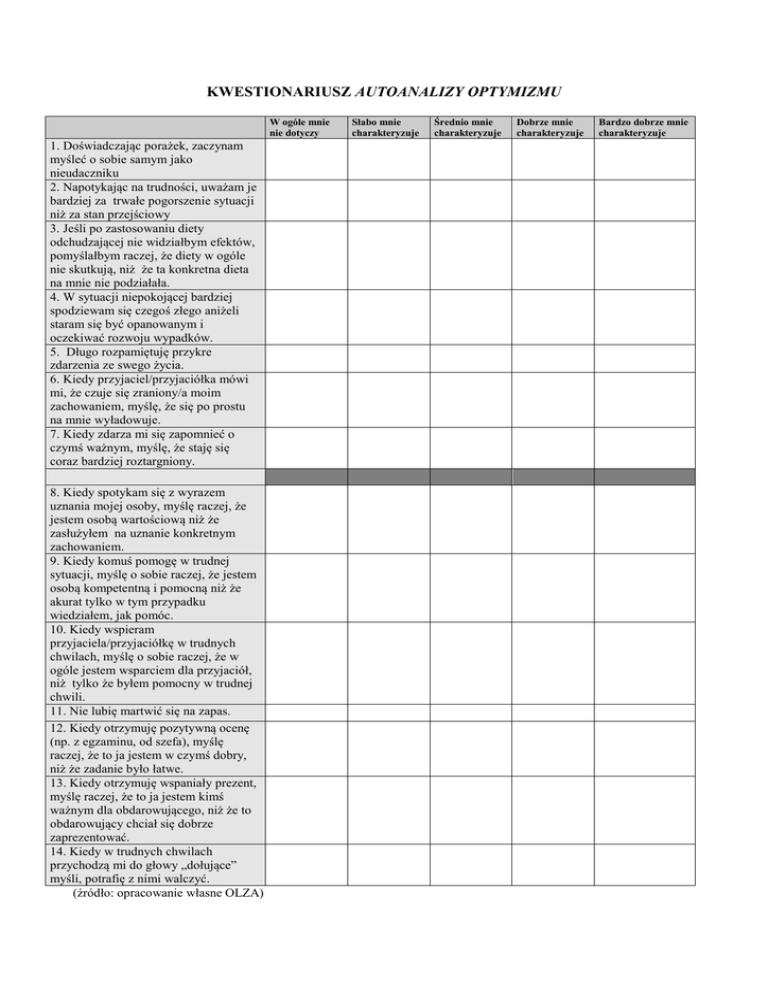 KWESTIONARIUSZ AUTOANALIZY OPTYMIZMU W ogóle mnie nie dotyczy 1. Doświadczając porażek, zaczynam myśleć o sobie samym jako nieudaczniku 2. Napotykając na trudności, uważam je bardziej za trwałe pogorszenie sytuacji niż za stan przejściowy 3. Jeśli po zastosowaniu diety odchudzającej nie widziałbym efektów, pomyślałbym raczej, że diety w ogóle nie skutkują, niż że ta konkretna dieta na mnie nie podziałała. 4. W sytuacji niepokojącej bardziej spodziewam się czegoś złego aniżeli staram się być opanowanym i oczekiwać rozwoju wypadków. 5. Długo rozpamiętuję przykre zdarzenia ze swego życia. 6. Kiedy przyjaciel/przyjaciółka mówi mi, że czuje się zraniony/a moim zachowaniem, myślę, że się po prostu na mnie wyładowuje. 7. Kiedy zdarza mi się zapomnieć o czymś ważnym, myślę, że staję się coraz bardziej roztargniony. 8. Kiedy spotykam się z wyrazem uznania mojej osoby, myślę raczej, że jestem osobą wartościową niż że zasłużyłem na uznanie konkretnym zachowaniem. 9. Kiedy komuś pomogę w trudnej sytuacji, myślę o sobie raczej, że jestem osobą kompetentną i pomocną niż że akurat tylko w tym przypadku wiedziałem, jak pomóc. 10. Kiedy wspieram przyjaciela/przyjaciółkę w trudnych chwilach, myślę o sobie raczej, że w ogóle jestem wsparciem dla przyjaciół, niż tylko że byłem pomocny w trudnej chwili. 11. Nie lubię martwić się na zapas. 12. Kiedy otrzymuję pozytywną ocenę (np. z egzaminu, od szefa), myślę raczej, że to ja jestem w czymś dobry, niż że zadanie było łatwe. 13. Kiedy otrzymuję wspaniały prezent, myślę raczej, że to ja jestem kimś ważnym dla obdarowującego, niż że to obdarowujący chciał się dobrze zaprezentować. 14. Kiedy w trudnych chwilach przychodzą mi do głowy „dołujące” myśli, potrafię z nimi walczyć. (źródło: opracowanie własne OLZA) Słabo mnie charakteryzuje Średnio mnie charakteryzuje Dobrze mnie charakteryzuje Bardzo dobrze mnie charakteryzuje Po wypełnieniu kwestionariusza połącz ciągłą wszystkie znaki „x” oznaczające poszczególne odpowiedzi: w pierwszej części kwestionariusza (pytania: 1 – 7) i oddzielnie w drugiej części kwestionariusza (pytania: 8 – 14). W efekcie uzyskasz dwa wykresy oddające przekrojowy wizerunek Twojej postawy pesymistycznej / optymistycznej. Optymiści udzielają zwykle odpowiedzi, które: − w przypadku pytań 1 – 7 koncentrują się w lewej części kwestionariusza, − w przypadku pytań 8 – 14 są skoncentrowane po prawej stronie.
