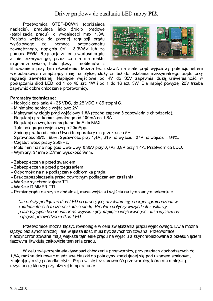 Driver prądowy do zasilania LED mocy PI2. Przetwornica STEP-DOWN (obniżająca napięcie), pracująca jako źródło prądowe (stabilizacja prądu), o wydajności max 1.8A. Posiada wejście do płynnej regulacji prądu wyjściowego za pomocą potencjometru zewnętrznego, napięcia 0V - 3,3V/5V lub za pomocą PWM. Regulacja zmienia wartość prądu a nie przerywa go, przez co nie ma efektu migotania światła, bólu głowy i problemów z filmowaniem przy tym oświetleniu. Można też ustawić na stałe prąd wyjściowy potencjometrem wieloobrotowym znajdującym się na płytce, służy on też do ustalania maksymalnego prądu przy regulacji zewnętrznej. Napięcie wejściowe od 4V do 35V zapewnia dużą uniwersalność w podłączaniu diod LED, od 1 do 40 szt. 1W i od 1 do 16 szt. 3W. Dla napięć powyżej 28V trzeba zapewnić dobre chłodzenie przetwornicy. Parametry techniczne: - Napięcie zasilania 4 - 35 VDC, do 28 VDC > 85 stopni C. - Minimalne napięcie wyjściowe 2V. - Maksymalny ciągły prąd wyjściowy 1.8A (trzeba zapewnić odpowiednie chłodzenie). - Regulacja prądu maksymalnego od 100mA do 1,8A - Regulacja zewnętrzna prądu od 0mA do MAX. - Tętnienia prądu wyjściowego 20mApp. - Zmiany prądu od zmian Uwe i temperatury nie przekracza 5%. - Sprawność 85% - 95%. Sprawność przy 1,4A , 21V na wyjściu i 27V na wejściu – 94%. - Częstotliwość pracy 250kHz. - Małe minimalne napięcie Uwe-Uwy, 0,35V przy 0,7A i 0,9V przy 1,4A. Przetwornica LDO. - Wymiary: 34mm x 27mm wysokość 9mm. - Zabezpieczenie przed zwarciem. - Zabezpieczenie przed przegrzaniem. - Odporność na nie podłączenie odbiornika prądu. - Brak zabezpieczenia przed odwrotnym podłączeniem zasilania!. - Wejście synchronizujące TTL. - Wejście DIMMER TTL . - Pomiar prądu na szynie dodatniej, masa wejścia i wyjścia na tym samym potencjale. Nie należy podłączać diod LED do pracującej przetwornicy, energia zgromadzona w kondensatorach może uszkodzić diodę. Problem dotyczy wszystkich zasilaczy posiadających kondensator na wyjściu i gdy napięcie wejściowe jest dużo wyższe od napięcia przewodzenia diod LED. Przetwornice można łączyć równolegle w celu zwiększenia prądu wyjściowego. Dwie można łączyć bez synchronizacji, ale większa ilość musi być zsynchronizowana. Przetwornice niezsynchronizowane mają większe tętnienie prądu na wyjściu a zsynchronizowane z przesunięciem fazowym likwidują całkowicie tętnienia prądu. W celu zwiększenia efektywności chłodzenia przetwornicy, przy prądach dochodzących do 1,8A, można dolutować miedziane blaszki do pola cyny znajdującej się pod układem scalonym, znajdującym się pośrodku płytki. Poprawi się też sprawność przetwornicy, która ma mniejszą rezystancję kluczy przy niższej temperaturze. 9.03.2010 1 Sposoby podłączenia przetwornicy. 1. Sterowanie potencjometrem zewnętrznym. Elementy R1, C1 i C2 muszą być bezpośrednio przy przetwornicy. Kondensator C1 jest potrzebny gdy indukują się zakłócenia 50Hz w przewodzie sterującym, powodujące migotanie diod LED. Szybkość rozjaśniania światła przy włączaniu jest uzależniona od wartości R1 i C1, czym większe tym dłużej trwa rozjaśnianie. Prąd Imax ustawia się potencjometrem na płytce (niebieski prostokąt). 2. Sterowanie PWM lub napięciem zewnętrznym. Elementy R1 i C1 muszą być bezpośrednio przy przetwornicy. Potrzebne są do filtrowania PWM jak i do likwidowania stanów nieustalonych przy włączaniu zasilania i likwidowania zakłóceń indukowanych w przewodach sterujących. Wartość ich wpływa na szybkość reakcji przetwornicy od zmian wypełnienia PWM lub napięcia sterującego. Prąd Imax ustawia się potencjometrem na płytce (niebieski prostokąt). 3. Bez sterowania zewnętrznego. Szybkość rozjaśniania światła przy włączaniu jest uzależniona od wartości R1 i C1, czym większe tym dłużej trwa rozjaśnianie. Dodatkowo likwidują stany nieustalone przy włączaniu zasilania. Prąd diod LED ustawia się potencjometrem na płytce (niebieski prostokąt). Ile i jak można podłączyć diody LED. Do przetwornicy można podłączyć od 1 do 8 diod w szeregu. Ilość połączonych równolegle zależy od prądu jaki ma płynąć przez jedną LED, np. przy 350mA można połączyć max 1,8A / 0,35A = 5,14 czyli 5, co daje razem 8 w szeregu x 5 równolegle = 40 diod 1W. Przy takiej ilości diod przetwornica musi być dobrze chłodzona i zasilana z 30V. Obok na schemacie jest kilka przykładów połączenia diod LED. Sprawność przetwornicy jest wyższa dla wyższych napięć i mniejszego prądu, więc w miarę możliwości opłaca się łączyć diody w szereg a nie równolegle, o ile napięcie zasilające na to pozwoli. 9.03.2010 2
