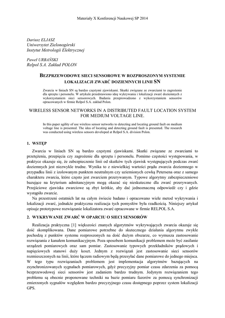 Materiały X Konferencji Naukowej SP 2014 Dariusz ELJASZ Uniwersytet Zielonogórski Instytut Metrologii Elektrycznej Paweł URBAŃSKI Relpol S.A. Zakład POLON BEZPRZEWODOWE SIECI SENSOROWE W ROZPROSZONYM SYSTEMIE LOKALIZACJI ZWARĆ DOZIEMNYCH LINII SN Zwarcia w liniach SN są bardzo częstymi zjawiskami. Skutki związane ze zwarciami to zagrożenie dla sprzętu i personelu. W artykule przedstawiono ideę wykrywania i lokalizacji zwarć doziemnych z wykorzystaniem sieci sensorowych. Badania przeprowadzono z wykorzystaniem sensorów opracowanych w firmie Relpol S.A. zakład Polon. WIRELESS SENSOR NETWORKS IN A DISTRIBUTED FAULT LOCATION SYSTEM FOR MEDIUM VOLTAGE LINE. In this paper agility of use wireless sensor networks to detecting and locating ground fault on medium voltage line is presented. The idea of locating and detecting ground fault is presented. The research was conducted using wireless sensors developed at Relpol S.A. division Polon. 1. WSTĘP Zwarcia w liniach SN są bardzo częstymi zjawiskami. Skutki związane ze zwarciami to przetężenia, przepięcia czy zagrożenie dla sprzętu i personelu. Pomimo częstości występowania, w praktyce okazuje się, że zabezpieczenie linii od skutków tych zjawisk występujących podczas zwarć doziemnych jest niezwykle trudne. Wynika to z niewielkiej wartości prądu zwarcia doziemnego w przypadku linii z izolowanym punktem neutralnym czy uziemionych cewką Petersena oraz z samego charakteru zwarcia, które często jest zwarciem przerywanym. Typowe algorytmy zabezpieczeniowe bazujące na kryterium admitancyjnym mogą okazać się nieskuteczne dla zwarć przerywanych. Przejściowe zjawiska zwarciowe są zbyt krótkie, aby dać jednoznaczną odpowiedź czy i gdzie wystąpiło zwarcie. Na przestrzeni ostatnich lat na całym świecie badano i opracowano wiele metod wykrywania i lokalizacji zwarć, jednakże praktyczna realizacja tych pomysłów była rzadkością. Niniejszy artykuł opisuje prototypowe rozwiązanie lokalizatora zwarć opracowane w firmie RELPOL S.A. 2. WYKRYWANIE ZWARĆ W OPARCIU O SIECI SENSORÓW Realizacja praktyczna [1] większości znanych algorytmów wykrywających zwarcia okazuje się dość skomplikowana. Dane pomiarowe potrzebne do skutecznego działania algorytmu zwykle pochodzą z punktów systemu rozproszonych na dość dużym obszarze, co wymusza zastosowanie rozwiązania z kanałem komunikacyjnym. Poza sposobem komunikacji problemem może być zasilanie urządzeń pomiarowych oraz sam pomiar. Zastosowanie typowych przekładników prądowych i napięciowych stanowi duży koszt. Jednym z rozwiązań jest zastosowanie sieci sensorów rozmieszczonych na linii, które łączem radiowym będą przesyłać dane pomiarowe do jednego miejsca. W tego typu rozwiązaniach problemem jest implementacja algorytmów bazujących na zsynchronizowanych sygnałach pomiarowych, gdyż precyzyjny pomiar czasu zdarzenia za pomocą bezprzewodowej sieci sensorów jest zadaniem bardzo trudnym. Jedynym rozwiązaniem tego problemu są obecnie proponowane techniki na bazie pomiaru fazorów za pomocą synchronizacji zmierzonych sygnałów względem bardzo precyzyjnego czasu dostępnego poprzez system lokalizacji GPS. 2 Dariusz Eljasz, Paweł Urbański ______________________________________________________________________________________ Alternatywnie rozważanie są również techniki bazujące na pomiarach niezsynchronizowanych. Najczęściej opierają się one na pomiarach prądów fazowych lub na pomiarze prądu I0 i późniejszej analizie zmierzonych wartości. Na tej metodzie bazuje rozwiązanie opracowane w firmie RELPOL S.A. zakład Polon. Jako kryterium wykrywania zwarcia przyjęta została wartość prądu I0, która będzie narastać wraz z kierunkiem przepływu prądu pojemnościowego od linii zdrowych do miejsca uszkodzenia. Za miejscem uszkodzenia prąd będzie miał bardzo małą wartość. Na rysunku 1 przedstawiono ideę detekcji i lokalizacji zwarć za pomocą sensorów firmy RELPOL. Czarne prostokąty symbolicznie przedstawiają sensory prądu I0 rozmieszczone wzdłuż linii. Zdrowe odpływy A i B zasilają prądem pojemnościowym zwarty do ziemi odpływ C. Za miejscem zwarcia prąd pojemnościowy ma znacząco mniejszą wartość. Sensory przesyłają dane pomiarowe do koncentratora, który przesyła informację o zwarciu do użytkownika. Rys. 1 Idea detekcji i lokalizacji zwarcia doziemnego. Fig. 1 The idea of the ground fault detection and location. 3. BADANIE PROTOTYPOWEJ SIECI SENSOROWEJ Węzły systemu są kolejną wersją modułów opracowanych w 2010 roku [1]. W porównaniu do poprzedniej wersji zmianie uległ układ radiowy na produkt firmy Radiocrafts [2], co umożliwiło przede wszystkim miniaturyzację węzła oraz polepszenie właściwości propagacyjnych sygnału radiowego. Prototypowy węzeł systemu przedstawiono na rys. 2. Rys. 2 Prototypowy węzeł detekcji zwarcia doziemnego. Fig. 2 The prototype node for the ground fault detection. Dzięki oprogramowaniu TinyMesh [2] umieszczonym w układzie radiowym, sieć sensorów posiada funkcję samo konfiguracji, a węzły mogą pełnić funkcję ruterów. Oznacza to, że użytkownik nie musi znać topologii sieci, aby przesłać informacje z/do dowolnego węzła. Podobnie jest z dołożeniem kolejnego węzła. Można to zrobić w każdym miejscu sieci, co czyni nowe rozwiązanie zdecydowanie bardziej skalowalnym i wszechstronnym od wersji poprzedniej. Docelowo moduły wykrywające zwarcie doziemne mają być rozlokowane wzdłuż linii SN co ok. 3 km (zależnie od ukształtowania terenu i roślinności), lecz rzeczywisty zasięg transmisji został dobrany tak, aby był co najmniej 2-krotnie większy. Dzięki temu występują połączenia redundantne, co podnosi niezawodność działania sieci. Droga przesyłania danych przez sieć sensorów jest podejmowana przez węzeł autonomicznie na podstawie badania jakości połączenia. Lokalizacja zwarcia odbywa się na pod