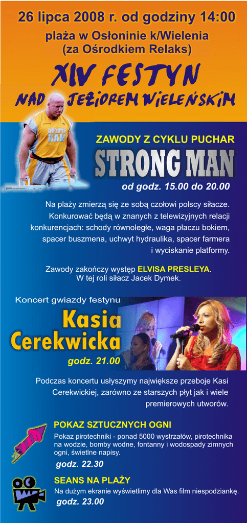 26 lipca 2008 r. od godziny 14:00 plaża w Osłoninie k/Wielenia (za Ośrodkiem Relaks) ZAWODY Z CYKLU PUCHAR od godz. 15.00 do 20.00 Na plaży zmierzą się ze sobą czołowi polscy siłacze. Konkurować będą w znanych z telewizyjnych relacji konkurencjach: schody równoległe, waga płaczu bokiem, spacer buszmena, uchwyt hydraulika, spacer farmera i wyciskanie platformy. Zawody zakończy występ ELVISA PRESLEYA. W tej roli siłacz Jacek Dymek. Koncert gwiazdy festynu godz. 21.00 Podczas koncertu usłyszymy największe przeboje Kasi Cerekwickiej, zarówno ze starszych płyt jak i wiele premierowych utworów. POKAZ SZTUCZNYCH OGNI Pokaz pirotechniki - ponad 5000 wystrzałów, pirotechnika na wodzie, bomby wodne, fontanny i wodospady zimnych ogni, świetlne napisy. godz. 22.30 SEANS NA PLAŻY Na dużym ekranie wyświetlimy dla Was film niespodziankę. godz. 23.00 ` POKAZ BREAKDANCE Pokaz tańca breakdance w wykonaniu najlepszych na świecie tancerzy: Mariusza Bromirskiego - trzykrotnego Wicemistrza Świata i Mistrza Polski oraz Pawła Orłowskiego - czterokrotnego Mistrza Świata Juniorów i Mistrza Polski Juniorów. POKAZ AKROBACJI ROWEROWEJ Pokaz akrobacji rowerowej w wykonaniu Marcina Bugajewskiego - Wicemistrza Polski w konkurencji TRIAL oraz Wicemistrza Świata w skoku przez poprzeczkę rowerem (1,28 m.) POKAZ SZTUK WALKI I AKROBATYKI Pokaz sztuki walki Capoeira w wykonaniu Janusza Cichowskiego - Mistrza Świata Capoeira. Pokazy karate i akrobacji. ATRAKCJE DLA DZIECI - WESOŁE MIASTECZKO V Maraton Pływacki o Puchar Wójta Gminy Przemęt Start maratonu z plaży w Osłoninie około godz. 14.15 [ zapisy w Urzędzie Gminy - Biuro Obsługi Klienta tel. 065 549 60 71 wew. 48, e-mail: [email protected] ] Regaty Żeglarskie o Puchar Wójta Gminy Przemęt Start z plaży w Osłoninie około godz. 10.00 [ zapisy i informacje Jacht Klub HANGAR Wieleń - tel. 605 658 005 ] Otwarte Mistrzostwa Gminy Przemęt w Siatkówce Plażowej 25.07.2008 r. [ zapisy Urząd Gminy Przemęt, tel. 065 549 60 71 wew. 48, e-mail: [email protected] ] R Z E M Ę T Piekarnia i Ciastkarnia Mochy Mariusz Placek Kamila Walkowiak ZG O P US E KR S P O N S O R Z Y Stacja Paliw NOWA WIEŚ Henryk Matuszak