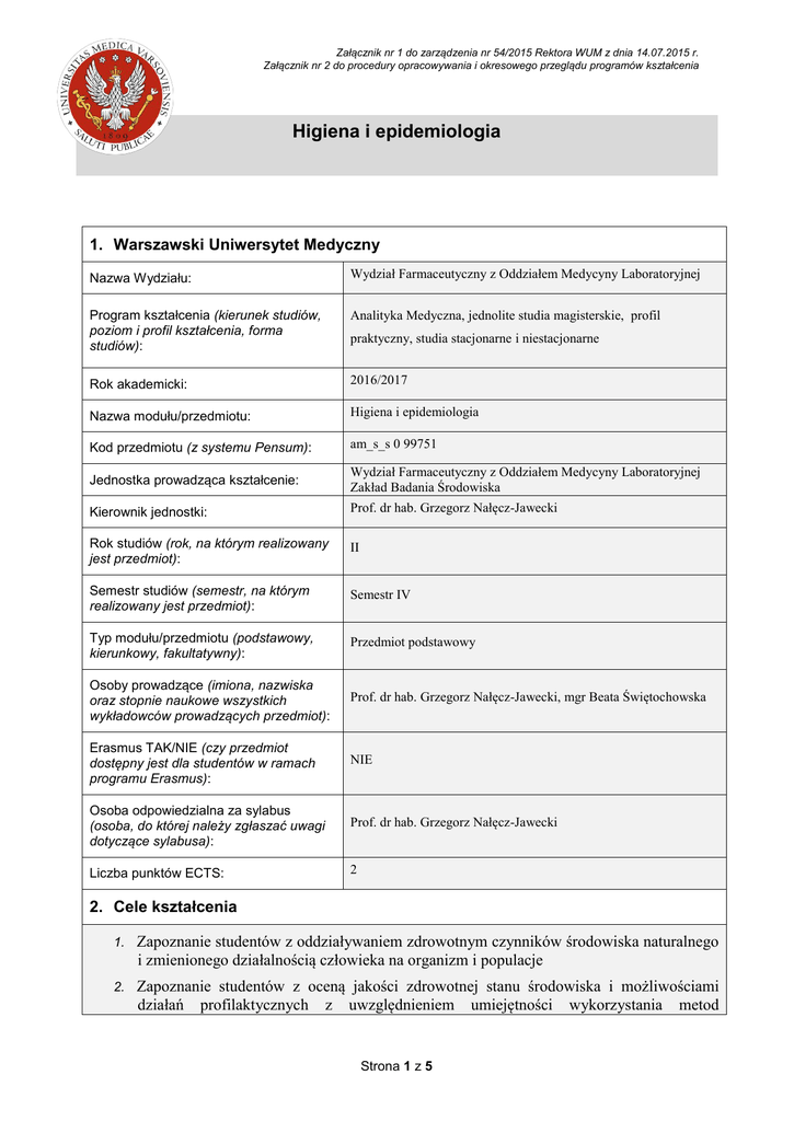 Załącznik nr 1 do zarządzenia nr 54/2015 Rektora WUM z dnia 14.07.2015 r. Załącznik nr 2 do procedury opracowywania i okresowego przeglądu programów kształcenia Higiena i epidemiologia 1. Warszawski Uniwersytet Medyczny Nazwa Wydziału: Wydział Farmaceutyczny z Oddziałem Medycyny Laboratoryjnej Program kształcenia (kierunek studiów, poziom i profil kształcenia, forma studiów): Analityka Medyczna, jednolite studia magisterskie, profil Rok akademicki: 2016/2017 Nazwa modułu/przedmiotu: Higiena i epidemiologia Kod przedmiotu (z systemu Pensum): am_s_s 0 99751 Jednostka prowadząca kształcenie: Wydział Farmaceutyczny z Oddziałem Medycyny Laboratoryjnej Zakład Badania Środowiska Kierownik jednostki: Prof. dr hab. Grzegorz Nałęcz-Jawecki Rok studiów (rok, na którym realizowany jest przedmiot): II Semestr studiów (semestr, na którym realizowany jest przedmiot): Semestr IV Typ modułu/przedmiotu (podstawowy, kierunkowy, fakultatywny): Przedmiot podstawowy Osoby prowadzące (imiona, nazwiska oraz stopnie naukowe wszystkich wykładowców prowadzących przedmiot): Prof. dr hab. Grzegorz Nałęcz-Jawecki, mgr Beata Świętochowska Erasmus TAK/NIE (czy przedmiot dostępny jest dla studentów w ramach programu Erasmus): NIE Osoba odpowiedzialna za sylabus (osoba, do której należy zgłaszać uwagi dotyczące sylabusa): Prof. dr hab. Grzegorz Nałęcz-Jawecki Liczba punktów ECTS: 2 praktyczny, studia stacjonarne i niestacjonarne 2. Cele kształcenia 1. Zapoznanie studentów z oddziaływaniem zdrowotnym czynników środowiska naturalnego i zmienionego działalnością człowieka na organizm i populacje 2. Zapoznanie studentów z oceną jakości zdrowotnej stanu środowiska i możliwościami działań profilaktycznych z uwzględnieniem umiejętności wykorzystania metod Strona 1 z 5 Załącznik nr 1 do zarządzenia nr 54/2015 Rektora WUM z dnia 14.07.2015 r. Załącznik nr 2 do procedury opracowywania i okresowego przeglądu programów kształcenia epidemiologicznych. 3. Wymagania wstępne 1. Zna podstawowe techniki chemii analitycznej 2. Zna podstawy biologii 3. Umie obsługiwać podstawową aparaturę analityczną. 4. Przedmiotowe efekty kształcenia Lista efektów kształcenia Symbol przedmiotowego efektu kształcenia K_W14 K_W30 K_W46 K_W48 K_W49 K_W50 K_U39 K_U42 K_U43 K_U44 K_U45 K_U46 K_K07 Treść przedmiotowego efektu kształcenia Odniesienie do efektu kierunkowego (numer) Zna podstawowe pojęcia i mechanizmy psychospołeczne związane ze zdrowiem i jego ochroną, w zakresie higieny Zna patogenezę, patomechanizm, epidemiologię, główne objawy kliniczne, metody diagnostyki i zasady leczenia najważniejszych chorób wywołanych przez bakterie, grzyby i wirusy. W zakresie epidemiologii zna zasady doboru, wykonywania i organizacji badań przesiewowych w profilaktyce i leczeniu. W zakresie epidemiologii FW14_K_W48. Zna zagrożenia i konsekwencje zdrowotne związane z zanieczyszczeniem środowiska naturalnego FW14_K_W49. Zna i rozumie zasady przeprowadzania i organizacji badań epidemiologicznych z udziałem ludzi, w tym badań opisowych i eksperymentalnych FW14_K_W50. Zna i rozumie zasady bezpieczeństwa i higieny w miejscu pracy Potrafi formułować i wykorzystywać wnioski z badań naukowych i własnych obserwacji FW14_K_U42. Charakteryzuje i ocenia zagrożenia związane z zanieczyszczeniem środowiska przez związki chemiczne z grupy trucizn środowiskowych FW14_K_U43. Definiuje podstawowe pojęcia z zakresu epidemiologii FW14_K_U44. Opisuje podstawowe błędy pojawiające się w badaniach epidemiologicznych FW14_K_U45. Wylicza i interpretuje wskaźniki zdrowotności populacji FW14_K_U46. Interpretuje wyniki badań epidemiologicznych Demonstruje postawę promującą zdrowie i aktywność fizyczną M2_W05 M2_W06 M2_W08 M2_W03 M2_W07 M2_W08 M2_W09 M2_W03 M2_W06 M2W03 M2_W06 M2_W03 M2_U08 M2_U02 M2_U13 M2_U03 M2_U04 M2_U08 M2_U14 M2_U14 M2_K09 5. Formy prowadzonych zajęć Forma Liczba godzin Liczba grup Wykład 10 1 Strona 2 z 5 Minimalna liczba osób w grupie Załącznik nr 1 do zarządzenia nr 54/2015 Rektora WUM z dnia 14.07.2015 r. Załącznik nr 2 do procedury opracowywania i okresowego przeglądu programów kształcenia Seminarium 0 0 Ćwiczenia 20 3-4 10 6. Tematy zajęć i treści kształcenia W1 Zadania i cele higieny i ekologii. Czynniki i elementy środowiska K_W14; K_W48 W2 Zanieczyszczenia środowiska związane z działalnością człowieka K_W48 W3 Higiena elementów środowiska (powietrza, wody, gleby) i środowiska zamieszkania K_W14 W4 Higiena środowiska pracy, w tym choroby zawodowe K_W14; K_W50 W5 Podstawy epidemiologii – planowanie i strategia badań epidemiologicznych K_W30; K_W46; K_W49 W6 Środowiskowe czynniki ryzyka chorób nowotworowych K_W48 C1 Zaprojektowanie i prezentacja badania epidemiologicznego oceniającego wpływ czynników środowiskowych i swoistych czynników etiologicznych na konkretne jednostki chorobowe. Obliczanie czułości i swoistości wartości predykcyjnych testów przesiewowych K_U39; K_U43; K_U44 C2 Zastosowanie podstawowych technik epidemiologicznych w celu wykrycia i oceny czynników ryzyka powodujących wystąpienie danej jednostki chorobowej; sposoby obliczania ryzyka względnego i przypisanego. K_U45; K_U46; C3 Badanie wybranych czynników środowiska pracy C4 Badanie wybranych czynników środowiska zamieszkania. K_U42; K_K07 K_W50; K_U42; K_K07 7. Sposoby weryfikacji efektów kształcenia Symbol przedmiotowego efektu kształcenia Symbole form prowadzonych zajęć Sposoby weryfikacji efektu kształcenia Kryterium zaliczenia K_W14 W1, W3, W4 Zaliczenie pisemne Ocena szacowana procentowo K_W30 W5 Zaliczenie pisemne Ocena szacowana procentowo K_W46 W5 Zaliczenie pisemne Ocena szacowana procentowo K_W48 W1, W2, W6 Zaliczenie pisemne Ocena szacowana procentowo K_W49 W5 Zaliczenie pisemne Ocena szacowana procentowo K_W50 W4, C3 Zaliczenie pisemne Ocena szacowana procentowo K_U39 C1 K_U42 C3, C4 K_U43 C1 Wypowiedź ust