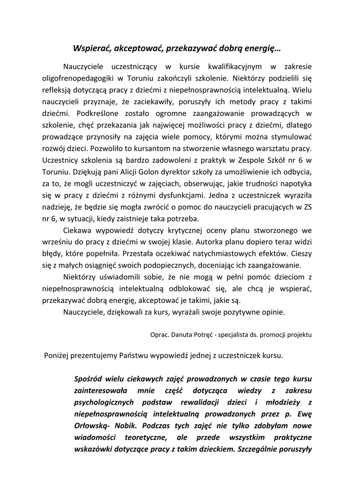 Wspierać, akceptować, przekazywać dobrą energię… Nauczyciele uczestniczący w kursie kwalifikacyjnym w zakresie oligofrenopedagogiki w Toruniu zakończyli szkolenie. Niektórzy podzielili się refleksją dotyczącą pracy z dziećmi z niepełnosprawnością intelektualną. Wielu nauczycieli przyznaje, że zaciekawiły, poruszyły ich metody pracy z takimi dziećmi. Podkreślone zostało ogromne zaangażowanie prowadzących w szkolenie, chęć przekazania jak najwięcej możliwości pracy z dziećmi, dlatego prowadzące przynosiły na zajęcia wiele pomocy, którymi można stymulować rozwój dzieci. Pozwoliło to kursantom na stworzenie własnego warsztatu pracy. Uczestnicy szkolenia są bardzo zadowoleni z praktyk w Zespole Szkół nr 6 w Toruniu. Dziękują pani Alicji Golon dyrektor szkoły za umożliwienie ich odbycia, za to, że mogli uczestniczyć w zajęciach, obserwując, jakie trudności napotyka się w pracy z dziećmi z różnymi dysfunkcjami. Jedna z uczestniczek wyraziła nadzieję, że będzie się mogła zwrócić o pomoc do nauczycieli pracujących w ZS nr 6, w sytuacji, kiedy zaistnieje taka potrzeba. Ciekawa wypowiedź dotyczy krytycznej oceny planu stworzonego we wrześniu do pracy z dziećmi w swojej klasie. Autorka planu dopiero teraz widzi błędy, które popełniła. Przestała oczekiwać natychmiastowych efektów. Cieszy się z małych osiągnięć swoich podopiecznych, doceniając ich zaangażowanie. Niektórzy uświadomili sobie, że nie mogą w pełni pomóc dzieciom z niepełnosprawnością intelektualną odblokować się, ale chcą je wspierać, przekazywać dobrą energię, akceptować je takimi, jakie są. Nauczyciele, dziękowali za kurs, wyrażali swoje pozytywne opinie. Oprac. Danuta Potręć ‐ specjalista ds. promocji projektu Poniżej prezentujemy Państwu wypowiedź jednej z uczestniczek kursu. Spośród wielu ciekawych zajęć prowadzonych w czasie tego kursu zainteresowała mnie część dotycząca wiedzy z zakresu psychologicznych podstaw rewalidacji dzieci i młodzieży z niepełnosprawnością intelektualną prowadzonych przez p. Ewę Orłowską‐ Nobik. Podczas tych zajęć nie tylko zdobyłam nowe wiadomości teoretyczne, ale przede wszystkim praktyczne wskazówki dotyczące pracy z takim dzieckiem. Szczególnie poruszyły mnie też lekcje z dziećmi z niepełnosprawnością intelektualną w stopniu umiarkowanym, które miałam okazję obserwować dzięki uprzejmości pani Alicji Golon dyrektor ZS nr 6 w Toruniu. W praktycznym działaniu mogłam dostrzec trudności w funkcjonowaniu tych dzieci w zespole klasowym. Ukończenie kursu oligofrenopedagogiki „otworzyło mi oczy” na wiele problemów, z których wcześniej nie zdawałam sobie sprawy. Sądzę, że w przyszłości, dla nowych kursantów, powinno się tworzyć jeszcze więcej możliwości bezpośredniego kontaktu z uczniami o specyficznych trudnościach w uczeniu się, zwiększyć liczbę obserwacji i praktyk w specjalistycznych szkołach. Magdalena Lewandowska