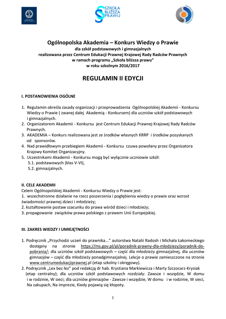 Ogólnopolska Akademia – Konkurs Wiedzy o Prawie dla szkół podstawowych i gimnazjalnych realizowana przez Centrum Edukacji Prawnej Krajowej Rady Radców Prawnych w ramach programu „Szkoła bliższa prawu” w roku szkolnym 2016/2017 REGULAMIN II EDYCJI I. POSTANOWIENIA OGÓLNE 1. Regulamin określa zasady organizacji i przeprowadzenia Ogólnopolskiej Akademii - Konkursu Wiedzy o Prawie ( zwanej dalej Akademią - Konkursem) dla uczniów szkół podstawowych i gimnazjalnych. 2. Organizatorem Akademii - Konkursu jest Centrum Edukacji Prawnej Krajowej Rady Radców Prawnych. 3. AKADEMIA – Konkurs realizowana jest ze środków własnych KRRP i środków pozyskanych od sponsorów. 4. Nad prawidłowym przebiegiem Akademii - Konkursu czuwa powołany przez Organizatora Krajowy Komitet Organizacyjny. 5. Uczestnikami Akademii - Konkursu mogą być wyłącznie uczniowie szkół: 5.1. podstawowych (klas V-VI), 5.2. gimnazjalnych. II. CELE AKADEMII Celem Ogólnopolskiej Akademii - Konkursu Wiedzy o Prawie jest: 1. wszechstronne działanie na rzecz poszerzenia i pogłębienia wiedzy o prawie oraz wzrost świadomości prawnej dzieci i młodzieży; 2. kształtowanie postaw szacunku do prawa wśród dzieci i młodzieży; 3. propagowanie związków prawa polskiego z prawem Unii Europejskiej. III. ZAKRES WIEDZY I UMIEJĘTNOŚCI 1. Podręcznik „Przychodzi uczeń do prawnika...” autorstwa Natalii Radosh i Michała Łakomeckiego dostępny na stronie https://ms.gov.pl/pl/poradnik-prawny-dla-mlodziezy/poradnik-dopobrania/; dla uczniów szkół podstawowych – część dla młodzieży gimnazjalnej, dla uczniów gimnazjów – część dla młodzieży ponadgimnazjalnej. Lekcje o prawie zamieszczone na stronie www.centrumedukacjiprawnej.pl (etap szkolny i okręgowy). 2. Podręcznik „Lex bez łez” pod redakcją dr hab. Krystiana Markiewicza i Marty Szczocarz-Krysiak (etap centralny); dla uczniów szkół podstawowych rozdziały: Zawsze i wszędzie, W domu i w rodzinie, W sieci; dla uczniów gimnazjów - Zawsze i wszędzie, W domu i w rodzinie, W sieci, Na zakupach, Na imprezie, Kiedy pojawią się kłopoty. 1 3. Konstytucja Rzeczypospolitej Polskiej; dla uczniów szkół podstawowych – rozdziały I: Rzeczpospolita, II: Wolności, prawa i obowiązki człowieka i obywatela; dla dla uczniów gimnazjów – rozdziały I: Rzeczpospolita, II: Wolności, prawa i obowiązki człowieka i obywatela, IV: Sejmi Senat, V: Prezydent Rzeczypospolitej Polskiej, VI: Rada Ministrów i administracjarządowa, VIII: Sądy i Trybunały (wszystkie etapy). 4. Konwencja o prawach dziecka przyjęta przez Zgromadzenie Ogólne Narodów Zjednoczonych dnia 20 listopada 1989 r. – http://brpd.gov.pl/konwencja-o-prawach-dziecka (preambuła i część I – etap centralny). IV. STRUKTURA ORGANIZACYJNA AKADEMII - KONKURSU 1. KRAJOWY KOMITET ORGANIZACYJNY 1.1. Prezes KRRP lub wiceprezes wskazuje 5 członków Krajowego Komitetu Organizacyjnego Akademii - Konkursu 1.2. Krajowy Komitet Organizacyjny Ogólnopolskiej Akademii - Konkursu ma siedzibę w Krajowej Radzie Radców Prawnych w Warszawie, al. Ujazdowskie 41 lok.2. 2. ZADANIA KRAJOWEGO KOMITETU ORGANIZACYJNEGO AKADEMII - KONKURSU 2.1. Wybór trzyosobowych zespołów jurorów etapu centralnego. 2.2 Kontrolowanie pracy Okręgowych Komitetów Organizacyjnych Akademii – Konkursu. 2.3. Wręczenie dyplomów i zaświadczeń dla laureatów i finalistów etapu centralnego Akademii Konkursu 2.4. Propagowanie idei Akademii - Konkursu. 2.5. Pozyskiwanie środków na organizację Akademii - Konkursu. 2.6. Powołanie trzyosobowego Zespołu ds. Odwołań. 3. ZADANIA ORGANIZTORA 3.1.Przygotowanie regulaminu Ogólnopolskiej Akademii - Konkursu Wiedzy o Prawie określającego: 3.1.1. podstawowe założenia organizacyjne 3.1.2. harmonogram Akademii - Konkursu 3.1.3. dokumentację i literaturę obowiązującą i zalecaną dla uczestników 3.1.4. wzory druków stosowanych w Akademii - Konkursu 3.2. Przygotowanie i przesłanie testu i zadań ustnych - dla potrzeb eliminacji szkolnych do szkół, które zgłosiły udział w Akademii - Konkursie. Testy i tematy zadań ustnych oraz prawidłowe odpowiedzi i kryteria oceny wystąpień publicznych będą dostarczane komisjom szkolnym za pomocą sieci Internet dzień przed terminem pierwszego (szkolnego) etapu. 3.3. Przesłanie do Okręgowych Komitetów Organizacyjnych Akademii – list uczestników zakwalifikowanych po etapie szkolnym do etapu okręgowego 3.4 Przygotowanie i przesłanie do Okręgowych Komitetów Organizacyjnych zadań pisemnych i ustnych przewidzianych dla uczestników drugiego (okręgowego) etapu Akademii-Konkursu. Tematy zadań pisemnych i ustnych oraz prawidłowe odpowiedzi i kryteria oceny wystąpień publicznych będą dostarczane Okręgowym Komitetom Organizacyjnym za pomocą sieci Internet dzień przed terminem etapu okręgowego. 3.5. Przygotowywanie zestawów pytań i zadań ustnych, organizacja i zapewnienie przebiegu 2 Centralnego Etapu Akademii – Konkursu Finału w Warszawie. 3.6. Przygotowywanie i wydawanie dyplomów i zaświadczeń dla laureatów i finalistów etapu centralnego Akademii - Konkursu. 3.7. Prowadzenie dokumentacji Akademii - Konkursu. 3.8. Administrowanie bazą danych szkół, uczestników, laureatów i finalistów Akademii- Konkursu. 3.9. Utrzymywanie kontaktu z uczestnikami i ich opiekunami. 3.10. Nawiązywanie współpracy z partnerami zewnętrznymi (patronami i sponsorami). 3.11. Organizator Akademii - Konkursu ma prawo: 3.11.1. anulowania wyników poszczególnych etapów w razie ujawnienia istotnych (naruszających regulamin Akademii - Konkursu) nieprawidłowości i wykluczenia szkół biorących w nich udział. 3.11.2. wykluczenia z udziału w Akademii - Konkursie uczestników łamiących regulamin (w szczególności za: niesamodzielne rozwiązywanie testów wiedzy prawniczej i przygotowanie pracy pisemnej, korzystanie z niedozwolonych pomocy, plagiat). Decyzje o wykluczeniu podejmuje przewodniczący kom