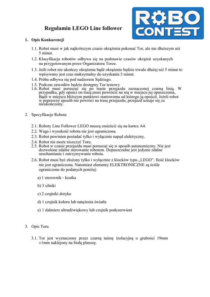 Regulamin LEGO Line follower 1. Opis Konkurencji 1.1. Robot musi w jak najkrótszym czasie okrążenia pokonać Tor, ale nie dłuższym niż 5 minut. 1.2. Klasyfikacja robotów odbywa się na podstawie czasów okrążeń uzyskanych na przygotowanym przez Organizatora Torze. 1.3. Jeśli robot nie ukończy okrążenia bądź okrążenie będzie trwało dłużej niż 5 minut to wpisywany jest czas maksymalny do uzyskania 5 minut. 1.4. Próba odbywa się pod nadzorem Sędziego. 1.5. Podczas zawodów będzie dostępny Tor testowy 1.6. Robot musi poruszać się p̨ o trasie przejazdu zaznaczonej czarną linią. W przypadku, gdy opuści on trasę,̨musi powrócić na nią ̨w miejscu jej opuszczenia, Bądź w miejscu bliższym punktowi startowemu od którego ją opuścił. Jeżeli robot w poprawny sposób nie powróci na trasę ̨przejazdu, przejazd uznaje się ̨za nieukończony. 2. Specyfikacje Robota 2.1. Roboty Line Follower LEGO muszą zmieścić się na kartce A4. 2.2. Waga i wysokość robota nie jest ograniczona. 2.3. Robot powinien posiadać tylko i wyłącznie napęd elektryczny. 2.4. Robot nie może niszczyć Toru. 2.5. Robot w czasie przejazdu musi poruszać się ̨w sposób autonomiczny. Nie jest dozwolone zdalne sterowanie robotem. Dopuszczalne jest jedynie zdalne uruchamianie i zatrzymywanie robota. 2.6. Robot musi być złożony tylko i wyłącznie z klocków typu „LEGO”. Ilość klocków nie jest ograniczona. Natomiast elementy ELEKTRONICZNE są ściśle ograniczone do podanych poniżej: a) 1 sterownik - kostka b) 3 silniki c) 2 czujniki dotyku d) 1 czujnik koloru lub natężenia światła e) 1 dalmierz ultradźwiękowy lub czujnik podczerwieni 3. Opis Toru 3.1. Tor jest wyznaczony przez czarną taśmę izolacyjną o grubości 19mm ±1mm naklejony na białą planszę. 3.2. Tor stanowi zamknięty obwód, tzn. miejsce startu jest jednocześnie metą. Czas okrążenia jest mierzony za pomocą Bramki. Jeżeli bramka ulegnie uszkodzeniu dopuszczalny jest pomiar przeprowadzony przez Sędziego za pomocą stopera. 3.3. Natężenie światła nad torem może się wahać. 4. Przebieg Konkursu 4.1. Zawody rozgrywane są w dwóch etapach: eliminacyjnym i finałowym. 4.2. W etapie eliminacyjnym biorą udział wszystkie zgłoszone roboty, każdy z nich musi dokonać co najmniej jednego przejazdu. Liczba dopuszczalnych przejazdów nie jest ograniczona. O kolejności przejazdów decydują sędziowie. 4.3. Do etapu finałowego przechodzą ̨trzy roboty, które w etapie eliminacyjnym uzyskały trzy najkrótsze czasy przejazdu. Każdemu robotowi przysługuje limit trzech przejazdów, za ostateczny czas uznaje się ̨najkrótszy uzyskany przez danego robota. Kolejno przejazdów jest ustalana na podstawie czasu osiągniętego w etapie eliminacyjnym, pierwszeństwo ma robot który uzyskał najkrótszy czas w eliminacjach. Zwycięzcą zawodów zostaje robot który uzyska najkrótszy ostateczny czas przejazdu. 5. Decydujący głos podczas sytuacji spornych ma sędzia główny. Może on podejmować decyzje dotyczące spraw nie objętych lub, w uzasadnionym przypadku, sprzecznych z regulaminem
