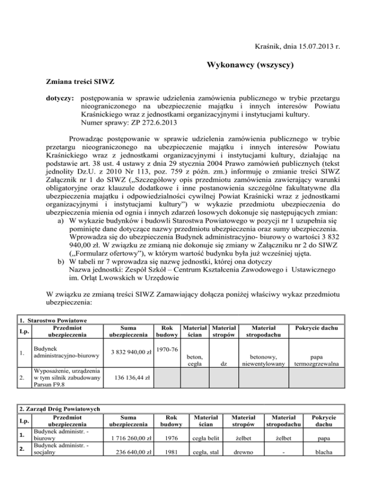 Kraśnik, dnia 15.07.2013 r. Wykonawcy (wszyscy) Zmiana treści SIWZ dotyczy: postępowania w sprawie udzielenia zamówienia publicznego w trybie przetargu nieograniczonego na ubezpieczenie majątku i innych interesów Powiatu Kraśnickiego wraz z jednostkami organizacyjnymi i instytucjami kultury. Numer sprawy: ZP 272.6.2013 Prowadząc postępowanie w sprawie udzielenia zamówienia publicznego w trybie przetargu nieograniczonego na ubezpieczenie majątku i innych interesów Powiatu Kraśnickiego wraz z jednostkami organizacyjnymi i instytucjami kultury, działając na podstawie art. 38 ust. 4 ustawy z dnia 29 stycznia 2004 Prawo zamówień publicznych (tekst jednolity Dz.U. z 2010 Nr 113, poz. 759 z późn. zm.) informuję o zmianie treści SIWZ Załącznik nr 1 do SIWZ („Szczegółowy opis przedmiotu zamówienia zawierający warunki obligatoryjne oraz klauzule dodatkowe i inne postanowienia szczególne fakultatywne dla ubezpieczenia majątku i odpowiedzialności cywilnej Powiat Kraśnicki wraz z jednostkami organizacyjnymi i instytucjami kultury”) w wykazie przedmiotu ubezpieczenia do ubezpieczenia mienia od ognia i innych zdarzeń losowych dokonuje się następujących zmian: a) W wykazie budynków i budowli Starostwa Powiatowego w pozycji nr 1 uzupełnia się pominięte dane dotyczące nazwy przedmiotu ubezpieczenia oraz sumy ubezpieczenia. Wprowadza się do ubezpieczenia Budynek administracyjno- biurowy o wartości 3 832 940,00 zł. W związku ze zmianą nie dokonuje się zmiany w Załączniku nr 2 do SIWZ („Formularz ofertowy”), w którym wartość budynku była już wcześniej ujęta. b) W tabeli nr 7 wprowadza się nazwę jednostki, której ona dotyczy Nazwa jednostki: Zespół Szkół – Centrum Kształcenia Zawodowego i Ustawicznego im. Orląt Lwowskich w Urzędowie W związku ze zmianą treści SIWZ Zamawiający dołącza poniżej właściwy wykaz przedmiotu ubezpieczenia: 1. Starostwo Powiatowe Przedmiot Lp. ubezpieczenia 1. 2. Budynek administracyjno-biurowy Wyposażenie, urządzenia w tym silnik zabudowany Parsun F9.8 2. Zarząd Dróg Powiatowych Przedmiot Lp. ubezpieczenia Budynek administr. 1. biurowy Budynek administr. 2. socjalny Suma ubezpieczenia Rok Materiał Materiał budowy ścian stropów 3 832 940,00 zł 1970-76 beton, cegła dz Materiał stropodachu Pokrycie dachu betonowy, niewentylowany papa termozgrzewalna 136 136,44 zł Suma ubezpieczenia Rok budowy Materiał ścian Materiał stropów Materiał stropodachu Pokrycie dachu 1 716 260,00 zł 1976 cegła belit żelbet żelbet papa 236 640,00 zł 1981 cegła, stal drewno - blacha 3. 4. Budynek administr. socjalny Wiata magazynowo warsztatowa 547 400,00 zł 1986 cegła, belit 164 016,00 zł 1981 cegła stal 39 440,00 zł 1973 cegła stal 161 280,00 zł 1972 48 000,00 zł 5. Budynek gospodarczy 6. Wiata magazynowa 7. Budynek gospodarczy 8. Ogrodzenie bazy Kraśnik 3 548,81 zł Ogrodzenie bazy Spławy Ogrodzenie bazy 10. Szastarka Oświetlenie bazy 11. Szastarska 5 412,09 zł 9. 12. Wyposażenie i urządzenia 3. Powiatowy Urząd Pracy Przedmiot Lp. ubezpieczenia Wyposażenie, urządzenia 1. 4. Zespół Szkół Nr 1 Przedmiot Lp. ubezpieczenia 1. Budynek szkoły - blacha - blacha żelbet - blacha cegła stal - - blacha 1959 cegła belit drewno - eternit, papa Rok budowy Materiał ścian Materiał stropów Materiał stropodachu Pokrycie dachu 2 277,99 zł 10 336,69 zł 980 705,58 zł Suma ubezpieczenia 13 683,20 zł Suma ubezpieczenia 7 112 000,00 zł Rok budowy 1971 2. Bunkier* 12 577,00 zł 1971 3. Ogrodzenie 51 805,00 zł 1971 4. Boisko sportowe 38 229,00 zł 1971 5. Zespół Szkół Nr 2 Przedmiot Lp. ubezpieczenia Budynek szkoły 1. Suma ubezpieczenia 11 056 400,00 zł Rok budowy papa termozgrzewalna Materiał stropodachu płyty betonowe Pokrycie dachu Rok budowy Materiał ścian Materiał stropów Materiał stropodachu Pokrycie dachu 7 734 000,00 zł 1969 beton betonowy papa 15 751 145,31 zł 2011 suporex cegła dziurawa beton stalowy papa 5 129 593,15 zł 2002 cegła beton betonowy papa 1954 13 630,00 zł 1954 3. Ogrodzenie Wyposażenie, urządzenia 10 270,00 zł 1954 blacha 7 500,00 zł 6. Zespół Szkół Nr 3 Przedmiot Lp. ubezpieczenia Budynek szkolny, ul. 1. Słowackiego 7 3. Pokrycie dachu Materiał stropów akermana murowane Boisko szkolne 2. Materiał Materiał Materiał ścian stropów stropodachu cegła, płyty beton płyty DZ-3 betonowe Materiał ścian cegła suporex 2. 4. żelbet Hala sportowa* Hala sportowa rehabilitacja* Suma ubezpieczenia 4. Budynek administr. warsztaty 5. 6. 7. 8. 1 984 000,00 zł 2002 suporex beton betonowy papa Warsztat szkutniczy 224 000,00 zł Barak Garaże Wyposażenie, urządzenia 216 000,00 zł 1987 cegła - stalowy blacha 1987 suporex - beton papa 107 448,85 zł Maszyna czyszcząca 27 216,73 zł 7. Zespół Szkół – Centrum Kształcenia Zawodowego i Ustawicznego im. Orląt Lwowskich w Urzędowie Przedmiot Suma Rok Materiał Materiał Materiał Pokrycie Lp. ubezpieczenia ubezpieczenia budowy ścian stropów stropodachu dachu Budynek szkoły (jedna 1. 1 000 000,00 zł B.d. kondygnacja) Ogrodzenie terenu szkoły 2. wraz z bramą 20 000,00 zł wjazdową** Wyposażenie i 3. 4 849,00 zł urządzenia ** w miejscu sumy ubezpieczenia podano wartość szacunkową podaną przez jednostkę 8. Zespół Szkół w Wólce Gościeradowskiej Przedmiot Suma Lp. ubezpieczenia ubezpieczenia Budynek dydaktyczny, 1. stolarnia 489 600,00 zł Budynek internatu 2. dydaktyczny 4 858 200,00 zł 3. Budynek szkolny 3 640 080,00 zł Rok budowy Materiał ścian Materiał stropów Materiał stropodachu Pokrycie dachu belit, cegła beton DZ papa belit, cegła żelbet, DZ-3 DZ papa 1972 cegła - DZ papa 1971 1972 4. Budynek warsztatowy 168 800,00 zł B. d. belit, cegła - murowany blacha 5. Chlewnia - magazyn Szopa –wiata -garaże sprzętu rolniczego Budynek admin. mieszkalny 380 000,00 zł B. d. cegła - - eternit cegła drewno - blacha drewno drewno - eternit Magazyn zbożowy Budynek warsz