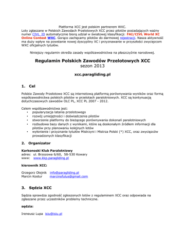 Platforma XCC jest polskim partnerem WXC. Loty zgłaszane w Polskich Zawodach Przelotowych XCC przez pilotów posiadających ważny numer CIVL_ID automatycznie biorą udział w światowej klasyfikacji: FAI/CIVL World XC Online Contest WXC. Gorąco zachęcamy pilotów do darmowej rejestracji. Nasza aktywność ma duży wpływ na powstanie nowej dyscypliny XC i przyznawanie w przyszłości zwycięzcom WXC oficjalnych tytułów. Niniejszy regulamin określa zasady współzawodnictwa na płaszczyźnie narodowej. Regulamin Polskich Zawodów Przelotowych XCC sezon 2013 xcc.paragliding.pl 1. Cel Polskie Zawody Przelotowe XCC są internetową platformą porównywania wyników oraz formą współzawodnictwa polskich pilotów w przelotach paralotniowych. XCC są kontynuacją dotychczasowych zawodów OLC PL, XCC PL 2007 - 2012. Celem • • • • • 2. współzawodnictwa jest: popularyzacja latania przelotowego rozwój umiejętności i doświadczenia pilotów stworzenie platformy do bieżącego porównywania dokonań paralotniowych rozbudowa bazy danych z wynikami, które są doskonałym źródłem informacji dla pilotów przy planowaniu kolejnych lotów wyłonienie i przyznanie tytułów Mistrzyni i Mistrza Polski (*) XCC, oraz zwycięzców prowadzonych klasyfikacji Organizator Karkonoski Klub Paralotniowy adres: ul. Brzozowa 6/60, 58-530 Kowary www: www.kkp.paragliding.pl kierownik XCC: Grzegorz Olejnik [email protected] Marcin Kostur [email protected] 3. Sędzia XCC Sędzia sprawdza zgodność zgłoszonych lotów z regulaminem XCC oraz odpowiada na zgłaszane przez uczestników problemy techniczne. sędzia: Ireneusz Lupa [email protected] 4. Rada pilotów Rada Pilotów jest ciałem doradczym Organizatora powołanym do rozpatrywania odwołań pilotów od decyzji sędziego oraz opiniowania i pomocy w opracowywaniu szczegółowych zasad dotyczących regulaminu. Rada składa się maksymalnie z 5-ciu osób i jej kadencja trwa dwa sezony. Członkiem Rady może zostać uczestnik XCC który w aktualnym sezonie uzyskał minimum 200 pkt. Rada jest wybierana w głosowaniu przez uczestników XCC. Głosowanie ma miejsce w trakcie oficjalnego spotkania tuż przed uroczystą imprezą zakończeniową i ogłoszeniem wyników. Propozycje kandydatów do Rady Pilotów można zgłaszać drogą mailowa na adres Sędziego do godziny 24:00 dnia poprzedzającego imprezę zakończeniową. W sytuacjach szczególnych skład Rady może zostać wyłoniony w wyniku głosowania przeprowadzonego w oparciu o techniki informatyczne (e-mail, ankiety on-line). Rada pełni swoją funkcje do czasu wyłonienia nowego składu. Skład rady w sezonie 2011-2012: • Paweł Faron - [email protected] • Sławek Kędziak - [email protected] • Robert Wójcicki - [email protected] • Krzysztof Ziółkowski - [email protected] 5. Uczestnictwo W zawodach mogą brać udział wszyscy piloci posiadający narodowość polską oraz wymagane prawem uprawnienia do wykonywania lotów na paralotniach. Rejestracja w zawodach odbywa się przy użyciu formularza zgłoszeniowego znajdującego się na stronie XCC. Rejestracja oznacza zgodę uczestnika na stosowanie postanowień niniejszego regulaminu. Uczestnictwo w Polskich Zawodach Przelotowych XCC jest darmowe. Polskie Zawody Przelotowe XCC są finansowane ze środków Karkonoskiego Klubu Paralotniowego oraz ze środków pochodzących od sponsorów. Warunki korzystania z powierzchni reklamowej dla sponsorów i zamieszczenia własnego logo publikowane są na stronie KKP. 6. Sprzęt Uczestnicy odpowiadają osobiście za sprawność techniczną i zdolność do lotu używanego sprzętu. Sprzęt podzielony jest na klasy w zależności od posiadanego atestu bezpieczeństwa. Loty wykonywane są w ramach następujących klas: • Serial - paralotnie z atestem maks. LTF/DHV 3, CEN D, AFNOR/SHV Competition • Open - wszystkie paralotnie w tym nieposiadające atestu • Sport - paralotnie z atestem maks. LTF/DHV 2, CEN C, AFNOR/SHV Performance • Fun - paralotnie z atestem maks. LTF/DHV 1-2, CEN B, AFNOR/SHV Standard • Tandem - paralotnie z atestem LTF/DHV, CEN, AFNOR/SHV pozwalającym na lot z pasażerem. Przy zgłaszaniu lotu w kategorii „Tandem” należy w uwagach podać imię i nazwisko pasażera. W przypadku gdy paralotnia posiada atest różnych organizacji, decydująca jest następująca kolejność: 1. atest LTF/DHV 2. atest CEN 3. atest AFNOR/SHV Za prawidłowe zakwalifikowanie swoich lotów do odpowiedniej klasy odpowiedzialny jest uczestnik. Zmiana sprzętu i start w różnych klasach podczas trwania sezonu jest dozwolona. 7. Czas trwania zawodów Sezon rozpoczyna się 1 października 2012 i trwa do 30 września 2013. Regulamin obowiązuje od 01.10.2012. 8. Dokumentacja lotów Ocenie podlegają jedynie loty wykonane na paralotniach w locie swobodnym (bez napędu). Start do lotu może odbywać się z rozbiegu (w górach, klifach itp.) bądź z użyciem urządzenia holującego - wyciągarki. Dokumentowanie przelotów odbywa się za pomocą urządzenia GPS z funkcją zapisu śladu zawierającego pozycję i wysokości. Pilot powinien dopilnować, aby zapis lotu odbywał się w sposób ciągły i rozpoczynał się przed startem (gdy pilot dotyka ziemi). Interwał zapisu nie może być większy niż 60 sekund. Zaleca się zapis z interwałem od 5 do 15 s. Dopuszczalne są maksymalnie dwie duże przerwy w zapisie śladu GPS o łącznym czasie15 minut. Przerwa w zapisie śladu o łącznej długości powyżej 15 minut powoduje dyskwalifikację lotu. Dopuszczalne są kilkusekundowe przerwy lub błędy w zapisie spowodowane zakłóceniami, nie wynikające z celowego działania uczestnika lub z braku zasilania GPS. 9. Zgłaszanie lotów Zgłaszanie lotów (po zalogowaniu) odbywa się poprzez stronę http://xcc.paragliding.pl. Aplikacja automatycznie dokonuje sprawdzenia lotu i oblicza maksymalną możliwą ilość punktów za lot. Loty należy zgłaszać w postaci pliku w formacie IGC. Plik IGC musi pos
