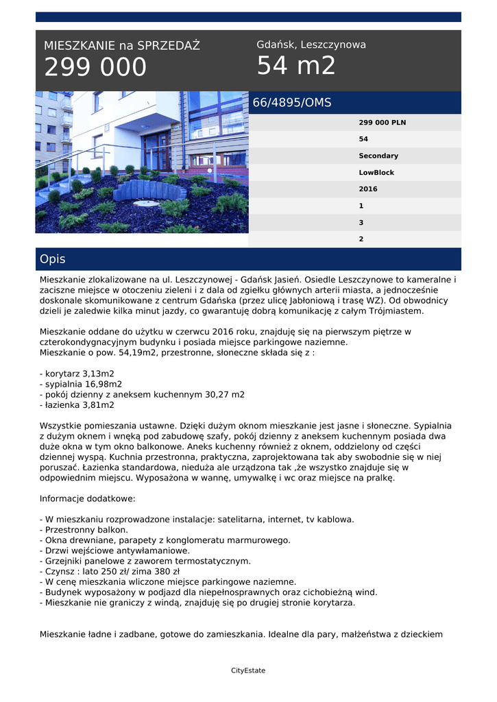 Gdańsk, Leszczynowa MIESZKANIE na SPRZEDAŻ 54 m2 299 000 66/4895/OMS 299 000 PLN 54 Secondary LowBlock 2016 1 3 2 Opis Mieszkanie zlokalizowane na ul. Leszczynowej - Gdańsk Jasień. Osiedle Leszczynowe to kameralne i zaciszne miejsce w otoczeniu zieleni i z dala od zgiełku głównych arterii miasta, a jednocześnie doskonale skomunikowane z centrum Gdańska (przez ulicę Jabłoniową i trasę WZ). Od obwodnicy dzieli je zaledwie kilka minut jazdy, co gwarantuję dobrą komunikację z całym Trójmiastem. Mieszkanie oddane do użytku w czerwcu 2016 roku, znajduję się na pierwszym piętrze w czterokondygnacyjnym budynku i posiada miejsce parkingowe naziemne. Mieszkanie o pow. 54,19m2, przestronne, słoneczne składa się z : - korytarz 3,13m2 sypialnia 16,98m2 pokój dzienny z aneksem kuchennym 30,27 m2 łazienka 3,81m2 Wszystkie pomieszania ustawne. Dzięki dużym oknom mieszkanie jest jasne i słoneczne. Sypialnia z dużym oknem i wnęką pod zabudowę szafy, pokój dzienny z aneksem kuchennym posiada dwa duże okna w tym okno balkonowe. Aneks kuchenny również z oknem, oddzielony od części dziennej wyspą. Kuchnia przestronna, praktyczna, zaprojektowana tak aby swobodnie się w niej poruszać. Łazienka standardowa, nieduża ale urządzona tak ,że wszystko znajduje się w odpowiednim miejscu. Wyposażona w wannę, umywalkę i wc oraz miejsce na pralkę. Informacje dodatkowe: - W mieszkaniu rozprowadzone instalacje: satelitarna, internet, tv kablowa. Przestronny balkon. Okna drewniane, parapety z konglomeratu marmurowego. Drzwi wejściowe antywłamaniowe. Grzejniki panelowe z zaworem termostatycznym. Czynsz : lato 250 zł/ zima 380 zł W cenę mieszkania wliczone miejsce parkingowe naziemne. Budynek wyposażony w podjazd dla niepełnosprawnych oraz cichobieżną wind. Mieszkanie nie graniczy z windą, znajduję się po drugiej stronie korytarza. Mieszkanie ładne i zadbane, gotowe do zamieszkania. Idealne dla pary, małżeństwa z dzieckiem CityEstate lub singla lub na inwestycje- na wynajem. W okolicy tereny rekreacyjne, zaplecze handlowo- usługowe, przedszkole. Zapraszam na prezentacje. Karolina Jóźwiak tel 534 158 983 Karolina Jóźwiak tel. 534-158-983 email: [email protected] CityEstate Powered by TCPDF (www.tcpdf.org)