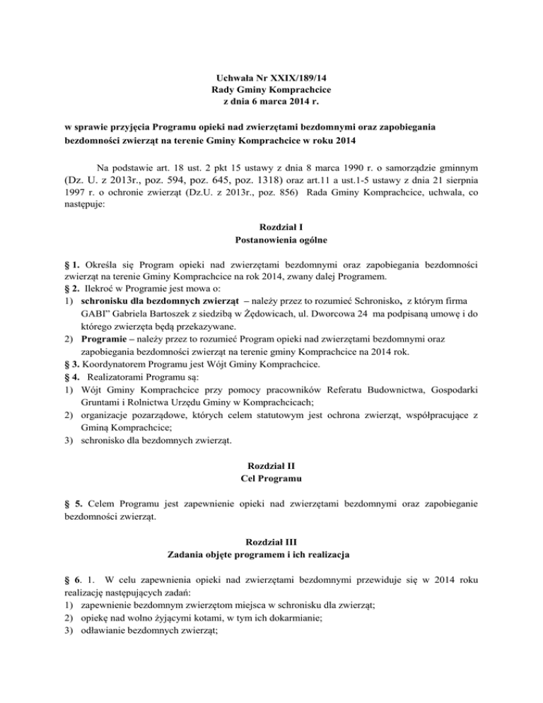 Uchwała Nr XXIX/189/14 Rady Gminy Komprachcice z dnia 6 marca 2014 r. w sprawie przyjęcia Programu opieki nad zwierzętami bezdomnymi oraz zapobiegania bezdomności zwierząt na terenie Gminy Komprachcice w roku 2014 Na podstawie art. 18 ust. 2 pkt 15 ustawy z dnia 8 marca 1990 r. o samorządzie gminnym (Dz. U. z 2013r., poz. 594, poz. 645, poz. 1318) oraz art.11 a ust.1-5 ustawy z dnia 21 sierpnia 1997 r. o ochronie zwierząt (Dz.U. z 2013r., poz. 856) Rada Gminy Komprachcice, uchwala, co następuje: Rozdział I Postanowienia ogólne § 1. Określa się Program opieki nad zwierzętami bezdomnymi oraz zapobiegania bezdomności zwierząt na terenie Gminy Komprachcice na rok 2014, zwany dalej Programem. § 2. Ilekroć w Programie jest mowa o: 1) schronisku dla bezdomnych zwierząt – należy przez to rozumieć Schronisko, z którym firma GABI” Gabriela Bartoszek z siedzibą w Żędowicach, ul. Dworcowa 24 ma podpisaną umowę i do którego zwierzęta będą przekazywane. 2) Programie – należy przez to rozumieć Program opieki nad zwierzętami bezdomnymi oraz zapobiegania bezdomności zwierząt na terenie gminy Komprachcice na 2014 rok. § 3. Koordynatorem Programu jest Wójt Gminy Komprachcice. § 4. Realizatorami Programu są: 1) Wójt Gminy Komprachcice przy pomocy pracowników Referatu Budownictwa, Gospodarki Gruntami i Rolnictwa Urzędu Gminy w Komprachcicach; 2) organizacje pozarządowe, których celem statutowym jest ochrona zwierząt, współpracujące z Gminą Komprachcice; 3) schronisko dla bezdomnych zwierząt. Rozdział II Cel Programu § 5. Celem Programu jest zapewnienie opieki nad zwierzętami bezdomnymi oraz zapobieganie bezdomności zwierząt. Rozdział III Zadania objęte programem i ich realizacja § 6. 1. W celu zapewnienia opieki nad zwierzętami bezdomnymi przewiduje się w 2014 roku realizację następujących zadań: 1) zapewnienie bezdomnym zwierzętom miejsca w schronisku dla zwierząt; 2) opiekę nad wolno żyjącymi kotami, w tym ich dokarmianie; 3) odławianie bezdomnych zwierząt; obligatoryjną sterylizację albo kastrację zwierząt w schroniskach dla zwierząt; poszukiwanie właścicieli dla bezdomnych zwierząt; usypianie ślepych miotów; wskazanie gospodarstwa rolnego w celu zapewnienia miejsca dla zwierząt gospodarskich; zapewnienie całodobowej opieki weterynaryjnej w przypadkach zdarzeń drogowych z udziałem zwierząt; 2. Program obejmuje także plan znakowania zwierząt w gminie. 4) 5) 6) 7) 8) § 7. Zapewnienie bezdomnym zwierzętom miejsca w schronisku dla zwierząt 1. Bezdomnym zwierzętom z terenu Gminy Komprachcice zapewnia się za pośrednictwem Przedsiębiorstwa Usług Produkcyjno Handlowo-Wielobranżowych „GABI” Gabriela Bartoszek z siedzibą w Żędowicach, ul. Dworcowa 24, miejsca w schronisku dla bezdomnych zwierząt. 2. Gmina umożliwia tymczasową opiekę i zapewnia leczenie weterynaryjne zwierząt, które w wyniku wypadków losowych utraciły czasowo właściciela. Zwierzęta będą przekazywane pod opiekę do schroniska dla bezdomnych zwierząt lub lekarza weterynarii z którym posiada podpisaną umowę. § 8. Opieka nad wolno żyjącymi kotami, w tym ich dokarmianie 1. Koty wolno żyjące nie są zwierzętami bezdomnymi, w związku z tym, nie wolno ich wywozić, ani utrudniać im bytowania w danym miejscu. 2. Gmina otoczy opieką wolno żyjące koty, pozostawiając je jednocześnie na wolności. Opieka będzie polegać przede wszystkim na dokarmianiu takich kotów w miejscu ich bytowania. 3. Ponadto Gmina w swoich działaniach, w zależności od posiadanych środków finansowych, uwzględni sterylizację i kastrację dojrzałych płciowo osobników, co przyczyni się do ograniczenia populacji tych zwierząt. 4. Zabiegi takie wykonywać będzie lekarz weterynarii, z którym Gmina podpisze umowę w tym zakresie. Skierowania na zabiegi będą wydawane w zależności od potrzeb oraz możliwości finansowych Gminy. § 9. Odławianie bezdomnych zwierząt 1. Wprowadza się na terenie gminy stałe interwencyjne odławianie bezdomnych zwierząt. 2. Odławianie zwierząt bezdomnych jest możliwe tylko w przypadku gdy istnieje możliwość zapewnienia odłowionym zwierzętom miejsca w schronisku dla zwierząt. Odstępstwem są odłowione zwierzęta, które stwarzają poważne zagrożenie dla ludzi lub innych zwierząt. 3. Transport odłowionych bezdomnych zwierząt odbywa się pojazdami przystosowanymi do ich transportu, natomiast odławianie przy pomocy urządzeń oraz środków nie stwarzających zagrożenia dla ich życia, zdrowia ani nie zadających im cierpienia. Podczas odławiania i transportu zapewniona w razie potrzeby będzie opieka weterynaryjna. 4. Dla odłowionych zwierząt będzie zabezpieczone miejsce w schronisku, wyżywienie, opieka weterynaryjna zgodnie z obowiązującymi przepisami w tym zakresie. 5. Odławianie bezdomnych zwierząt z terenu gminy realizuje Referat Budownictwa, Gospodarki Gruntami i Rolnictwa poprzez zlecenie zadania podmiotom, które posiadają przeszkolonych przedstawicieli w zakresie odławiania zwierząt domowych, a także odpowiedni humanitarny sprzęt. 6. Umowę na odławianie bezdomnych zwierząt wraz z oddaniem ich do schroniska na rok 2014 Gmina Komprachcice zawarła z P.U.P.H.W „Gabi” Gabriela Bartoszek. 7. Zapewnienie bezdomnym zwierzętom miejsca w schronisku dla zwierząt gmina realizuje poprzez umieszczanie bezdomnych zwierząt domowych w schronisku „SOS dla Zwierząt” z siedzibą w Chorzowie – Maciejkowicach. 8. Zgłoszenia bezpańskich zwierząt w godzinach pracy urzędu należy kierować pod nr 77-403-1712, a w przypadku zdarzeń drogowych oraz poza godzinami pracy urzędu pod nr tel. 502052515 „Lecznica dla zwierząt, Jan Piskoń” § 10. Obligatoryjna sterylizacja albo kastracja zwierząt w schroniskach dla zwierząt Zabiegom sterylizacji oraz kastracji poddawane będą bezdomne zwierzęta, które zostaną odłowione z terenu gminy. Zabiegi przeprowadzane będą w s