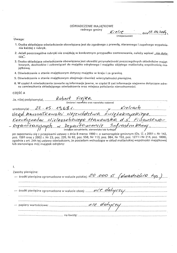 OŚWIADCZENIE MAJĄTKOWE radnego gminy (miejscowość) Uwaga: 1. Osoba składająca oświadczenie obowiązana jest do zgodnego z prawdą, starannego i zupełnego wypełnienia każdej z rubryk. 2. Jeżeli poszczególne rubryki nie znajdują w. konkretnym przypadku zastosowania, należy wpisać „nie doty3. Osoba składająca oświadczenie obowiązana jest określić przynależność poszczególnych składników majątkowych, dochodów i zobowiązań do majątku odrębnego i majątku objętego małżeńska wspólnością majątkowa. 4. Oświadczenie o stanie majątkowym dotyczy majątku w kraju i za granicą. 5. Oświadczenie o stanie majątkowym obejmuje również wierzytelności pieniężne. 6. W części A oświadczenia zawarte są informacje jawne, w części B zaś informacje niejawne dotyczące adresu zamieszkania składającego oświadczenie oraz miejsca położenia nieruchomości. CZĘŚĆ A Ja, niżej podpisania)...............£ (imiona i nazv/sko oraz nazwisko rodowe) urodzony(a) . . . . . . . . ^ . . . . . : . . . . -. . . . . . . . . . . . . . . . . . . . . . . . . . . . . . . . . . . . . . .w fc/.tf. J j [ (miejsce zatrudnienia, stanowisko lub funkcjaf po zapoznaniu się z przepisami ustawy z dnia 8 marca 1990 r. o samorządzie gminnym (Dz. 0. z 2001 r. Nr 142, póz. 1591 oraz z 2002 r. Nr 23, póz. 220, Nr 62, póz. 558, Nr 113, póz. 984, Nr 153, póz. 127 T i Nr 21 4, póz. 1806), zgodnie z art. 24h tej ustawy oświadczam, że posiadam wchodzące w skład małżeńskiej wspólności majątkowej lub stanowiące mój majątek odrębny: Zasoby pieniężne: — środki pieniężne zgromadzone w walucie polskiej: środki pieniężne zgromadzone w walucie obcej: ....:.......?.f........<g £r?/'C...<?^.r.^.<r.:?r£/ £?„<.CT.. — papiery wartościowe: na kwotę: 1. Dom o powierzchni: ..&ć£...ff.?fy£7&, ..... m , o wartości: 2 tytuł prawny: 2 2. Mieszkanie o powierzchni^^.^.......m , o wartości: tytuł prawny:................Mf.*(*.!3*Aę. ....... *......£&..£&.. 3. Gospodarstwo rolne: rodzaj gospodarstwa: ......... £?/.<?. ..... fP.źĄ.&.f?/.. ....................................... powierzchnia: o wartości: rodzaj zabudowy: tytuł prawny: Z tego tytułu osiągnąłem(ęłam) w roku ubiegłym przychód i dochód w wysokości: ........ 4. Inne nieruchomości: powierzchnia: o wartości: ...3X£.,£?.£^ tytuł prawny: 1. Posiadam udziały w spółkach handlowych z udziałem gminnych osób prawnych lub przedsiębiorców, w których uczestniczą ta.kie osoby — należy podać liczbę i emitenta udziałów: ' / udziały te stanowią pakiet większy niż 10% udziałów w spółce: Z tego tytułu osiągnątem(ęfam) w roku ubiegłym dochód w wysokości: 2. Posiadam udziały w innych spółkach handlowych — należy podać liczbę i emitenta udziałów: ............... • ..... >- KU".". 6 ..... .<o.<?_hłr.7.M. ........ Z tego tytułu osiagnątem(ęłam) w roku ubiegłym dochód w wysokości: IV. 1. Posiadam akcje w spółkach handlowych z udziałem gminnych osób prawnych lub przedsiębiorców, w których uczestniczą takie osoby — należy podać liczbę i emitenta akcji: - / * / • akcje te stanowią pakiet większy niż 10% akcji w spółce: Z tego tytułu osiągnąłem(ęłam) w roku ubiegłym dochód w wysokości: ..... 2. Posiadam akcje w innych spółkach handlowych — należy podać liczbę i emitenta akcji: / / Z tego tytułu osiagnałem(ęłam) w roku ubiegłym dochód w wysokości: V. Nabytem(am) (nabyt mój mafżonek, z wytaczaniem mienia przynależnego do jego majątku odrębnego) od Skarbu Państwa, innej państwowej osoby prawnej, jednostek samorządu terytorialnego, ich związków lub od komunalnej osoby prawnej następujące mienie, które podlegało zbyciu w drodze przetargu — należy podać opis mienia i datę nabycia, od kogo: VI. 1. Prowadzę działalność gospodarcza (należy podać formę prawną i przedmiot działalności): kJ.e?/.S>... ..&.<!?.. ........ 4/^c/^..«?.^ ..... r...ba.ytff.L...Jd?£?+L[c7.tf.c!/. ............. / / / f w / f — osobiście......................&&.<>P.t.5,6ł'.£.................../............................................................./ .................... — wspólnie z innymi osobami . . . Y 2. tego tytułu osiągnąłem(ęłam) w roku ubiegłym przychód i dochód w wysokosci:I^nP?3.~.<//..<?..^S..|.^ 2. Zarządzam działalnością gospodarczą lub jestem przedstawicielem pełnomocnikiem takiej działalności (należy podać formę prawną i przedmiot dziafa-lności):................................................................................... — osobiście — wspólnie z innymi osobami Z tego tytułu osiagnąłem(ełam) w roku ubiegłym dochód w wysokości: VII. W spółkach handlowych (nazwa, siedziba spółki): *.!'.€. — jestem członkiem zarządu (od kiedy): — jestem członkiem rady nadzorczej (od kiedy): —-.jestem członkiem komisji rewizyjnej (od kiedy): Z tego tytułu osiągnątem(ęłam) w roku ubiegłym dochód w wysokości: VIII. Inne dochody osiągane z tytułu zatrudnienia lub innej działalności zarobkowej lub zajęć, z podaniem kwot uzyskiwanych z każdego tytułu: DC. Składniki mienia ruchomego o wartości powyżej 10.000 złotych( w przypadku pojazdów mechanicznych należy podać markę, model i rok produkcji) X. Zobowiązania pieniężne o wartości powyżej 10.000 zł, w tym zaciągnięte kredyty i pożyczki oraz warunki , najakich zostały udzielone (wobec kogo, w związku zjakim zdarzeniem, wjakiej wysokości) ..............