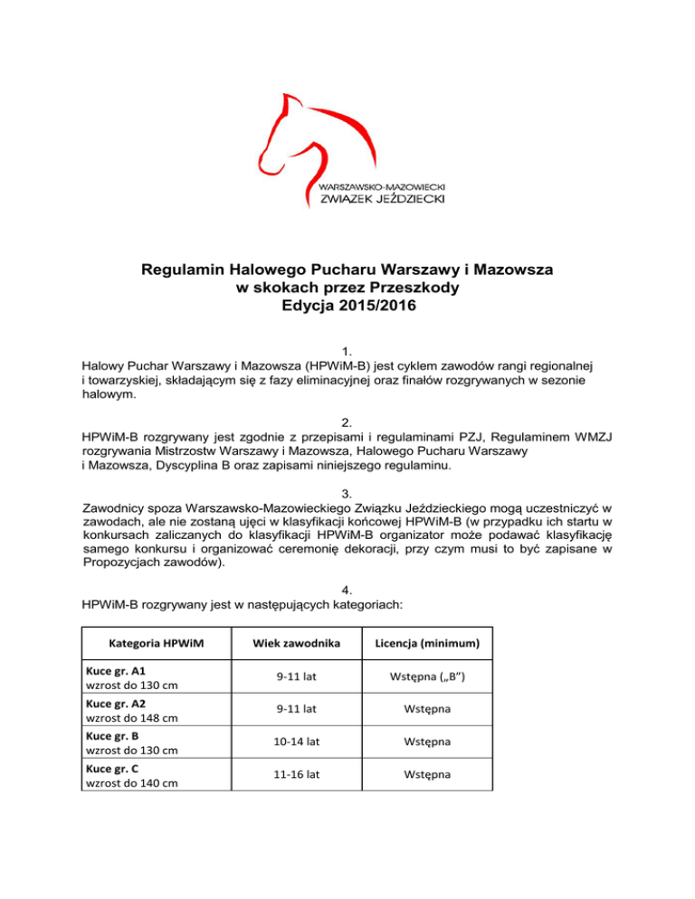 Regulamin Halowego Pucharu Warszawy i Mazowsza w skokach przez Przeszkody Edycja 2015/2016 1. Halowy Puchar Warszawy i Mazowsza (HPWiM-B) jest cyklem zawodów rangi regionalnej i towarzyskiej, składającym się z fazy eliminacyjnej oraz finałów rozgrywanych w sezonie halowym. 2. HPWiM-B rozgrywany jest zgodnie z przepisami i regulaminami PZJ, Regulaminem WMZJ rozgrywania Mistrzostw Warszawy i Mazowsza, Halowego Pucharu Warszawy i Mazowsza, Dyscyplina B oraz zapisami niniejszego regulaminu. 3. Zawodnicy spoza Warszawsko-Mazowieckiego Związku Jeździeckiego mogą uczestniczyć w zawodach, ale nie zostaną ujęci w klasyfikacji końcowej HPWiM-B (w przypadku ich startu w konkursach zaliczanych do klasyfikacji HPWiM-B organizator może podawać klasyfikację samego konkursu i organizować ceremonię dekoracji, przy czym musi to być zapisane w Propozycjach zawodów). 4. HPWiM-B rozgrywany jest w następujących kategoriach: Kategoria HPWiM Wiek zawodnika Licencja (minimum) Kuce gr. A1 wzrost do 130 cm 9-11 lat Wstępna („B”) Kuce gr. A2 wzrost do 148 cm 9-11 lat Wstępna Kuce gr. B wzrost do 130 cm 10-14 lat Wstępna Kuce gr. C wzrost do 140 cm 11-16 lat Wstępna Kuce gr. D bis wzrost do 148 cm 11-16 lat III Małe Konie gr. E wzrost do 156 cm 12-21 lat III Amatorzy od 9 lat tylko niezarejestrowani lub z Licencją Wstępną Dzieci II 11-14 lat Wstępna Zawodnicy z III licencją od 9 lat tylko III licencja Juniorzy Młodsi DK 12-15 lat III Juniorzy 14-18 lat III Młodzi Jeźdźcy 16-21 lat III Seniorzy od 18 lat II 5. 1. Zawodnik może startować jednocześnie w różnych kategoriach (na innych koniach), zachowując warunki uczestnictwa w poszczególnych kategoriach oraz limit startów odpowiedni do wieku zawodnika (Młodzik 9-11 lat – 4 starty; Dzieci II 11-14 lat, Junior Młodszy DK 12-15 lat – 6 startów, pozostali bez ograniczeń). 2. Zawodnicy, którzy rozpoczną eliminacje w 2015 roku w danej kategorii wiekowej, będą klasyfikowani w HPWiM-B zgodnie w z rocznikiem obowiązującym w 2015 roku. 6. Zawodnik może startować w jednej kategorii na dwóch koniach, z tym, że przed rozpoczęciem konkursu finałowego musi wskazać konia startującego w finale. Na drugim koniu może w dniu finału startować w konkursie dodatkowym lub ewentualnie w konkursie finałowym w specjalnej serii B poza klasyfikacją HPWiM-B. 7. Odbędą się w odrębnych terminach dwa finały: HPMWiM-B KiMK (Kuce i Małe Konie) + Amatorzy oraz HPWiM-B DK (Duże Konie). Zawodnicy mogą startować w obu imprezach na tym samym/ych koniu/ach, na warunkach określonych w Propozycjach zawodów. Kuc i Mały Koń startujący w HPMWiM-B DK startuje na warunkach przewidzianych dla dużych koni i nie przysługuje mu zmiana odległości dostosowująca je dla wzrostu kuca/małego konia. 8. Kalendarz zawodów eliminacyjnych i finałów HPWiM-B 2016 zatwierdzony przez Zarząd Warszawsko-Mazowieckiego Związku Jeździeckiego: 29.11 I eliminacja SKJ Poczernin 20.12 II eliminacja KJ Aromer Józefin 23.01 III eliminacja SKJ Poczernin 31.01 IV eliminacja KJ Aromer Józefin 20.02 V eliminacja SKJ Poczernin ? Finał DK KJ Aromer Józefin *) ? Finał KiMK + Amatorzy KJ Aromer Józefin *) *) Zawody finałowe - trzydniowe w marcu - terminy zostaną uzupełnione po zatwierdzeniu kalendarza 2016 PZJ i WMZJ 9. Zasady punktacji rankingowej: 1. W zawodach eliminacyjnych HPWiM-B zawodnicy zdobywają w danej kategorii punkty bonifikacyjne w następującej wysokości: I m-ce II m-ce III m-ce Kolejne m-ca 30 pkt 29 pkt 28 pkt Punkt mniej 2. W przypadku, gdy w konkursie eliminacyjnym danej kategorii HPWiM-B wystartuje mniejsza liczba zawodników niż 30, za pierwsze miejsce przyznane zostanie tyle punktów ile będzie startujących zawodników, a za kolejne miejsca zawodnicy otrzymają o jeden punkt mniej. 3. Do końcowej, łącznej klasyfikacji HPWiM-B zaliczony będzie JEDEN, najlepszy wynik zawodnika z konkursów eliminacyjnych (na 5 możliwych startów). Uwaga! Nie ma „warunku” startu w eliminacjach, żeby zawodnik mógł wystartować i być klasyfikowanym w zawodach finałowych i wynikach końcowych HPWiM-B.” 4. W zawodach finałowych HPWiM-B punkty bonifikacyjne przyznawane będą zgodnie z zasadami z pkt. 1 i 2., przy czym: - w piątkowym i sobotnim półfinale bez mnożnika, - w niedzielnym konkursie dwunawrotowym z mnożnikiem x 2. 10. Klasyfikacja HPWiM-B: 1. Wynikiem końcowym HPWiM-B jest suma punktów bonifikacyjnych z eliminacji (zgodnie z zapisem pkt. 9.3.) oraz zawodów finałowych. 2. W przypadku równej liczby punktów w klasyfikacji końcowej o kolejności zajętych miejsc decydują wyniki niedzielnego konkursu finałowego. 3. Zawodnicy, którzy punktowali w eliminacjach i półfinałach, ale nie startowali w finale klasyfikowani będą odpowiednio w dalszej kolejności. 11. Kolejność startów w finale: 1. W zawodach finałowych HPWIM-B w I i II półfinale zawodnicy startują w odwrotnej kolejności do zajętych miejsc w klasyfikacji rankingowej HPWIM-B (zawodnicy nie sklasyfikowani w rankingu startują w półfinałach na początku konkursów zgodnie z losowaniem). 2. W finałowym konkursie dwunawrotowym zawodnicy startują: - w pierwszym nawrocie zgodnie z pkt. 1. - w drugim nawrocie zgodnie z zasadami konkursu dwunawrotowego (art. 273.3.3.1). 12. Warunki rozgrywania konkursów eliminacji i zawodów finałowych. Zawody finałowe Eliminacje (5) Kategorie HPWiM-B Piątek I półfinał zwykły Sobota II półfinał zwykły Niedziela - Finał dwunawrotowy zwykły / zwykły Maksymalne wysokości przeszkód Kuce gr. A1 wzrost do 130 cm 50-55 cm 50 cm 55 cm 55 cm / 60 cm Kuce gr. A2 wzrost do 148 cm 65-70 cm 65 cm 70 cm 70 cm / 75 cm Kuce gr. B wzrost do 130 cm 65-70 cm 65 cm 70 cm 75 cm / 80 cm Kuce gr. C wzrost do 140 cm 75-80 cm 75 cm 85 cm 85 cm / 90 cm Kuce gr. D bis wzrost do 148 cm 90-95 cm 95 cm 100 cm 100 cm / 105 cm Małe Konie gr. E wzrost do 156 cm 100-105 cm 100 cm 105 cm 105 cm / 110 cm Amatorzy 80-85 cm 8