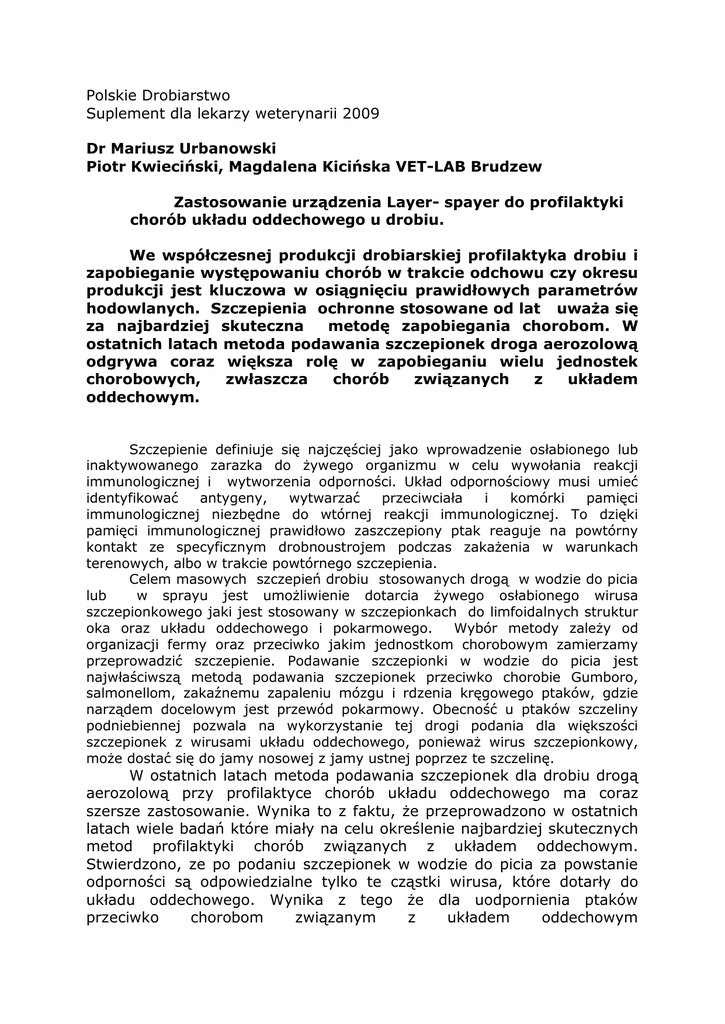 Polskie Drobiarstwo Suplement dla lekarzy weterynarii 2009 Dr Mariusz Urbanowski Piotr Kwieciński, Magdalena Kicińska VET-LAB Brudzew Zastosowanie urządzenia Layer- spayer do profilaktyki chorób układu oddechowego u drobiu. We współczesnej produkcji drobiarskiej profilaktyka drobiu i zapobieganie występowaniu chorób w trakcie odchowu czy okresu produkcji jest kluczowa w osiągnięciu prawidłowych parametrów hodowlanych. Szczepienia ochronne stosowane od lat uważa się za najbardziej skuteczna metodę zapobiegania chorobom. W ostatnich latach metoda podawania szczepionek droga aerozolową odgrywa coraz większa rolę w zapobieganiu wielu jednostek chorobowych, zwłaszcza chorób związanych z układem oddechowym. Szczepienie definiuje się najczęściej jako wprowadzenie osłabionego lub inaktywowanego zarazka do żywego organizmu w celu wywołania reakcji immunologicznej i wytworzenia odporności. Układ odpornościowy musi umieć identyfikować antygeny, wytwarzać przeciwciała i komórki pamięci immunologicznej niezbędne do wtórnej reakcji immunologicznej. To dzięki pamięci immunologicznej prawidłowo zaszczepiony ptak reaguje na powtórny kontakt ze specyficznym drobnoustrojem podczas zakażenia w warunkach terenowych, albo w trakcie powtórnego szczepienia. Celem masowych szczepień drobiu stosowanych drogą w wodzie do picia lub w sprayu jest umożliwienie dotarcia żywego osłabionego wirusa szczepionkowego jaki jest stosowany w szczepionkach do limfoidalnych struktur oka oraz układu oddechowego i pokarmowego. Wybór metody zależy od organizacji fermy oraz przeciwko jakim jednostkom chorobowym zamierzamy przeprowadzić szczepienie. Podawanie szczepionki w wodzie do picia jest najwłaściwszą metodą podawania szczepionek przeciwko chorobie Gumboro, salmonellom, zakaźnemu zapaleniu mózgu i rdzenia kręgowego ptaków, gdzie narządem docelowym jest przewód pokarmowy. Obecność u ptaków szczeliny podniebiennej pozwala na wykorzystanie tej drogi podania dla większości szczepionek z wirusami układu oddechowego, ponieważ wirus szczepionkowy, może dostać się do jamy nosowej z jamy ustnej poprzez te szczelinę. W ostatnich latach metoda podawania szczepionek dla drobiu drogą aerozolową przy profilaktyce chorób układu oddechowego ma coraz szersze zastosowanie. Wynika to z faktu, że przeprowadzono w ostatnich latach wiele badań które miały na celu określenie najbardziej skutecznych metod profilaktyki chorób związanych z układem oddechowym. Stwierdzono, ze po podaniu szczepionek w wodzie do picia za powstanie odporności są odpowiedzialne tylko te cząstki wirusa, które dotarły do układu oddechowego. Wynika z tego że dla uodpornienia ptaków przeciwko chorobom związanym z układem oddechowym najskuteczniejsza metoda podania szczepionek jest metoda aerozolowa, która daje szanse dotarcia do układu oddechowego jak największej ilości wirusa szczepionkowego. Zasadnicze znaczenie dla układu obronnego dróg oddechowych u ptaków ma aparat śluzowo-rzęskowy, który tworzą urzęsiony nabłonek i komórki kubkowe produkujące śluz. Gruczoł łzowy natomiast odpowiada za stan obronności głównie górnych odcinków układu oddechowego. W wyniku badań stwierdzono ,ze zasadnicza role w wysokiej efektywności szczepień aerozolowych odgrywa gruczoł Hardera. Usuniecie gruczołu Hardera powoduje ze ptaki, nie są w stanie wytworzyć odporności po podaniu szczepionek w sprayu. W związku z powyższym stosowanie szczepień drogą areozolową jest obecnie zalecane w przypadku szczepionek przeciwko chorobom układu oddechowego takich jak zakaźne zapalenie oskrzeli IB (Infectious Bronchitis), pomór rzekomy ND czy APV (Avian Pneumowirus). co sprzyja powstawaniu lokalnej i komórkowej odpowiedzi immunologicznej w oku, górnych partiach układu oddechowego, nozdrzach, zatokach i tchawicy. Prawidłowe przeprowadzenie szczepienia i wytworzeniu przez organizm ptaka odpowiedniej odporności poszczepiennej zależy od wielu czynników, które mogą spowodować brak lub niepełne nabycie przez ptaki ochrony przed chorobą. Przyczyną niepowodzenia w szczepieniu drobiu najczęściej jest niewłaściwa metoda użyta przez lekarza lub nieprawidłowa technika podawania szczepionek, lub też nieprawidłowy sprzęt uzyty do szczepień. Szczepienie ptaków które wykazują objawy chorobowe, lub mają uszkodzony układ odpornościowy może wpłynąć na skuteczność szczepienia. Jeżeli ptak jest prawidłowo zaszczepiony i jednocześnie jego układ odpornościowy jest w pełni sprawny to ta reakcja jest znacznie szybsza i bardziej skuteczna. Różne czynniki wpływają na uklad odpornościwy i mogą osłabić zdolność organizmu ptaka do prawidłowej reakcji na szczepionkę. Do czynników tych należą: zarządzanie fermą, jakość paszy, warunki srodowiskowe, presja szczepów terenowych, oddziaływanie immunosupresyjne, rodzaj szczepu szczepionkowego, zabezpieczenia przed czynnikami chrobotwórczymi, szeroko pojęta biosecurity fermy, wiek ptaków, droga i metoda podania szczepionki, uwarunkowania genetyczne. Program szczepień najczęściej zawodzi z powodu niewłaściwego momentu zastosowania szczepionki, kiedy obecne są przeciwciała matczyne, oraz nieprawidłowego lub niedokładnego jej podania. Zakażenie czynnikiem zakaźnym, który przełamuje uklad odpornościowy, zakażenie patogenem lub serotypem patogenu nieobecnego w szczepionce wpływa na powstawanie odporności. Wpływ na skuteczność szczepień może wywierać immunosupresja. Immunosupresja oznacza uszkodzenie układu odpornościowego i utratę zdolności organizmu do prawidłowego reagowania na podawane szczepionki. Powoduje to niedostateczne wytworzenie ilości przeciwciał dla ochrony przed zakażeniem wirusem terenowym przeciwko któremu je szczepimy. W przypadku szczepień przeciwko chorobom układu oddechowego powinniśmy wziąć pod uwagę również sytuację na fermie zwiazana z wystepowa
