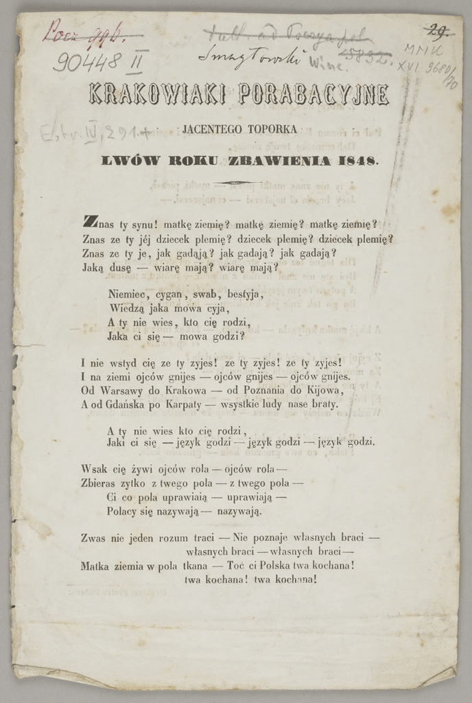 ' — P d T f_ 30M * t ^ & ff.4r' ‘ II fi JACENTEGO TOPORKA X n a s ty synu! matkę ziemię? matkę siemię ? matkę- ziefnię ? !11 Znas ze ty jej dziecek plemię? dziecek plemię? dziecek plemię? Znas ze ty ję, jak gadąją? jak gadają? jak gadają? Jaką dusę — wiarę mają? wiarę mają?v* MM Niemiec^ cygan 9 swab, bestyja, Wiedźą jaka indwa cyja, A ty nie wies? kio cię rodzi . Jaka ci się — mowa godzi? I nie wstyd cię ze ty^zyjesf’że % zyj^sT żeTfy I na ziemi ojców gnijes — ojców gnijes ojców gnijes. > Od Warsawy do Krakowa — od Poznania do Kijową, j A od Gdańska po Karpaty — wsystkie ludy nase braty. f A ty nie wies kto jcię rodzi , I g l , . .. J< Jaki ci się — język godzr-1^ jgzyk godzi —1językf godzi. Wsak cię żywi ojców rola — ojców rola — Zbieras żytko z twego pola — z twego pola — Gi co pola uprawiaią — uprawiają —• Polacy się nazywają— nazywają. Zwas nie jeden rozum traci — Nie poznaje własnych braci — własnych braci — własnych braci — Matka ziemia w pola tkana — Toć ci Polska twa kochana! twa kochana! twa kochana 1 W IŁ wI I W l Sśłfir KWOW ROM ZBAWIEHA <949. r V) H I Ł 4 A ty nie znas tój matule — tój matule — Z której mas chleb i kosule. Dał ci rozum Bóg nie lada — i dzieweckę i sąsiada. Dał ci matkę twoją ziemię, Byś znał jakie twoje plemię, A ty nie znas matki piersi — matki piersi, Jacy bracia ci najscersi — ci najscersi*— Niemiec — niemcem, toć niemowa, Nie wymówi twego słowa. Dla tegoć tez on — strażnikiem — on strażnikiem— Byś się nie znał bratku z nikiem — bratku z nikiem. A potyra twym językiem— twym językiem— ■ Bo go tak znie jak kozikiem — jak kozikiem. — A kiejć matka kołysała — kołysała, — Jakąż mową ci śpiewała?— ci śpiówała, Z cyjnj piersi ci ssać dała — ci ssać dała? Za nim ciebie uhusiała — uhusiała — A ty nie znas tego bratku 1 Ej Bóg skarzeć! nabierz statku — nabierz statku! — Wiedz co należy się komu—>znaj źe niemiec sromem domu. Boć omijać będę zdała— będę zdała, Ptaka, co swe gniazdo kala— gniazdo kala. m iV} ■Ę m M he!1 ha! ■ PPS mn : ■ iii; ® p s k i i ; Dru kiem Pio tra P il l t r a :