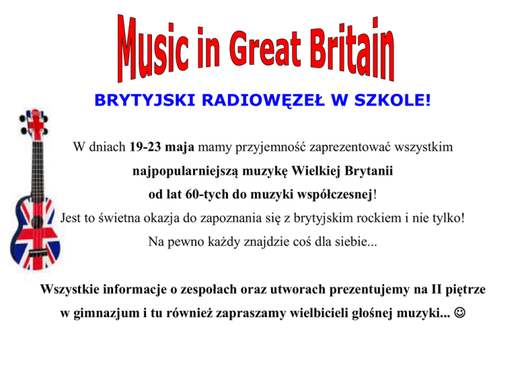 BRYTYJSKI RADIOWĘZEŁ W SZKOLE! W dniach 19-23 maja mamy przyjemność zaprezentować wszystkim najpopularniejszą muzykę Wielkiej Brytanii od lat 60-tych do muzyki współczesnej! Jest to świetna okazja do zapoznania się z brytyjskim rockiem i nie tylko! Na pewno każdy znajdzie coś dla siebie... Wszystkie informacje o zespołach oraz utworach prezentujemy na II piętrze w gimnazjum i tu również zapraszamy wielbicieli głośnej muzyki... Poniedziałek LATA 60-te DJ Piotrek Wtorek LATA 70-te DJ Mateusz Środa LATA 80-te DJ Emilka Czwartek LATA 90-te DJ Piotrek i DJ Mateusz Piątek muzyka WSPÓŁCZESNA DJ Emilka Projekt edukacyjny przygotowany przez uczniów klasy III gim. Kot Emilia, Krzewski Piotr, Stosio Mateusz Opiekun projektu: p. Katarzyna Pacek