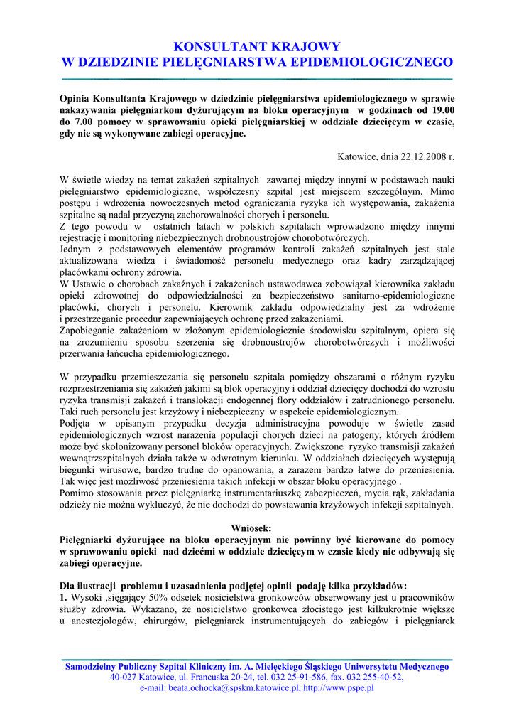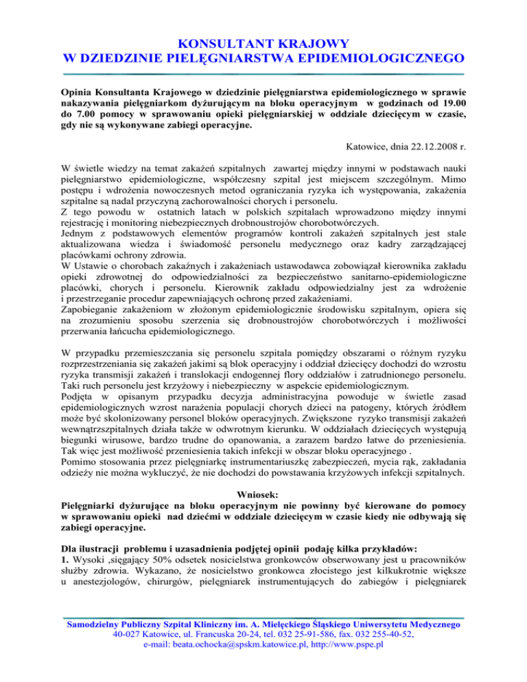 KONSULTANT KRAJOWY W DZIEDZINIE PIELĘGNIARSTWA EPIDEMIOLOGICZNEGO Opinia Konsultanta Krajowego w dziedzinie pielęgniarstwa epidemiologicznego w sprawie nakazywania pielęgniarkom dyŜurującym na bloku operacyjnym w godzinach od 19.00 do 7.00 pomocy w sprawowaniu opieki pielęgniarskiej w oddziale dziecięcym w czasie, gdy nie są wykonywane zabiegi operacyjne. Katowice, dnia 22.12.2008 r. W świetle wiedzy na temat zakaŜeń szpitalnych zawartej między innymi w podstawach nauki pielęgniarstwo epidemiologiczne, współczesny szpital jest miejscem szczególnym. Mimo postępu i wdroŜenia nowoczesnych metod ograniczania ryzyka ich występowania, zakaŜenia szpitalne są nadal przyczyną zachorowalności chorych i personelu. Z tego powodu w ostatnich latach w polskich szpitalach wprowadzono między innymi rejestrację i monitoring niebezpiecznych drobnoustrojów chorobotwórczych. Jednym z podstawowych elementów programów kontroli zakaŜeń szpitalnych jest stale aktualizowana wiedza i świadomość personelu medycznego oraz kadry zarządzającej placówkami ochrony zdrowia. W Ustawie o chorobach zakaźnych i zakaŜeniach ustawodawca zobowiązał kierownika zakładu opieki zdrowotnej do odpowiedzialności za bezpieczeństwo sanitarno-epidemiologiczne placówki, chorych i personelu. Kierownik zakładu odpowiedzialny jest za wdroŜenie i przestrzeganie procedur zapewniających ochronę przed zakaŜeniami. Zapobieganie zakaŜeniom w złoŜonym epidemiologicznie środowisku szpitalnym, opiera się na zrozumieniu sposobu szerzenia się drobnoustrojów chorobotwórczych i moŜliwości przerwania łańcucha epidemiologicznego. W przypadku przemieszczania się personelu szpitala pomiędzy obszarami o róŜnym ryzyku rozprzestrzeniania się zakaŜeń jakimi są blok operacyjny i oddział dziecięcy dochodzi do wzrostu ryzyka transmisji zakaŜeń i translokacji endogennej flory oddziałów i zatrudnionego personelu. Taki ruch personelu jest krzyŜowy i niebezpieczny w aspekcie epidemiologicznym. Podjęta w opisanym przypadku decyzja administracyjna powoduje w świetle zasad epidemiologicznych wzrost naraŜenia populacji chorych dzieci na patogeny, których źródłem moŜe być skolonizowany personel bloków operacyjnych. Zwiększone ryzyko transmisji zakaŜeń wewnątrzszpitalnych działa takŜe w odwrotnym kierunku. W oddziałach dziecięcych występują biegunki wirusowe, bardzo trudne do opanowania, a zarazem bardzo łatwe do przeniesienia. Tak więc jest moŜliwość przeniesienia takich infekcji w obszar bloku operacyjnego . Pomimo stosowania przez pielęgniarkę instrumentariuszkę zabezpieczeń, mycia rąk, zakładania odzieŜy nie moŜna wykluczyć, Ŝe nie dochodzi do powstawania krzyŜowych infekcji szpitalnych. Wniosek: Pielęgniarki dyŜurujące na bloku operacyjnym nie powinny być kierowane do pomocy w sprawowaniu opieki nad dziećmi w oddziale dziecięcym w czasie kiedy nie odbywają się zabiegi operacyjne. Dla ilustracji problemu i uzasadnienia podjętej opinii podaję kilka przykładów: 1. Wysoki ,sięgający 50% odsetek nosicielstwa gronkowców obserwowany jest u pracowników słuŜby zdrowia. Wykazano, Ŝe nosicielstwo gronkowca złocistego jest kilkukrotnie większe u anestezjologów, chirurgów, pielęgniarek instrumentujących do zabiegów i pielęgniarek Samodzielny Publiczny Szpital Kliniczny im. A. Mielęckiego Śląskiego Uniwersytetu Medycznego 40-027 Katowice, ul. Francuska 20-24, tel. 032 25-91-586, fax. 032 255-40-52, e-mail: [email protected], http://www.pspe.pl KONSULTANT KRAJOWY W DZIEDZINIE PIELĘGNIARSTWA EPIDEMIOLOGICZNEGO anestezjologicznych. Najczęściej zakaŜenie to jest przenoszone przez kontakt bezpośredni, ale takŜe drogą powietrzną. Gronkowce mogą powodować epidemie szpitalne, zdolność kolonizacji pacjentów i personelu oraz przetrwanie w środowisku szpitala jest zaleŜne od wielu czynników. EMRSA (epidemiczne szczepy gronkowca złocistego metycylinoopornego) są łatwo przenoszone między oddziałami, kolonizują osoby w powaŜnym stanie choroby, a takŜe małe dzieci. Cenne są badania przesiewowe u personelu wykonywane wyłącznie ze wskazań epidemiologicznych. Gronkowce złociste kolonizują nie tylko nozdrza, ale takŜe gardło i w przypadku nosicielstwa u personelu mogą być źródłem zakaŜenia podopiecznych. 2. DuŜym zagroŜeniem w szpitalach są paciorkowce. Rezerwuarem moŜe być zarówno personel jak i małe dzieci, u których nosicielstwo sięga 15-20%. Źródłem zakaŜeń paciorkowcem ropnym miejsca operowanego moŜe być członek zespołu operującego. 3. Kolejnym przykładem niebezpiecznych zakaŜeń przenoszonych róŜnymi drogami (nie tylko drogą kontaktową) są infekcje szpitalne wywołane dwoinką zapalenia płuc. ZakaŜenie te są częste u dzieci i szerzą się drogą kropelkową. 4. Poprzez ręce personelu szerzą się zarówno zakaŜenia epidemiczne oraz endemiczne .Pałeczki Gram (-) przeŜywają na skórze dłoni do dwóch godzin, ale zdarza się takŜe ich długotrwałe nosicielstwo nawet do 6 tygodni! Nie zawsze moŜemy liczyć na bezwzględne przestrzeganie procedury dekontaminacji rąk Z cytowanych w literaturze badań wynika, Ŝe nawyki personelu nadal nie są najlepsze, w 50% przypadków personel nie przestrzega zasady mycia rąk przed kontaktem z chorym! W obliczu opisanej sytuacji moŜna takŜe zadać pytania natury organizacyjno-prawnej: Jak przygotowana do pracy na oddziale dziecięcym jest instrumentariuszka? Czy instrumentariuszka wracając do zabiegu na blok zdąŜy na czas właściwie przygotować salę operacyjną? Kto poniesie odpowiedzialność za ewentualne błędy ? Jak zapisana jest odpowiedzialność i uprawnienia pielęgniarki instrumentariuszki bloku i jej uprawnienia do pracy w oddziale dziecięcym? Jak zabezpieczone są dzieci kiedy instrumentariuszka asystuje do operacji? Regulamin porządkowy szpitala określa przebieg procesu udzielania świadczeń zdrowotnych z zapewnieniem wł