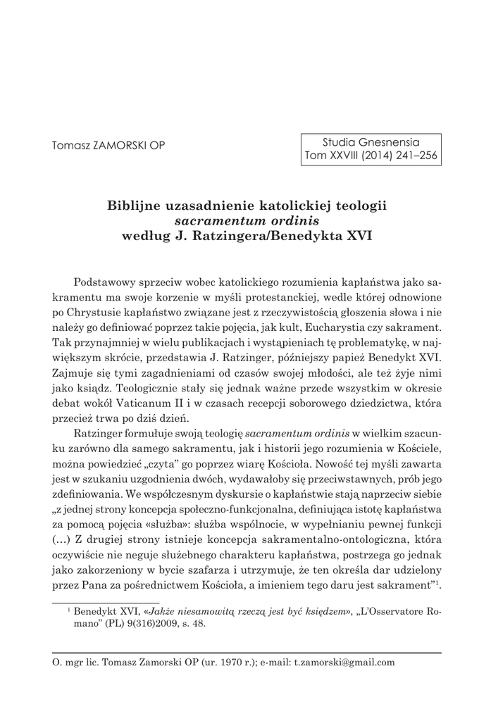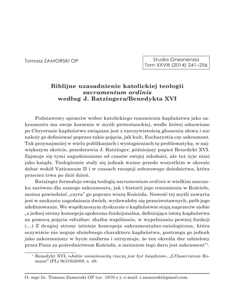 Tomasz ZAMORSKI OP Studia Gnesnensia Tom XXVIII (2014) 241–256 Biblijne uzasadnienie katolickiej teologii sacramentum ordinis według J. Ratzingera/Benedykta XVI Podstawowy sprzeciw wobec katolickiego rozumienia kapłaństwa jako sakramentu ma swoje korzenie w myśli protestanckiej, wedle której odnowione po Chrystusie kapłaństwo związane jest z rzeczywistością głoszenia słowa i nie należy go definiować poprzez takie pojęcia, jak kult, Eucharystia czy sakrament. Tak przynajmniej w wielu publikacjach i wystąpieniach tę problematykę, w największym skrócie, przedstawia J. Ratzinger, późniejszy papież Benedykt XVI. Zajmuje się tymi zagadnieniami od czasów swojej młodości, ale też żyje nimi jako ksiądz. Teologicznie stały się jednak ważne przede wszystkim w okresie debat wokół Vaticanum II i w czasach recepcji soborowego dziedzictwa, która przecież trwa po dziś dzień. Ratzinger formułuje swoją teologię sacramentum ordinis w wielkim szacunku zarówno dla samego sakramentu, jak i historii jego rozumienia w Kościele, można powiedzieć „czyta” go poprzez wiarę Kościoła. Nowość tej myśli zawarta jest w szukaniu uzgodnienia dwóch, wydawałoby się przeciwstawnych, prób jego zdefiniowania. We współczesnym dyskursie o kapłaństwie stają naprzeciw siebie „z jednej strony koncepcja społeczno-funkcjonalna, definiująca istotę kapłaństwa za pomocą pojęcia «służba»: służba wspólnocie, w wypełnianiu pewnej funkcji (…) Z drugiej strony istnieje koncepcja sakramentalno-ontologiczna, która oczywiście nie neguje służebnego charakteru kapłaństwa, postrzega go jednak jako zakorzeniony w bycie szafarza i utrzymuje, że ten określa dar udzielony przez Pana za pośrednictwem Kościoła, a imieniem tego daru jest sakrament”1. Benedykt XVI, «Jakże niesamowitą rzeczą jest być księdzem», „L’Osservatore Romano” (PL) 9(316)2009, s. 48. 1 O. mgr lic. Tomasz Zamorski OP (ur. 1970 r.); e-mail: [email protected] 242 Tomasz ZAMORSKI OP Podstawowy problem dla teologii katolickiej wynika z faktu niedowartościowania głoszenia słowa2 jako elementu konstytutywnego dla rozumienia kapłaństwa w Nowym Testamencie. Ratzinger podejmuje więc próbę przezwyciężenia tej antynomii (kapłaństwo dla Eucharystii – kapłaństwo posługą słowa), odnajdując w głoszeniu słowa element sakralizujący zarówno w niepowtarzalnej więzi kapłana/głosiciela z Chrystusem, jak i w samej naturze głoszenia, które jest ostatecznie złożeniem ofiary z siebie samego i uczestnictwem w inkarnacji Boskiego Logosu. W swoim tekście z 1972 r. pt. Kapłan jako pośrednik i sługa Jezusa w świetle nowotestamentalnej Nowiny3 Ratzinger zauważa, że dyskusja, która toczy się od lat „stała się już dawno wojną okopową, w której każdy potwierdza własną pozycję”4. Dlatego, jak pisze dalej, „wyłania się przekonanie, że tej dysputy nie da się rozstrzygnąć za pomocą argumentów, lecz jedynie na podstawie doświadczenia zrealizowanego życia, spełnionej posługi”5. Ma to być swego rodzaju „eksperyment życia”, a nie „konstrukcja myślowa”. Ten egzystencjalny postulat wyznacza swoistą granicę spekulacjom, nie pozbawiając ich jednak znaczenia, gdyż teologiczne określenie sacramentum ordinis w sposób istotny wpływa i modyfikuje tożsamość kapłańską. A ta współcześnie jest mocno nadwątlona i podatna na kryzysowe sytuacje wywołane zarówno przez teologiczną dezorientację, jak i niezrozumienie instytucji kapłaństwa we współczesnym świecie czy w końcu przez osłabienie, a nawet utratę wiary przez samych kapłanów. Wydaje się więc, że prześledzenie biblijnych wątków, uzasadniających katolickie rozumienie kapłaństwa w twórczości teologicznej Ratzingera, może stanowić swego rodzaju impuls dla nadziei i wiary w przezwyciężenie owego kryzysu i zagubienia. Redukcja kapłaństwa do tego wyłącznie elementu stanowi sedno podejścia społeczno-funkcjonalnego. 3 Tekst tego artykułu, napisanego z okazji jubileuszu 100-lecia Seminarium Duchownego św. Wolfganga przy kościele św. Jakuba w Ratyzbonie, po raz pierwszy został opublikowany w księdze jubileuszowej z tej okazji, znany jest jednak przede wszystkim z książki: Theologische Prinzipienlehre: Bausteine zur Fundamentaltheologie [w polskiej edycji: Formalne zasady chrześcijaństwa. Szkice do teologii fundamentalnej, tłum. W. Szymona, Poznań 2009, a także z tomu Głosiciele Słowa i słudzy Waszej radości. Teologia i duchowość sakramentu święceń (Opera Omnia, t. 12), red. K. Góźdź, M. Górecka, tłum. M. Górecka, M. Rodkiewicz (współpraca J. Kobienia, D. Petruk), Lublin 2012)] 4 J. Ratzinger, Głosiciele Słowa i Słudzy Waszej Radości, (Opera Omnia, t. 12), Lublin 2012 [dalej: GSiSWR], s. 101. 5 GSiSWR, s.101. 2 Biblijne uzasadnienie katolickiej teologii sacramentum ordinis 243 1.Źródła trudności Ratzinger konstatuje, że „w sporze o kapłaństwo ożyły argumenty okresu reformacji, które w połączeniu z wynikami nowoczesnej egzegezy obnażyły niewystarczające uzasadnienie teologii kapłaństwa po Vaticanum II”6. W swoich tekstach wyróżnia kilka podstawowych grup zarzutów-problemów7. Po pierwsze: Kościół do nazwania swoich nowych urzędów użył języka świeckiego, co utrudnia albo wręcz nie pozwala na dostrzeżenie ciągłości z instytucjami Starego Testamentu. Również dlatego, że w Nowym Testamencie pełniących posługi nazywano presbyteroi (starsi), a nie sacerdotes (hiereis). Nie ma więc powodu, żeby wracać do instytucji kapłaństwa i ofiar, które przynależą do porządku Starego Przymierza. Po drugie: urzędy w Nowym Testamencie nie mają precyzyjnych definicji, występują w różnych formach, w żadnym miejscu nie zostały związane z Eucharystią, a ich treścią było głoszenie Ewangelii i wspólnotowe posługi. Po trzecie: urząd kapłański, który w Starym Testamencie wynikał z