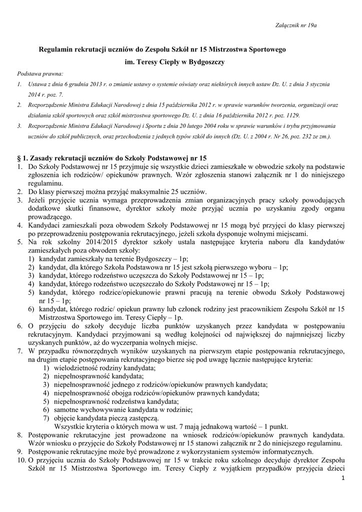 Załącznik nr 19a Regulamin rekrutacji uczniów do Zespołu Szkół nr 15 Mistrzostwa Sportowego im. Teresy Ciepły w Bydgoszczy Podstawa prawna: 1. Ustawa z dnia 6 grudnia 2013 r. o zmianie ustawy o systemie oświaty oraz niektórych innych ustaw Dz. U. z dnia 3 stycznia 2014 r. poz. 7. 2. Rozporządzenie Ministra Edukacji Narodowej z dnia 15 października 2012 r. w sprawie warunków tworzenia, organizacji oraz działania szkół sportowych oraz szkół mistrzostwa sportowego Dz. U. z dnia 16 października 2012 r. poz. 1129. 3. Rozporządzenie Ministra Edukacji Narodowej i Sportu z dnia 20 lutego 2004 roku w sprawie warunków i trybu przyjmowania uczniów do szkół publicznych, oraz przechodzenia z jednych typów szkół do innych (Dz. U. z 2004 r. Nr 26, poz. 232 ze zm.). § 1. Zasady rekrutacji uczniów do Szkoły Podstawowej nr 15 1. Do Szkoły Podstawowej nr 15 przyjmuje się wszystkie dzieci zamieszkałe w obwodzie szkoły na podstawie zgłoszenia ich rodziców/ opiekunów prawnych. Wzór zgłoszenia stanowi załącznik nr 1 do niniejszego regulaminu. 2. Do klasy pierwszej można przyjąć maksymalnie 25 uczniów. 3. Jeżeli przyjęcie ucznia wymaga przeprowadzenia zmian organizacyjnych pracy szkoły powodujących dodatkowe skutki finansowe, dyrektor szkoły może przyjąć ucznia po uzyskaniu zgody organu prowadzącego. 4. Kandydaci zamieszkali poza obwodem Szkoły Podstawowej nr 15 mogą być przyjęci do klasy pierwszej po przeprowadzeniu postępowania rekrutacyjnego, jeżeli szkoła dysponuje wolnymi miejscami. 5. Na rok szkolny 2014/2015 dyrektor szkoły ustala następujące kryteria naboru dla kandydatów zamieszkałych poza obwodem szkoły: 1) kandydat zamieszkały na terenie Bydgoszczy – 1p; 2) kandydat, dla którego Szkoła Podstawowa nr 15 jest szkołą pierwszego wyboru – 1p; 3) kandydat, którego rodzeństwo uczęszcza do Szkoły Podstawowej nr 15 – 1p; 4) kandydat, którego rodzeństwo uczęszczało do Szkoły Podstawowej nr 15 – 1p; 5) kandydat, którego rodzice/opiekunowie prawni pracują na terenie obwodu Szkoły Podstawowej nr 15 – 1p; 6) kandydat, którego rodzic/ opiekun prawny lub członek rodziny jest pracownikiem Zespołu Szkół nr 15 Mistrzostwa Sportowego im. Teresy Ciepły – 1p. 6. O przyjęciu do szkoły decyduje liczba punktów uzyskanych przez kandydata w postępowaniu rekrutacyjnym. Kandydaci przyjmowani są według kolejności od największej do najmniejszej liczby uzyskanych punktów, aż do wyczerpania wolnych miejsc. 7. W przypadku równorzędnych wyników uzyskanych na pierwszym etapie postępowania rekrutacyjnego, na drugim etapie postępowania rekrutacyjnego bierze się pod uwagę łącznie następujące kryteria: 1) wielodzietność rodziny kandydata; 2) niepełnosprawność kandydata; 3) niepełnosprawność jednego z rodziców/opiekunów prawnych kandydata; 4) niepełnosprawność obojga rodziców/opiekunów prawnych kandydata; 5) niepełnosprawność rodzeństwa kandydata; 6) samotne wychowywanie kandydata w rodzinie; 7) objęcie kandydata pieczą zastępczą. Wszystkie kryteria o których mowa w ust. 7 mają jednakową wartość – 1 punkt. 8. Postępowanie rekrutacyjne jest prowadzone na wniosek rodziców/opiekunów prawnych kandydata. Wzór wniosku o przyjęcie do Szkoły Podstawowej nr 15 stanowi załącznik nr 2 do niniejszego regulaminu. 9. Postępowanie rekrutacyjne może być prowadzone z wykorzystaniem systemów informatycznych. 10. O przyjęciu ucznia do Szkoły Podstawowej nr 15 w trakcie roku szkolnego decyduje dyrektor Zespołu Szkół nr 15 Mistrzostwa Sportowego im. Teresy Ciepły z wyjątkiem przypadków przyjęcia dzieci 1 zamieszkałych w obwodzie Szkoły Podstawowej nr 15, które są przyjmowane z urzędu. Przepis z ustępu 3 stosuje się. Wniosek o przyjęcie do szkoły w trakcie trwania roku szkolnego stanowi załącznik nr 6 do niniejszego regulaminu. § 2. Zasady rekrutacji uczniów do klasy pierwszej i do klasy czwartej Szkoły Podstawowej nr 69 Mistrzostwa Sportowego 1. Kandydaci do klasy pierwszej i czwartej Szkoły Podstawowej nr 69 Mistrzostwa Sportowego mogą być przyjęci do szkoły po przeprowadzeniu postępowania rekrutacyjnego. 2. Podczas postępowania rekrutacyjnego na rok szkolny 2014/2015 i rok szkolny 2015/2016 kryteria naboru ustala dyrektor szkoły. 3. Liczba uczniów w oddziale sportowym szkoły mistrzostwa sportowego jest uzależniona od możliwości zebrania uczniów o zbliżonym poziomie sportowym. 4. Do klasy pierwszej i do klasy czwartej Szkoły Podstawowej nr 69 Mistrzostwa Sportowego przyjmuje się kandydatów, którzy: 1) posiadają bardzo dobry stan zdrowia, potwierdzony orzeczeniem lekarskim o zdolności do uprawiania danego sportu wydanym przez lekarza specjalistę w dziedzinie medycyny sportowej lub innego uprawnionego lekarza, zgodnie z przepisami w sprawie trybu orzekania o zdolności do uprawiania danego sportu przez dzieci i młodzież do ukończenia 21. roku życia oraz przez zawodników pomiędzy 21. a 23. rokiem życia; 2) posiadają pisemną zgodę rodziców/ opiekunów prawnych na uczęszczanie kandydata do szkoły i oddziału; 3) uzyskali pozytywne wyniki prób sprawności fizycznej, na warunkach ustalonych przez polski związek sportowy właściwy dla danego sportu, w którym jest prowadzone szkolenie sportowe w danej szkole lub w danym oddziale. 5. W przypadku większej liczby kandydatów spełniających warunki, o których mowa w ust. 4, niż liczba wolnych miejsc w oddziale na pierwszym miejscu brane są pod uwagę wyniki prób sprawności fizycznej, o których mowa w ust. 4 p. 3. 6. W przypadku równorzędnych wyników uzyskanych na pierwszym etapie postępowania rekrutacyjnego, na drugim etapie postępowania rekrutacyjnego bierze się pod uwagę łącznie następujące kryteria: 1) wielodzietność rodziny kandydata; 2) niepełnosprawność kandydata; 3) niepełnosprawność jednego z rodziców/opiekunów prawnych kandydata; 4) niepełnosprawność obojga rod