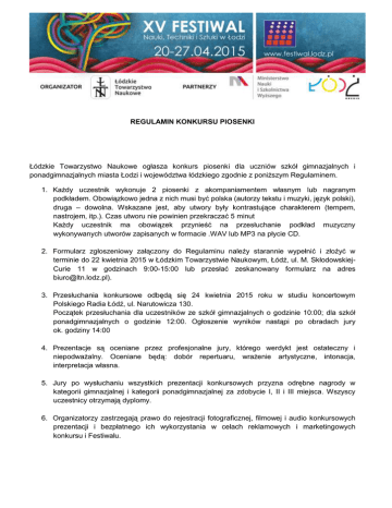REGULAMIN KONKURSU PIOSENKI Łódzkie Towarzystwo Naukowe ogłasza konkurs piosenki dla uczniów szkół gimnazjalnych i ponadgimnazjalnych miasta Łodzi i województwa łódzkiego zgodnie z poniższym Regulaminem. 1. Każdy uczestnik wykonuje 2 piosenki z akompaniamentem własnym lub nagranym podkładem. Obowiązkowo jedna z nich musi być polska (autorzy tekstu i muzyki, język polski), druga – dowolna. Wskazane jest, aby utwory były kontrastujące charakterem (tempem, nastrojem, itp.). Czas utworu nie powinien przekraczać 5 minut Każdy uczestnik ma obowiązek przynieść na przesłuchanie podkład muzyczny wykonywanych utworów zapisanych w formacie .WAV lub MP3 na płycie CD. 2. Formularz zgłoszeniowy załączony do Regulaminu należy starannie wypełnić i złożyć w terminie do 22 kwietnia 2015 w Łódzkim Towarzystwie Naukowym, Łódź, ul. M. SkłodowskiejCurie 11 w godzinach 9:00-15:00 lub przesłać zeskanowany formularz na adres [email protected]). 3. Przesłuchania konkursowe odbędą się 24 kwietnia 2015 roku w studiu koncertowym Polskiego Radia Łódź, ul. Narutowicza 130. Początek przesłuchania dla uczestników ze szkół gimnazjalnych o godzinie 10:00; dla szkół ponadgimnazjalnych o godzinie 12:00. Ogłoszenie wyników nastąpi po obradach jury ok. godziny 14:00 4. Prezentacje są oceniane przez profesjonalne jury, którego werdykt jest ostateczny i niepodważalny. Oceniane będą: dobór repertuaru, wrażenie artystyczne, intonacja, interpretacja własna. 5. Jury po wysłuchaniu wszystkich prezentacji konkursowych przyzna odrębne nagrody w kategorii gimnazjalnej i kategorii ponadgimnazjalnej za zdobycie I, II i III miejsca. Wszyscy uczestnicy otrzymają dyplomy. 6. Organizatorzy zastrzegają prawo do rejestracji fotograficznej, filmowej i audio konkursowych prezentacji i bezpłatnego ich wykorzystania w celach reklamowych i marketingowych konkursu i Festiwalu.