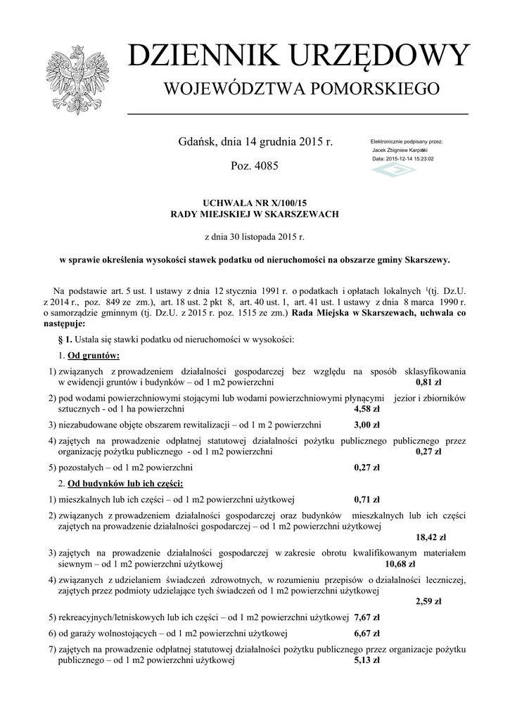 DZIENNIK URZĘDOWY WOJEWÓDZTWA POMORSKIEGO Gdańsk, dnia 14 grudnia 2015 r. Elektronicznie podpisany przez: Jacek Zbigniew Karpiński Poz. 4085 Data: 2015-12-14 15:23:02 UCHWAŁA NR X/100/15 RADY MIEJSKIEJ W SKARSZEWACH z dnia 30 listopada 2015 r. w sprawie określenia wysokości stawek podatku od nieruchomości na obszarze gminy Skarszewy. Na podstawie art. 5 ust. 1 ustawy z dnia 12 stycznia 1991 r. o podatkach i opłatach lokalnych 1(tj. Dz.U. z 2014 r., poz. 849 ze zm.), art. 18 ust. 2 pkt 8, art. 40 ust. 1, art. 41 ust. 1 ustawy z dnia 8 marca 1990 r. o samorządzie gminnym (tj. Dz.U. z 2015 r. poz. 1515 ze zm.) Rada Miejska w Skarszewach, uchwala co następuje: § 1. Ustala się stawki podatku od nieruchomości w wysokości: 1. Od gruntów: 1) związanych z prowadzeniem działalności gospodarczej bez względu na sposób sklasyfikowania w ewidencji gruntów i budynków – od 1 m2 powierzchni 0,81 zł 2) pod wodami powierzchniowymi stojącymi lub wodami powierzchniowymi płynącymi sztucznych - od 1 ha powierzchni 4,58 zł 3) niezabudowane objęte obszarem rewitalizacji – od 1 m 2 powierzchni jezior i zbiorników 3,00 zł 4) zajętych na prowadzenie odpłatnej statutowej działalności pożytku publicznego publicznego przez organizację pożytku publicznego - od 1 m2 powierzchni 0,27 zł 5) pozostałych – od 1 m2 powierzchni 0,27 zł 2. Od budynków lub ich części: 1) mieszkalnych lub ich części – od 1 m2 powierzchni użytkowej 0,71 zł 2) związanych z prowadzeniem działalności gospodarczej oraz budynków mieszkalnych lub ich części zajętych na prowadzenie działalności gospodarczej – od 1 m2 powierzchni użytkowej 18,42 zł 3) zajętych na prowadzenie działalności gospodarczej w zakresie obrotu kwalifikowanym materiałem siewnym – od 1 m2 powierzchni użytkowej 10,68 zł 4) związanych z udzielaniem świadczeń zdrowotnych, w rozumieniu przepisów o działalności leczniczej, zajętych przez podmioty udzielające tych świadczeń od 1 m2 powierzchni użytkowej 2,59 zł 5) rekreacyjnych/letniskowych lub ich części – od 1 m2 powierzchni użytkowej 7,67 zł 6) od garaży wolnostojących – od 1 m2 powierzchni użytkowej 6,67 zł 7) zajętych na prowadzenie odpłatnej statutowej działalności pożytku publicznego przez organizacje pożytku publicznego – od 1 m2 powierzchni użytkowej 5,13 zł Dziennik Urzędowy Województwa Pomorskiego –2– Poz. 4085 _______________________________________________________________________________________________________________ 8) pozostałych – od 1 m2 powierzchni użytkowej 5,13 zł 3. Od budowli 2 % ich wartości określonej na podstawie art. 4 ust. 1 pkt 3 i ust. 3-7 ustawy. § 2. Wykonanie uchwały powierza się Burmistrzowi Skarszew. § 3. Traci moc uchwała Nr XXXVIII/307/13 Rady Miejskiej w Skarszewach z dnia 28 listopada 2013 r. w sprawie wysokości stawek podatku od nieruchomości na obszarze gminy Skarszewy. § 4. Uchwała wchodzi w życie po upływie 14 dni od dnia jej ogłoszenia w Dzienniku Urzędowym Województwa Pomorskiego i ma zastosowanie od 01 stycznia 2016 roku. Przewodniczący Rady Józef Kamiński 1] Niniejsza ustawa dokonuje w zakresie swojej regulacji wdrożenia następujących dyrektyw Wspólnot Europejskich : 1.dyrektywy 92/106/EWG z dnia 7 grudnia 1992 r. w sprawie ustanowienia wspólnych zasad dla niektórych typów transportu kombinowanego towarów między państwami członkowskimi (Dz.Urz. WE L 368 z 17.12.1992 r.), 2.dyrektywy 1999/62/WE z dnia 17 czerwca 1999 r. w sprawie pobierania opłat za użytkowanie niektórych typów infrastruktury przez pojazdy ciężarowe (Dz.Urz. WE L 187 z 20.07.1999 r.). Dane dotyczące ogłoszenia aktów prawa Unii Europejskiej, zamieszczone w niniejszej ustawie – z dniem uzyskania przez Rzeczpospolitą Polską członkostwa w Unii Europejskiej – dotyczą ogłoszenia tych aktów w Dzienniku Urzędowym Unii Europejskiej – wydanie specjalne.