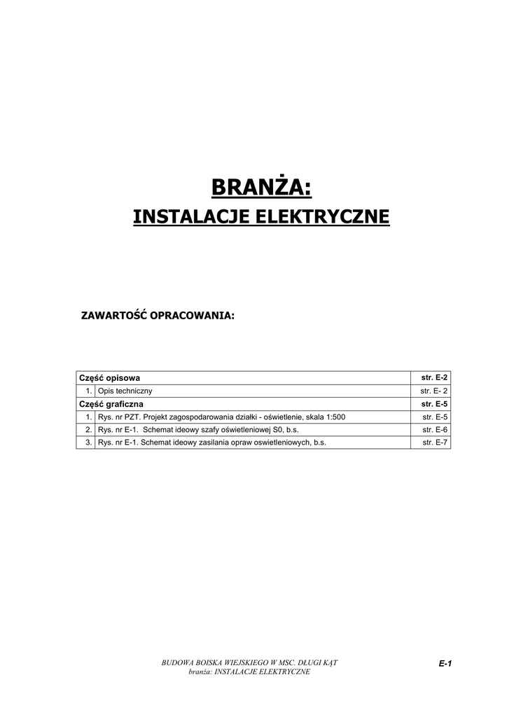 BRANŻA: INSTALACJE ELEKTRYCZNE ZAWARTOŚĆ OPRACOWANIA: Część opisowa str. E-2 1. Opis techniczny str. E- 2 Część graficzna str. E-5 1. Rys. nr PZT. Projekt zagospodarowania działki - oświetlenie, skala 1:500 str. E-5 2. Rys. nr E-1. Schemat ideowy szafy oświetleniowej S0, b.s. str. E-6 3. Rys. nr E-1. Schemat ideowy zasilania opraw oswietleniowych, b.s. str. E-7 BUDOWA BOISKA WIEJSKIEGO W MSC. DŁUGI KĄT branża: INSTALACJE ELEKTRYCZNE E-1 OPIS TECHNICZNY 1. Dane ogólne Inwestor: Gmina Lelis 07-402 Lelis, ul. Szkolna 37 Adres inwestycji: Długi Kąt działka Nr 578, obręb Długi Kąt, gm. Lelis 2. Podstawa opracowania wypis i wyrys z Miejscowego Planu Zagospodarowania Przestrzennego Gminy Lelis (Uchwała nr VII/41/03 Rady Gminy Lelis z dnia 28.08.2003 r.); oświadczenie o posiadanym prawie do dysponowania nieruchomością na cele budowlane; mapa do celów projektowych w skali 1:500; obowiązujące przepisy Prawa budowlanego i Praw pokrewnych literatura przedmiotu pomiary inwentaryzacyjne i wizja terenu ustalenia i uzgodnienia z inwestorem. 3. Przedmiot opracowania Przedmiotem opracowania jest budowa oświetlenia boiska wiejskiego w msc. Długi Kąt, gm. Lelis na działce o numerze ewidencyjnym nr 578. W zakres inwestycji wchodzą: Zasilenie oświetlenia Budowa linii kablowych 0,4 kV Montaż szafy oświetleniowej S0 Oświetlenie boiska Instalacja odgromowa Instalacja zasilania pompy nawadniającej Instalacja oświetleniowa i siłowa 4. Opis robót Zasilenie oświetlenia Wykonać zasilanie zgodnie z warunkami technicznymi PGE DYSTRYBUCJA S.A. i załączonym rysunkiem Budowa linii kablowych 0,4 kV 2 Z szafy S0 wyprowadzić dwa obwody linii kablowej YKY 5x6 mm . Kabel ułożyć na głębokości 0,7 m na podsypce piaskowej. Na trasie i załomach ustawić oznaczniki kablowe „K”. Dla ochrony przeciwporażeniowej ułożyć bednarkę ocynkowaną 2 25x4mm . Wszystkie kable oświetleniowe układać na podsypce piaskowej, na głębokości 0,6 m. Przy skrzyżowaniach z innymi instalacjami kable prowadzić w rurach ochronnych. Na końcach rur oraz co 10 m oznaczyć kable. Przy słupach zostawić zapasy min. 1,5 m. Przed przystąpieniem do robót sprawdzić istniejące czynne kable i w razie ich istnienia roboty prowadzić ręcznie. Dla ochrony kabli użyć folii niebieskiej. Przed zasypaniem zinwentaryzować trasy kabli przez uprawnionego geodetę. BUDOWA BOISKA WIEJSKIEGO W MSC. DŁUGI KĄT branża: INSTALACJE ELEKTRYCZNE E-2 Szafa oświetleniowa S0 Punkt sterowania oświetlenia S0 jest wykonany jako rozdzielnia na ścianie budynku gospodarczego na bazie obudowy „EMITER”. 2 Zasilanie PSO wykonać kablem YKY 5x10 mm ze złącza kablowego ZKP zgodnie ze schematem. Kabel ułożyć na głębokości 0,7m na podsypce piaskowej. Na trasie i załomach ustawić oznaczniki kablowe „K”. Przed zasypaniem należy kabel zinwentaryzować. Dla ochrony przeciwporażeniowej 2 ułożyć bednarkę ocynkowaną 30x4mm od tablicy PSO do ZKP. Oświetlenie boiska Oświetlenie boiska zaprojektowano na słupach okrągłych stalowych o wysokości 11 m przy zastosowaniu opraw oświetleniowych typu LED o mocy 136W. Oświetlenie to służyć ma dla celów treningowych i rekreacyjnych. Sterowanie oświetleniem odbywać się będzie ręcznie za pomocą wyłączników umieszczonych w tablicy oświetleniowej. Słup stalowy okrągły 11m, malowany proszkowo Fundament - FBw-150, - stopka 220/300mm Instalacja odgromowa Zgodnie z PN-92/E-05003 Ochrona odgromowa obiektów budowlanych – jako zwody pionowe wykorzystano słupy oświetleniowe boiska .W strefie ochronnej mieszczą się piłkochwyty, bramki i ławki. W związku z tym należy uziemić wszystkie słupy stalowe oraz znajdujące się w strefie boisk konstrukcje metalowe (ogrodzenia i konstrukcje urządzeń sportowych). Uziemienie to należy 2 wykonać bednarką ocynkowaną przekroju 25x4mm . Instalacja zasilania pompy nawadniającej Pompę w studni zasilić przewodem YDY 5x4 mm2. Dla ochrony przeciwporażeniowej ułożyć 2 bednarkę ocynkowaną 25x4mm . Szafę sterowniczą nawadniania zamontować w pomieszczeniu gospodarczym. Instalacja oświetleniowa i siłowa Oświetlenie budynku gospodarczego Instalację wykonać jako podtynkową przewodami YDY 3x1,5 mm2. Zastosować osprzęt hermetyczny. Zamontować oprawy typu plafon z żarówkami energooszczędnymi. Instalacja gniazd wtykowych Instalację wykonać jako podtynkową przewodami YDY 3x2,5 mm2. Zastosować osprzęt hermetyczny. 5. Obliczenia Zestawienie mocy zainstalowanej i zapotrzebowanej Oświetlenie budynku gospodarczego - 0,61 kW x 0,8 = 0,49 kW Oświetlenie boiska – 1,36 kW x 1,0 = 1,36 kW Gniazda budynku gospodarczego – 3,0 kW x 0,8 = 2,4 kW Nawadnianie boiska – 5,5 kW x 1.0 = 5,5 kW Razem 9,75 kW kW BUDOWA BOISKA WIEJSKIEGO W MSC. DŁUGI KĄT branża: INSTALACJE ELEKTRYCZNE E-3 Obliczenia prądu znamionowego = In 9,75 ⋅ 10 3 3 ⋅ 400 ⋅ 0,77 <20 A 2 Dobieram przewód zasilający od złącza ZKP do tablicy S0 YKY 5x10mm . 1.warunek In<Ib=32A<50,0A Iz=56A<145A dla t=1h Czyli warunki doboru kabla zasilającego są spełnione. Sprawdzenie skuteczności ochrony wyłącznika różnicowoprądowego Rezystancja dopuszczalna , zgodnie z pkt. 29.2 Dz. U. nr 81z 1990r R= UL 20 = = 667 Ω 1.2 ⋅ ∆I 0,03 ∆I -prąd różnicowy wyłączający UL -napięcie bezpieczne dla warunków środowiskowych nr 2 Oporność przewodów obwodów impedancji nie może przekraczać 1 Ohm. Obliczona powyżej rezystancja obwodu w porównaniu z wypadkową opornością wspólnego uziomu budynku (max.50,0 Ω ), prąd różnicowy 30mA wyłącznika spełnia wymagania skuteczności ochrony. 6. Ochrona przeciwporażeniowa i przeciwprzepięciowa Jako podstawową ochronę przeciwporażeniową przed bezpośrednim dotykiem zastosowano izolowanie części czynnych i izolowane obudowy ochronne. Ochronę przeciwporażeniową dodatkową realizuje się przez szybkie samoczynne wyłączenie zasilania odpowiednie do systemu TN-S. Pr
