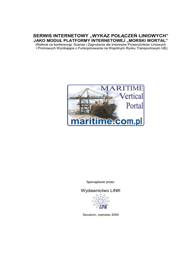SERWIS INTERNETOWY „WYKAZ POŁĄCZEŃ LINIOWYCH” JAKO MODUŁ PLATFORMY INTERNETOWEJ „MORSKI WORTAL” (Referat na konferencję: Szanse i Zagrożenia dla Interesów Przewoźników Liniowych i Promowych Wynikające z Funkcjonowania na Wspólnym Rynku Transportowym UE) Sporządzone przez: Wydawnictwo LINK Szczecin, czerwiec 2004 SERWIS INTERNETOWY „WYKAZ POŁĄCZEŃ LINIOWYCH” JAKO MODUŁ PLATFORMY INTERNETOWEJ „MORSKI WORTAL” SPIS TREŚCI: Wstęp.................................................................................................................................... 2 Miejsce modułu Wykaz Połączeń Liniowych w Morskim Wortalu........................................ 3 Opis serwisu Wykaz Połączeń Liniowych - Liner Services Sailing Schedule......................... 5 Konsekwencje wynikające z zamieszczenia serwisu Wykaz Połączeń Liniowych na Morskim Wortalu. .......................................................................................................... 10 Bariery i zagrożenia hamujące rozwój projektów internetowych. ........................................ 11 Oferta dla zainteresowanych uczestniczeniem w realizacji projektów: internetowy serwis Wykaz Połączeń Liniowych oraz platforma internetowa Morski Wortal..................................................................................................................... 13 Podsumowanie .................................................................................................................... 14 Wstęp Początki XXI wieku to czasy globalizacji. Można powiedzieć, że ziściła się przepowiednia, iż komputery będą tworzyć coraz lepsze komputery, zaś te lepsze komputery będą tworzyć jeszcze lepsze… itd. Niespotykane do tej pory tempo rozwoju nauki i techniki jest wymuszane głównie przez komputeryzację, której zasadniczym elementem staje się w ostatnich latach Internet. Możliwości sprzętu komputerowego (Tab.1) i oprogramowania zwiększają się niemal z dnia na dzień. 1991 Szybkość procesora [Mhz] RAM [MB] HDD [MB] FDD/DVD [MB] 2000 2001 2002 2003 2004 Krotność wzrostu 2004/1991 10 400 850 1600 2100 2600 260 1 64 128 256 256 512 512 10 6 000 40 000 40 000 80 000 160 000 16 000 0,36 1,40 700 700 700 4 700 13 056 Tab. 1. Zmiany podstawowych parametrów określających moc komputera uważanego za standard na przestrzeni ostatnich 15 lat. Komputery są coraz wydajniejsze, oprogramowanie coraz bardziej łatwe do opanowania przez użytkowników (przyjazne środowiska, intuicyjne interfejsy), dzięki czemu stało się możliwe zastosowanie w biznesie takich rozwiązań, które jeszcze parę lat temu zdawały się należeć do obszaru science fiction (telekonferencje, transmisja obszernych wielotomowych dokumentacji, dokonywanie przelewów bankowych przez telefon komórkowy, wirtualne prezentacje multimedialne, etc.). Globalizację charakteryzuje koncentracja zasobów i specjalizacja. Właściwe połączenie tych cech umożliwia osiągnięcie wysokiej wydajności, głównie przez obniżenie kosztów. Zapewnienie dobrej jakości produktu i doskonała organizacja pracy to warunki konieczne do utrzymania się na dzisiejszym rynku. LINK, Energetyków 3/4, 70-656 SZCZECIN, POLAND, T/F: +48 (91) 4623414, [email protected] 2 SERWIS INTERNETOWY „WYKAZ POŁĄCZEŃ LINIOWYCH” JAKO MODUŁ PLATFORMY INTERNETOWEJ „MORSKI WORTAL” Jak nigdy do tej pory sukces firmy zależy od dostępu do właściwych informacji. Dotyczy to również gospodarki morskiej, ze względu na dużą ilość nie zawsze tanich pośredników, szybki rozwój nowych technik i ogromną konkurencję. WWW1 (World Wide Web) to nieograniczony zbiór różnorakich informacji. Niestety w chwili obecnej przypomina nieco wieżę Babel. Nauczenie się tworzenia prostych witryn internetowych i zamieszczenie ich w Internecie zajmuje kilkadziesiąt godzin. Koszty stałego dostępu do Internetu, wykupienia domeny i opublikowania własnej strony w WWW kształtują się na poziomie kilkuset złotych. Miliony fanatyków internetowych od paru lat spędza po kilka, kilkanaście godzin dziennie przy komputerach i umieszcza w sieci ogromne ilości witryn. Wiele z nich zawiera nawet sporo ciekawych i przydatnych informacji. Jednak informacje te podane są w sposób nieprzemyślany i nieuporządkowany (znamienne jest zapełnianie witryn nieprzemyślanymi linkami 2 - podstawowy błąd większości portali). Powoduje to powstanie internetowego chaosu, który często skutkuje trudnością3 w odszukaniu informacji. Porządkowanie i należyte wykorzystanie Internetu do celów biznesowych winno być przeprowadzane przez tandem: fachowcy z danej branży + informatycy i skutkować powstaniem profesjonalnych specjalistycznych wortali. Wortale te winny być połączone między sobą funkcjonalnymi linkami oraz zawierać znormalizowane i sklasyfikowane kody umożliwiające znalezienie przez ogólnoświatowe wyszukiwarki4 prawidłowej, jednoznacznej odpowiedzi. Przy tworzeniu wortali dominować powinni branżowi praktycy (a nie jak do tej pory informatycy!), gdyż tylko oni mogą wskazać, jak ma działać i jakie informacje powinien zawierać dany wortal, aby był przydatny dla funkcjonowania danej branży i przynosił wymierne korzyści. Wydawnictwo LINK specjalizuje się w dostarczaniu informacji z dziedziny gospodarki morskiej. Publikowane corocznie od 11 lat informatory LINK’a znalazły uznanie wśród polskich i zagranicznych firm morskich. Widząc, że Internet w ostatnich latach stał się jednym z najważniejszych źródeł informacji, rozpoczęliśmy w roku 2001 tworzenie specjalistycznej morskiej platformy internetowej MORSKI WORTAL –MARITIME VERTICAL PORTAL МОРСКОЙ ВОРТАЛЬ Miejsce modułu Wykaz Połączeń Liniowych w Morskim Wortalu Platforma internetowa Morski Wortal zawiera kilkadziesiąt specjalistycznych serwisów (modułów) internetowych dotyczących gospodarki morskiej. Moduły te połączone są w
