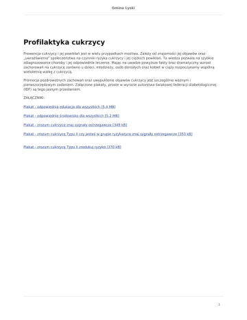 Gmina Lyski Profilaktyka cukrzycy Prewencja cukrzycy i jej powikłań jest w wielu przypadkach możliwa. Zależy od znajomości jej objawów oraz „uwrażliwienia" społeczeństwa na czynniki ryzyka cukrzycy i jej ciężkich powikłań. Ta wiedza pozwala na szybkie zdiagnozowanie choroby i jej odpowiednie leczenie. Mając na uwadze powyższe fakty oraz dramatyczny wzrost zachorowań na cukrzycę zarówno u dzieci, młodzieży, osób dorosłych oraz kobiet w ciąży rozpoczynamy wspólną wieloletnią walkę z cukrzycą. Promocja pozdrowotnych zachowań oraz uwypuklenie objawów cukrzycy jest szczególnie ważnym i pierwszorzędowym zadaniem. Załączone plakaty, proste w wyrazie autorstwa światowej federacji diabetologicznej (IDF) są tego jasnym przesłaniem. ZAŁĄCZNIKI: Plakat - odpowiednia edukacja dla wszystkich [5.4 MB] Plakat - odpowiednie środowisko dla wszystkich [5.2 MB] Plakat - zrozum cukrzycę znaj sygnały ostrzegawcze [349 kB] Plakat - zrozum cukrzycę Typu II czy jesteś w grupie ryzykazycę znaj sygnały ostrzegawcze [353 kB] Plakat - zrozum cukrzycę Typu II zredukuj ryzyko [370 kB] 1