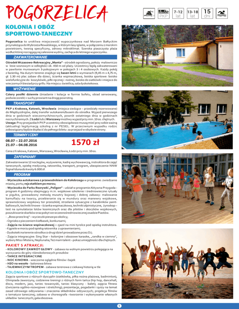 POGORZELICA PKP KOLONIA I OBÓZ SPORTOWO-TANECZNY Pogorzelica to urokliwa miejscowość wypoczynkowa nad Morzem Bałtyckim przynależąca do Wybrzeża Rewalskiego, w którym lasy iglaste, w połączeniu z morskim powietrzem, tworzą specyficzny, zdrowy mikroklimat. Szeroka piaszczysta plaża wzdłuż której rozciągają się zalesione wydmy, zachęca do letniego wypoczynku. ZAKWATEROWANIE Ośrodek Wczasowo-Rekreacyjny „Manta” - ośrodek ogrodzony, położy malowniczo w lesie sosnowym w odległości ok. 450 m od plaży. Uczestnicy będą zakwaterowani w pawilonie murowanym 3-pokojowym w pokojach 3 i 4 osobowych. Każdy pokój z łazienką. Na dużym terenie znajduje się basen letni o wymiarach (9,45 m x 4,75 m, gł. 1.30 m) plac zabaw dla dzieci, ścianka wspinaczkowa, boiska sportowe: boisko wielofunkcyjne do koszykówki, piłki ręcznej i nożnej, boisko do siatkówki i miejsce do wieczornych biesiad przy grillu. Na miejscu: świetlica, sala dyskotekowa. WYŻYWIENIE Cztery posiłki dziennie (śniadanie i kolacja w formie bufetu, obiad serwowany, podwieczorek) + suchy prowiant na drogę powrotną. TRANSPORT PKP z Krakowa, Katowic, Wrocławia (miejsca siedzące – przedziały rezerwowane) do Międzyzdrojów, dalej transfer autokarem/busem do ośrodka. Wyjazd pierwszego dnia w godzinach wieczornych/nocnych, powrót ostatniego dnia w godzinach nocnych/rannych. Z Łodzi lub z Warszawy możliwy wyjazd przy min. 10 os. chętnych. Uwaga: Przy przejazdach PKP uczestnicy obowiązkowo muszą mieć przy sobie ważną (aktualną) legitymację szkolną z nr PESEL. W przeciwnym wypadku rodzic zobowiązany będzie dopłacić do pełnego biletu za przejazd w obydwie strony. TERMINY I CENY 08.07 – 22.07.2016 21.07 – 04.08.2016 1570 zł Cena z Krakowa, Katowic, Warszawy, Wrocławia, Łodzi przy min. 10 os. ZAPEWNIAMY Zakwaterowanie 12 noclegów, wyżywienie, kadrę wychowawczą, instruktora do zajęć tanecznych, opiekę medyczną, ratownika, transport, program, ubezpieczenie NNW Signal Iduna do kwoty 6.000 zł. PROGRAM - Wycieczka autokarowa z przewodnikiem do Kołobrzegu w programie: zwiedzanie miasta, portu; rejs statkiem po morzu; - Wycieczka do Parku Rozrywki „Poligon” - udział w programie Aktywna Przygoda program 4 godzinny obejmujący m.in. wojskowe szkolenie i średniowieczne rytuały w pigułce, prowadzony metodą musztry bojowej i dobrej zabawy: malowanie kamuflażu na twarzy, przebieranie się w mundury oraz manewry wojskowe, sprawnościowy wojskowy tor przeszkód, strzelanie sytuacyjne z karabinków paintballowych, techniki linowe – ścianka wspinaczkowa, techniki alpinistyczne, żyroskop – test na symulatorze lotów kosmicznych oraz dla pilotów i skoczków wojskowych, poszukiwanie skarbów oraz pobyt we wczesnośredniowiecznej osadzie Piastów. - „Boso przez kraj” – wycieczki piesze po okolicy; - Ognisko z pieczeniem kiełbasek, konkursami; - Zajęcia na ściance wspinaczkowej + zjazd na mini tyrolce pod opieką instruktora. - Kąpiele w morzu pod opieką ratownika z uprawnieniami; - Dyskoteki na terenie ośrodka co drugi dzień prowadzone przez DJ; - Zajęcia integracyjne: Sing Star – kolonijne i obozowe karaoke, „randka w ciemno”, wybory Miss i Mistera, Neptunalia; Też mam talent – pokaz umiejętności dla chętnych. PAKIET 5 ATRAKCJI: - KOLOROWY ZAWRÓT GŁOWY - zabawa na wolnym powietrzu polegająca na wyrzucaniu do góry różnokolorowych proszków - TAŃCE INTEGRACYJNE - NOC KINOWA - wieczorne oglądnie filmów i bajek - H2O na wesoło - balonowa bitwa - TAJEMNICZYM TROPEM - zabawa terenowa z ciekawą historią w tle KOLONIA I OBÓZ SPORTOWO-TANECZNY Zajęcia sportowe z różnych dyscyplin (siatkówka, piłka nożna plażowa, badminton), Olimpiada Jaworzyny, codzienne treningi z różnych form tańca (hip hop, dancehall, disco, modern, jazz, taniec towarzyski, taniec klasyczny - balet); zajęcia fitness (ćwiczenia ogólno-rozwojowe i stretching); prezentacje, pogadanki i quizy na temat zasad zdrowego odżywiania i znaczenia składników odżywczych; projekcja filmów o tematyce tanecznej; zabawa w choreografa –tworzenie i wykonywanie własnych układów tanecznych; gala obozowa. 5 7-12 13-18 lat lat 15 dni