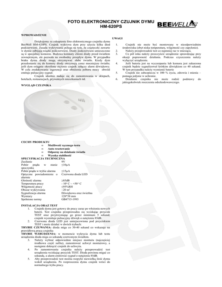 FOTO ELEKTRONICZNY CZUJNIK DYMU HM-620PS WPROWADZENIE UWAGI Dziękujemy za zakupienie foto elektronicznego czujnika dymu BeeWell HM-620PS. Czujnik wykrywa dym przy użyciu kilku diod podczerwieni. Zasada wykrywania polega na tym, że cząsteczki zawarte w dymie odbijają wiązki podczerwieni. Diody podczerwieni umieszczone są w specjalnej komorze. Budowa komnaty chroni diody przed światłem zewnętrznym, ale pozwala na swobodny przepływ dymu. W przypadku braku dymu diody mogą otrzymywać słabe światło. Kiedy dym przedostanie się do komory diody otrzymują coraz mocniejsze światło; jeśli dym osiągnie określone stężenie czujnik załączy alarm dźwiękowy. W celu zredukowania ingerencji oraz obniżenia poboru mocy obwód emituje pulsacyjny sygnał. Czujnik idealnie nadaje się do zamontowania w sklepach, hotelach, restauracjach, prywatnych mieszkaniach itd. WYGLĄD CZUJNIKA CECHY PRODUKTU • Możliwość ręcznego testu • Auto resetowanie • Odporny na działanie światła • Wysoka stabilność SPECYFIKACJA TECHNICZNA Zasilanie 9V Pobór prądu w stanie ≤10µA spoczynku Pobór prądu w trybie alarmu ≤15µA Optyczne powiadomienie o Czerwona dioda LED alarmie Głośność alarmu ≥85dB Temperatura pracy - 10o C ~ +50 o C Wilgotność pracy ≤95%RH Obszar wykrywania ~20 m2 Sygnalizacja alarmu Dźwiękowa oraz świetlna Wymiary 128*38 mm Spełnione normy GB4715-1993 INSTALACJA ORAZ TEST 1. Czujnik dymu jest gotowy do pracy zaraz po włożeniu nowych baterii. Test czujnika przeprowadza się wciskając przycisk TEST oraz przytrzymując go przez minimum 5 sekund; czujnik wyemituje pulsacyjny dźwięk o natężeniu 85dB. 2. Czerwona dioda LED jest umiejscowiona pod przyciskiem TEST i może działać w dwóch trybach: TRYBIE CZUWANIA: dioda miga co 30-40 sekund co wskazuje na prawidłową pracę czujnika TRYBIE WZBUDZENIA: w momencie wykrycia dymu lub testu urządzenia dioda miga co sekundę czerwonym światłem. 3. Należy wybrać odpowiednie miejsce montażu (najczęściej środkowa część sufitu), zamontować uchwyt montażowy, a następnie dokręcić czujnik do uchwytu. 4. Po zamontowaniu czujnika należy przeprowadzić test urządzenia wciskając przycisk TEST. Dioda powinna migać co sekundę, a alarm emitować sygnał o natężeniu 85dB. 5. Aby przeprowadzić test można rozpylić niewielką ilość dymu wokół urządzenia. Po rozproszeniu dymu czujnik wróci do normalnego trybu pracy. 1. 2. 3. 4. 5. 6. Czujnik nie może być montowany w nieodpowiednim środowisku (zbyt niska temperatura, wilgotność czy zapylenie). Należy przeprowadzić test co najmniej raz w miesiącu. Co pół roku należy przeczyścić urządzenie sprawdzając przy okazji poprawność działania. Podczas czyszczenia należy wyłączyć urządzenie. Jeśli bateria jest na wyczerpaniu lub komora jest zakurzona czujnik będzie sygnalizował krótkim dźwiękiem co 40 sekund. W tym przypadku należy wymienić baterie Czujnik nie zabezpiecza w 100 % życia, zdrowia i mienia – pomaga jedynie w ochronie. Działanie czujnika nie może rodzić podstawy do jakiegokolwiek roszczenia odszkodowawczego.