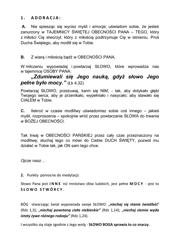1. ADORACJA: A. Nie spiesząc się wycisz myśli i emocje; uświadom sobie, że jesteś zanurzony w TAJEMNICY ŚWIĘTEJ OBECNOŚCI PANA – TEGO, który z miłości Cię stworzył, który z miłością podtrzymuje Cię w istnieniu. Proś Ducha Świętego, aby modlił się w Tobie. B. Z wiarą i miłością bądź w OBECNOŚCI PANA. W milczeniu wypowiadaj i powtarzaj SŁOWO, które wprowadza nas w tajemnicę OSOBY PANA: „Zdumiewali się Jego nauką, gdyż słowo Jego pełne było mocy.” (Łk 4,32) Powtarzaj SŁOWO, przeżuwaj, karm się NIM, - tak, aby dotykało głębi Twojego serca, aby je przenikało, wypełniało i nasycało; aby stawało się CIAŁEM w Tobie. C. Ilekroć w czasie modlitwy uświadomisz sobie coś innego – jakieś myśli, rozproszenia – spokojnie wróć przez powtarzanie SŁOWA do trwania w BOŻEJ OBECNOŚCI. Tak trwaj w OBECNOŚCI PAŃSKIEJ przez cały czas przeznaczony na modlitwę; słuchaj tego co mówi do Ciebie DUCH ŚWIĘTY, pozwól mu działać w Tobie tak, jak ON sam tego chce. Ojcze nasz… 2. Punkty pomocne do medytacji: Słowo Pana jest I N N E niż mnóstwo słów ludzkich, jest pełne M O C Y - jest to SŁOWO STWÓRCY. BÓG stwarzając świat wypowiada swoje SŁOWO: „niechaj się stanie światłość’ (Rdz 1,3); „niechaj powstaną ciała niebieskie” (Rdz 1,14); „niechaj ziemia wyda istoty żywe różnego rodzaju” (Rdz 1,24). I wszystko się staje zgodnie z Jego wolą - SŁOWO BOGA sprawia to co znaczy. „Zaiste, podobnie jak ulewa i śnieg spadają z nieba i tam nie powracają, dopóki nie nawodnią ziemi i nie użyźnią jej i nie zapewnią urodzaju, [……….], tak słowo, które wychodzi z ust moich, nie wraca do Mnie bezowocne, zanim wpierw nie dokona tego, co chciałem i nie spełni pomyślnie swego posłannictwa” (Iz 55,10-11). JEZUS, JEDNORODZONY SYN BOŻY jest SŁOWEM OJCA, przez KTÓRE został świat stworzony - „Na początku było Słowo, a Słowo było u Boga i Bogiem było Słowo. Ono było na początku u Boga. Wszystko przez Nie się stało, a bez Niego nic się nie stało, [z tego] co się stało.” (J 1,1) „SŁOWO CIAŁEM się stało i zamieszkało wśród nas” (J 1,14) aby: „ubogim nieść dobrą nowinę, więźniom głosić wolność, a niewidomym przejrzenie” (por. Łk 4,18). SŁOWO BOŻE jest utajonym JEZUSEM CHRYSTUSEM, naszym PANEM; jest samą miłością gdyż „BÓG jest MIŁOŚCIĄ” (1 J 4,8). Traktujmy SŁOWO BOŻE poważnie. Słuchajmy GO, rozważajmy, bądźmy MU posłuszni. ONO ma MOC nas przemienić, uzdrowić. Bądźmy jak Maryja, która „chowała wiernie wszystkie te sprawy w swym sercu” (Łk 2,51). Ona dzisiaj mówi do nas tak, jak mówiła do sług w Kanie Galilejskiej: „Zróbcie wszystko, cokolwiek wam powie” (J 2,5). Jeśli w czasie adoracji słyszysz głos PANA, to po jej zakończeniu zapisz usłyszane słowa i przekaż na spotkaniu Wspólnoty Ali. Jeśli nic nie słyszysz, nie niepokój się, trwaj z wiarą i miłością w ŚWIĘTEJ OBECNOŚCI PANA, przyjdzie chwila, gdy GO usłyszysz. Do PANA należy miejsce i czas. Wspólnota NOWE JERUZALEM. Zapraszamy na spotkania: czwartek godz. 18, sala nr 13 w Domu Parafialnym