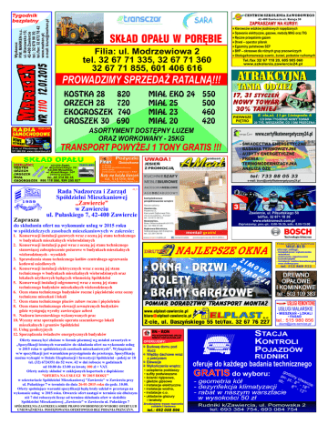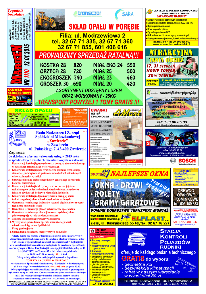 Tygodnik bezp³atny nr 1110 12.01.2015 Wydawca: P.W. MARKEN s.c. ul. Blanowska 15; 42-400 Zawiercie tel.: 32 670 90 35; tel./fax: 32 672 78 42 www.marken.pl; e-mail: [email protected] CENTRUM SZKOLENIA ZAWODOWEGO U¯YWANE Z-cie, ul. Pi³sudskiego 105 511 980 238 www.robcarduo.pl.tl 42-400 Zawiercie ul. Rataja 30 ZAPRASZAMY NA KURSY: SK£AD OPA£U W PORÊBIE Filia: ul. Modrzewiowa 2 tel. 32 67 71 335, 32 67 71 360 32 67 71 855, 601 406 616 ? Kierowców wózków jezdniowych napêdzanych ? Spawanie elektryczne, gazowe, metod¹ MAG oraz TIG ? Rêczne przepalanie gazem ? Drwal – operator pilarek ? Egzaminy pañstwowe SEP ? BHP – okresowe dla ró¿nych grup pracowniczych ? Obs³uga/konserwacja suwnic, ¿urawi, podestów ruchomych Tel./fax 32/ 67 118 20, 605 985 060 www.szkolenia.zawiercie24.pl PROWADZIMY SPRZEDA¯ RATALN¥!!! KOSTKA 28 820 MIA£ EKO 24 ORZECH 28 720 MIA£ 25 EKOGROSZEK 740 MIA£ 23 GROSZEK 30 690 MIA£ 20 ASORTYMENT DOSTÊPNY LUZEM ORAZ WORKOWANY - 25KG 550 500 460 420 , 17, 31 STYCZEN NOWY TOWAR 30% TANIEJ Z- cie,ul. 11-go Listopada 6 PIERWSZE CO DWA TYGODNIE NOWY TOWAR PIÊTRO 20 TYŒ. WIESZAKÓW, CO 3 DNI PRZECENA www.certyfikatenergetyczny24.pl TRANSPORT POWY¯EJ 1 TONY GRATIS !!! - ŒWIADECTWA ENERGETYCZNE - BADANIA TERMOWIZYJNE - AUDYTY ENERGETYCZNE - PREMIA TERMOMODERNIZACYJNA - ANALIZA OZE tel: 733 88 05 33 e-mail: [email protected] 28_11 Zaprasza Rada Nadzorcza i Zarz¹d Spó³dzielni Mieszkaniowej „Zawiercie” w Zawierciu ul. Pu³askiego 7, 42-400 Zawiercie do sk³adania ofert na wykonanie us³ug w 2015 roku w spó³dzielczych zasobach mieszkaniowych w zakresie: 1. Konserwacji instalacji gazowych wraz z ocen¹ jej stanu technicznego w budynkach mieszkalnych wielorodzinnych 2. Konserwacji instalacji p.po¿ wraz z ocen¹ jej stanu technicznego stanowi¹cej zabezpieczenie po¿arowe w budynkach mieszkalnych wielorodzinnych - wysokich 3. Sprawdzenia stanu technicznego kot³ów centralnego ogrzewania kot³owni osiedlowych 4. Konserwacji instalacji elektrycznych wraz z ocen¹ jej stanu technicznego w budynkach mieszkalnych wielorodzinnych oraz lokalach u¿ytkowych bêd¹cych w³asnoœci¹ Spó³dzielni 5. Konserwacji instalacji odgromowej wraz z ocen¹ jej stanu technicznego budynków mieszkalnych wielorodzinnych 6. Ocen stanu technicznego budynków roczne i piêcioletnie oraz oceny techniczne mieszkañ i lokali 7. Ocen stanu technicznego placów zabaw roczne i piêcioletnie 8. Ocen stanu technicznego elewacji zewnêtrznych budynków gdzie wystêpuj¹ wyroby zawieraj¹ce azbest 9. Nadzoru inwestorskiego wykonywanych prac 10. Wyceny oraz sporz¹dzenie operatu szacunkowego lokali mieszkalnych i gruntów Spó³dzielni 11. Us³ug geodezyjnych 12. Sporz¹dzenia œwiadectw energetycznych budynków Oferty musz¹ byæ z³o¿one w formie pisemnej wg ustaleñ zawartych w „Specyfikacji istotnych warunków do sk³adania ofert na wykonanie us³ug w 2015 roku w spó³dzielczych zasobach mieszkaniowych”. Wykupienie w/w specyfikacji jest warunkiem przyst¹pienia do przetargu. Specyfikacjê mo¿na wykupiæ w Dziale Eksploatacji i Inwestycji Spó³dzielni - pokój nr 18 tel. (32) 6724351 do 52 wew. 42 w dni robocze w godzinach od 10.00 do 13.00 za kwotê 100 z³ + VAT. Oferty nale¿y sk³adaæ w zaklejonych kopertach z dopiskiem: "OFERTA NA US£UGI W 2015 ROKU” w sekretariacie Spó³dzielni Mieszkaniowej "Zawiercie" w Zawierciu przy ul. Pu³askiego 7 w terminie do dnia 26-01-2015 roku do godz. 10.00. Oferty spe³niaj¹ce warunki specyfikacji bêd¹ bra³y udzia³ w przetargu na wykonanie us³ug w 2015 roku. Otwarcie ofert nast¹pi w terminie nie d³u¿szym ni¿ 7 dni roboczych licz¹c od terminu sk³adania ofert w siedzibie Spó³dzielni Mieszkaniowej „Zawiercie” w Zawierciu ul. Pu³askiego 7 SPÓ£DZIELNIA ZASTRZEGA SOBIE PRAWO SWOBODNEGO WYBORU OFERT LUB UNIEWA¯NIENIA POSTÊPOWANIA OFERTOWEGO BEZ PODANIA PRZYCZYN. Zawiercie, ul. Pi³sudskiego 50 tel/fax. 32 671 18 36 www.elektromech.com.pl Zapraszamy: pon.-pt.: 8.00-16.30, sob.: 8.00-13.00 Firma remontowo- budowlana NAJLEPSZE OKNA zi Pr mo om wa oc ja • OKNA • DRZWI • ROLETY • BRAMY GARA¯OWE MOZ-BUD oferuje us³ugi: - kompleksowe wykoñczenia mieszkañ - malowanie, tapetowanie - ³azienki-p³ytki - instalacje wodno-kanalizacyjne oraz elektryczne tel. 512 869 512 tel.: 503 109 383 tel.: 515 980 856 [email protected] STACJA KONTROLI POJAZDÓW RUDNIKI oferuje do ka¿dego badania technicznego GRATIS do wyboru: go d pn ziny -p sb: t.: 0o0 twa 8 rci 8 00 - 18 00 a: - 1 00 3 - geometria kó³ - dezynfekcja klimatyzacji - rabat w naszym warsztacie w wysokoœci 50 z³ Rudniki k/Zawiercia, ul. Pomowska 2 tel: 693 384 754, 693 084 754 AUTOELEKTRONIKA NAPRAWA I REGULACJA ELEKTRONICZNYCH SYSTEMÓW PROFESJONALNYM PRZYRZ¥DEM REGULACJA SILNIKÓW DIESLA I BENZYNOWYCH ADAPTACJA ELEMENTÓW ELEKTRONICZNYCH WYMIENIONYCH Zawiercie, ul. Kombatantów 6 Tel. 692 913 152 - 32 67 235 71 - Us³ugi koparko-³adowark¹ - Roboty ziemne - M³ot hydrauliczny - Wiertnica, wiercenie pod s³upy - Wyburzenia STROJENIE, REMONTY PIANIN, FORTEPIANÓW Marian Olszewski, Zawiercie tel.: 604 284 468 tel.: 603 383 598 NAJNI¯SZE CENY Us³ugi koparko - ³adowark¹, walcem, zagêszczark¹, wyburzenia, utwardzenie, asfaltowanie terenu tel. 888 500 121 TRANS-ELEKTRONIK 16_13 -kompleksowe us³ugi w zakresie instalacji elektrycznych; -systemy alarmowe; -telewizja przemys³owa (monitoring); -domofony; Obr. Poczty Gd. 101, 42-400 Z-cie tel. 501 623 526 KRONIKA POLICYJNA Miasto Zawiercie Chcesz mieæ piêkn¹ ³azienkê lub kuchniêwyremontujemy j¹ dla Ciebie w 10 dni !! US£UGI TRANSPORTOWE Transport ¿wiru, grysu, ziemi. Tanio i solidnie Wywóz gruzu i wyburzenia tel: 605 545 893 tel. 501 786 298 DACH-REM budowa i remont dachów 606 384 891 £azienki - kompleksowo Panele - sufit, pod³oga Docieplenia poddaszy tel: 665 016 663 DOCIEPLENIA PODDASZY - tynki mineralne, akrylowe silikatowe, silikonowe, mozaikowe - podbitki - inne roboty budowlane 07.01.2015 godz. 15: