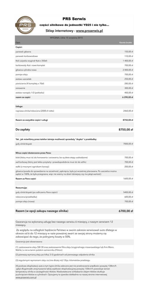 PRS Serwis części silnikowe do jednostki YD25 i nie tylko… Sklep internetowy - www.prsserwis.pl WYCENA z dnia 15 września 2015 Opis Kwota brutto Części: panewki główne 150,00 zł panewki korbowodowe 110,00 zł tłok (używka oryginał 4szt.x 350zł) korbowody 4szt. nowe komplet głowica cylindra nowa 1 400,00 zł 700,00 zł 2 000,00 zł pompa oleju 700,00 zł zestaw uszczelek 250,00 zł pierścienie (4 komplety x 70zł) 280,00 zł osiowanie 300,00 zł zestaw rozrządu 1/2 (połówka) 400,00 zł razem za części 6 290,00 zł Usługa: naprawa silnika/robocizna (2000 zł netto) 2460,00 zł Razem za wszystkie części i usługi 8750,00 zł Do zapłaty 8750,00 zł Tak , jak mówiliśmy przez telefon istnieje możliwość sprzedaży "słupka" z przekładką: goły silnik/słupek 7000,00 zł Minus części dostarczone przez Pana: blok (który musi iść do honowania i osiowania, bo są dwie stopy uszkodzone) 700,00 zł wał korbowy (który jest lekko przytarty i prawdopodobnie musi iść do szlifu) 700,00 zł wałki (z mocnymi ogniskami korozji) 200,00 zł głowica (poszła do sprawdzenia na szczelność, pęknięcia, była już wcześniej planowana. Po uszczelce można sądzić w 100%, że była przegrzana, więc nie wiemy na dzień dzisiejszy czy ma jakąś wartość) Razem za Pana części 1600,00 zł Reasumując goły silnik/słupek (po odliczeniu Pana części) 5400,00 zł robocizna (przekładka) 600,00 zł pompa oleju (nowa) 700,00 zł Razem (w opcji zakupu naszego silnika) Gwarancja na wykonaną usługę bez naszego serwisu 6 miesięcy, z naszym serwisem 12 miesięcy. Ze względu na odległość będziecie Państwo w swoim zakresie serwisowali auto dlatego w okresie od 6 do 12 miesięcy w razie poważnej awarii ze swojej strony możemy się zobowiązać do tego, że pokryjemy koszty w 50%. Gwarancja jest obwarowana: (1). zastosowanie oleju 5W-30 oraz zastosowanie filtra oleju (oryginalnego nissanowskiego lub firm:Mann, Mahle,) a nie w tanim polskim zamienniku (Filtron) (2).pierwszą wymianą oleju po kilku( 3-5) godzinach od pierwszego odpalenia silnika (3).regularnymi wymianami oleju co (nie dłużej niż) 12tys. kilometrów przebiegu (4).podczas eksploatacji auta w tym typie silnika zalecane jest nie przekraczanie prędkości powyżej 130km/h -gdyż długotrwałe utrzymywanie takiej szybkości eksploatacyjnej powyżej 130km/h powoduje wzrost temperatury silnika w szczególności tłoków. Niedostateczne schładzanie olejem tłoków skutkuje puchnięciem tłoków w cylindrach. Opisujemy to zjawisko dokładnie na naszej stronie internetowej www.prsserwis.com.pl 6700,00 zł
