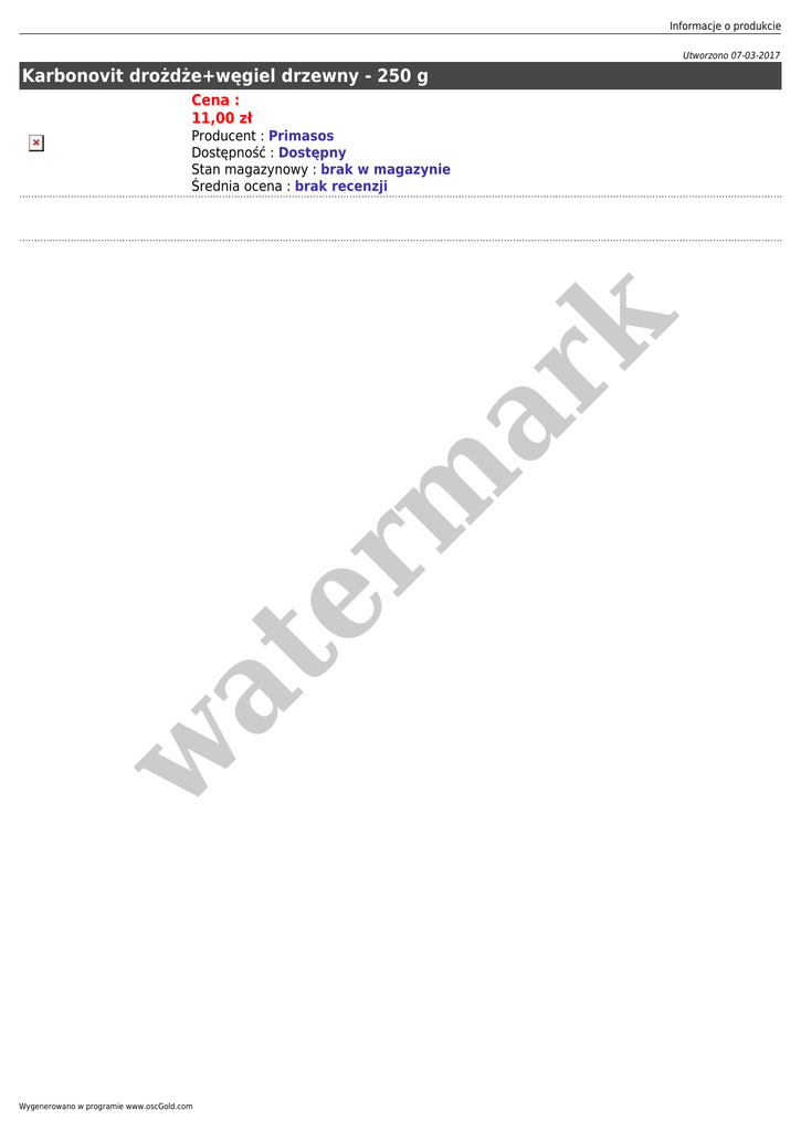Informacje o produkcie Utworzono 07-03-2017 Karbonovit drożdże+węgiel drzewny - 250 g Cena : 11,00 zł w at er m ar k Producent : Primasos Dostępność : Dostępny Stan magazynowy : brak w magazynie Średnia ocena : brak recenzji Wygenerowano w programie www.oscGold.com