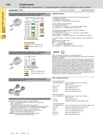 Projektowanie Elementy z diodami LED http://catalog.moeller.net Moeller HPL0211-2007/2008 2/41 M22-XLED… Łączniki czołowe LED-ów M22-XLED Obudowa do nabudowania Montaż na płycie czołowej jeden za drugim Montaż na płycie czołowej obok siebie M22-XLED... M22-XLED... M22-XLED... Rezystor do elementów z LED-ami M22-XLED60/M22-XLED220 Ue h/H 12 – 30 V h/H 1 2 1 2 1 2 X1 X2 M22-XLED60 Ue [AC/DC]F 1x 60 V M22-XLED220 Ue [DC] F 1x 220 V 2x 90 V 3x 120 V 4x 150 V 5x 180 V M22-(C)LED(C)-... M22-XLED60/ M22-XLED220 Tester do LED-ów M22-XLED-T 13 14 12 – 240 V h/H 2 13 13 14 14 a M22-(C)K(C)10 a Przycisk kontrolny Tylko do elementów 12 - 30 V 2) Do elementów 85 - 264 V 1) 4 1 2 1 2 1 2 1 3 1 M22-XLED60/ M22-XLED220 2 1 1 M22-XLED-T 1 M22-XLED60/ M22-XLED220 2 1 M22-XLED60/ M22-XLED220 2 2 2 X1 X1 X1 X2 X2 X2 M22-(C)LED(C)-... 1) M22-XLED230-T Ue h M22-(C)K(C)10 85 – 264 V h/50 – 60 Hz L1 N 13 13 13 14 14 14 a 3 1 4 2 85 – 264 V h, 50 – 60 Hz M22-(C)K(C)01 1 2 2 1 2 X1 X2 1 2 M22-XLED230-T 1 2 X1 X1 X1 X2 X2 X2 1 M22-XLED230-T M22-(C)LED(C)230-... 2) M22-XLED230-T Ue F M22-(C)LED(C)230-... 1x 400 Vh 2x 500 Vh 6x 210 V 7x 240 V Aparatura sterująca i sygnalizacyjna RMQ-Titan • Dane techniczne RMQ-Titan Moeller HPL0211-2007/2008 Elementy stykowe Elementy z diodami LED Napędy przycisków podświetlanych, Napędy przycisków, Napędy przycisków grzybkowych z samopowrotem Napędy przycisków podwójnych Napędy przełączników Przełączniki podświetlane z samopowrotem IEC/EN 60947 VDE 0660 >5 F 3600 – – >5 F 3600 > 0.2 F 3600 > 0.1 F 2000 F5 F0.8 – – F5 – F5 – – F0.3 IP20 IP20 IP67, IP69K Klimat wilgotny/ciepły, stały, wg IEC 60068-2-78 Klimat wilgotny/ciepły, zmienny, wg IEC 60068-2-30 IP66 IP66 -25/70 -25/70 -25/70 -25/70 g -25/70 dowolna > 30 > 30 > 30 > 30 > 30 mm2 mm2 0,75 – 2,5 0,5 – 2,5 0,75 – 2,5 0,5 – 2,5 – – – – – – Uimp Ui V AC V 6000 500 IIIx3 6000 500 IIIx3 – – – – – – – – – HF Częstotliwość błędu Częstotliwość błędu < 10-7, < 1 błąd na 107 łączeń < 5 x 10-6, < 1 błąd na 5 x 106 łączeń – – – – – – – – Typ A PKZM0–10/FAZ-B6/1 10 – – – – – – – – Ie Ie Ie Ie A A A A 4 4 2 2 – – – – – – – – – – – – – – – – Ie Ie Ie Ie Ie A A A A A 3 1.7 1.2 0.8 0.3 – – – – – – – – – – – – – – – – – – – – cykle łączenia cykle łączenia cykle łączenia x 106 x 106 x 106 1.6 1 0.7 – – – – – – – – – – – – cykle łączenia x 106 1.2 – – – – Dane ogólne Normy i przepisy Trwałość, mechaniczna Maksymalna częstotliwość zadziałań cykle łączenia cykle łączenia/ godz. Siła uruchamiająca Moment obrotowy uruchamiający (zaciski ze śrubą) Stopień ochrony IEC/EN 60529 Wytrzymałość klimatyczna N Nm Temperatura otoczenia bez obudowy Pozycja mocowania Wytrzymałość udarowa zgodnie z IEC 60068-2-27 czas udaru 11 ms, półsinusoidalny Przekrój doprowadzeń Przewód pojedynczy wielożyłowy Obwody prądowe Odporność na udar napięciowy Znamionowe napięcie izolacji Kategoria przepięciowa / stopień zanieczyszczenia Niezawodne łączenie przy 24 V DC/5 mA przy 5 V DC/1 mA °C HF Max element zabezpieczenia zwarciowego bez bezpiecznika topikowego bezpiecznik topikowy gG/gL Zdolność łączeniowa Znamionowy prąd pracy AC-15 115 V 230 V 400 V 500 V DC-13 24 V 42 V 60 V 110 V 220 V Trwałość, elektryczna AC-15 230 V/0,5 A 230 V/1,0 A 230 V/3,0 A DC-13 12 V/2,8 A Uwagi x 106 1) > 200 V AC/60 Hz: -25/+55 °C Aparatura sterująca i sygnalizacyjna RMQ-Titan http://catalog.moeller.net 2/63 2/64 Dane techniczne RMQ-Titan Aparatura sterująca i sygnalizacyjna RMQ-Titan Moeller HPL0211-2007/2008 Napędy przełączników z kluczykiem Dane ogólne Normy i przepisy Trwałość, mechaniczna Maksymalna częstotliwość zadziałań cykle łączenia cykle łączenia/ godz. Siła uruchamiająca Moment obrotowy uruchamiający Stopień ochrony IEC/EN 60529 x 106 Obwody prądowe Odporność na udar napięciowy Uimp Znamionowe napięcie izolacji Ui Kategoria przepięciowa / stopień zanieczyszczenia Siła uruchamiająca Moment obrotowy uruchamiający Stopień ochrony IEC/EN 60529 Wytrzymałość klimatyczna Temperatura otoczenia bez obudowy Pozycja mocowania Wytrzymałość udarowa zgodnie z IEC 60068-2-27 czas udaru 11 ms, półsinusoidalny cykle łączenia cykle łączenia/ godz. Przyciski podświetlane Napędy przycisków Przyciski grzybkowe bez samopowrotu Przyciski bezpieczeństwa – – >1 F 1800 > 0.1 F 600 – F0.5 IP66 – F5 – – Lampki sygnalizaIP67, IP69K cyjne (kompaktowe):IP67, IP69K Sygnalizator akustyczny kompakt.: IP40 Potencjometr: IP66 Klimat wilgotny/ciepły, stały, wg IEC 60068-2-78 Klimat wilgotny/ciepły, zmienny, wg IEC 60068-2-30 F50 – IP67, IP69K °C -25/70 -25/70 -25/70 g -25/70 dowolna > 30 > 30 > 30 > 50 mm2 mm2 – – 0,5 – 1,5 0,5 – 1,5 – – – – V AC V – – – 4000 2500 III/3 – – – – – – Dane ogólne Normy i przepisy Trwałość, mechaniczna Maksymalna częstotliwość zadziałań Sygnalizatory świetlne Sygnalizatory akustyczne kompaktowe Sygnalizatory świetlne kompaktowe Potencjometry N Nm Wytrzymałość klimatyczna Temperatura otoczenia bez obudowy Pozycja mocowania Wytrzymałość udarowa zgodnie z IEC 60068-2-27 czas udaru 11 ms, półsinusoidalny Przekrój doprowadzeń Przewód pojedynczy wielożyłowy IEC/EN 60947 VDE 0660 > 0.1 F 100 http://catalog.moeller.net x 106 Duże przyciski ręczne i nożne FAK-... Z samopowrotem Bez samopowrotu FAK-R/V/KC11A/I Bez samopowrotu IEC/EN 60947 VDE 0660 >1 F 3600 > 0.1 F 600 > 0.1 F 600 N Nm 20 – 40 40 – 60 – – IP67, IP69K IP67, IP69K Klimat wilgotny/ciepły, stały, wg IEC 60068-2-78 Klimat wilgotny/ciepły, zmienny, wg IEC 60068-2-30 15 – 25 – IP65 °C -25/40 dowolna > 15 -25/40 dowolna > 15 g -25/40 dowolna > 15 Dane techniczne RMQ Titan M22-ASI..., RMQ-...