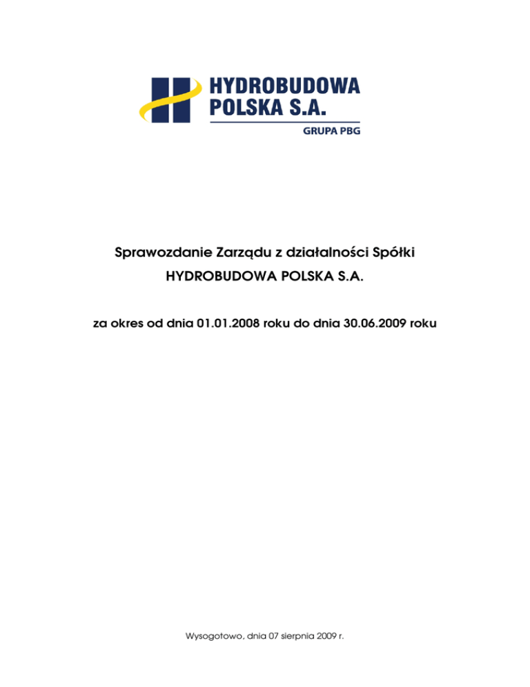 Sprawozdanie Zarządu z działalności Spółki HYDROBUDOWA POLSKA S.A. za okres od dnia 01.01.2008 roku do dnia 30.06.2009 roku Wysogotowo, dnia 07 sierpnia 2009 r. Sprawozdanie Zarządu HYDROBUDOWY POLSKA S.A. z działalności Spółki za I półrocze 2009 roku SPIS TREŚCI I. ZARYS OGÓLNY DZIALALNOŚCI SPÓŁKI HYDROBUDOWA POLSKA.........................................5 1.Informacja ogólna ...................................................................................................................................5 2. Skład osobowy, zmiany jakie zaszły wśród osób zarządzających i nadzorujących Emitenta oraz opis działania organów zarządzających i nadzorujących Emitenta ......................................6 II. INFORMACJE O PODSTAWOWYCH GRUPACH PRODUKTÓW ...................................................7 III. INFORMACJE O RYNKACH ZBYTU ...................................................................................................9 IV. AKCJONARIUSZE POSIADAJĄCY CO NAJMNIEJ 5% GŁOSÓW W OGÓLNEJ LICZBIE GŁOSÓW NA WZA ORAZ ZMIANY W STRUKTURZE WŁASNOŚCI ZNACZNYCH PAKIETÓW AKCJI EMITENTA .....................................................................................................................................................11 V. OKREŚLENIE ŁĄCZNEJ LICZBY I WARTOŚCI NOMINALNEJ WSZYSTKICH AKCJI SPÓŁKI, BĘDĄCYCH W POSIADANIU OSÓB ZARZĄDZAJĄCYCH I NADZORUJĄCYCH NA KONIEC CZERWCA 2009 ROKU ...............................................................................................................................12 VI. INFORMACJE O POWIĄZANIACH ORGANIZACYJNYCH I KAPITAŁOWYCH SPÓŁKI Z INNYMI PODMIOTAMI ORAZ OKREŚLENIE GŁÓWNYCH INWESTYCJI, W TYM INWESTYCJI KAPITAŁOWYCH DOKONANYCH POZA JEGO GRUPĄ JEDNOSTEK POWIĄZANYCH W I PÓŁROCZU 2009 ROKU ..13 Udziały w Przedsiębiorstwie Robót Górniczych „METRO” Sp. z o.o. ............................................13 Akcje w Spółce HYDROBUDOWA 9 S.A. ...........................................................................................14 VII. ZDARZENIA ISTOTNE WPŁYWAJĄCE NA DZIAŁALNOŚĆ JEDNOSTKI, JAKIE NASTĄPIŁY W I PÓŁROCZU 2009 ROKU ORAZ PO JEGO ZAKOŃCZENIU DO DNIA ZATWIERDZENIA SPRAWOZDANIA FINANSOWEGO ...........................................................................................................14 Zwiększenie wysokości limitu w ramach umowy ramowej z ING Bankiem Śląskim S.A. ...............14 Wprowadzenie do obrotu giełdowego akcji serii L............................................................................14 Zwiększenie wysokości limitu w ramach limitu odnawialnego z TuiR Euler Hermes S.A. ..............15 Odwołanie Prokurenta Spółki .................................................................................................................15 Zbycie udziałów w spółce zaleŜnej .......................................................................................................15 Rezygnacja Członków Rady Nadzorczej Spółki ..................................................................................16 Powołanie Członków Rady Nadzorczej Spółki ....................................................................................16 VIII. INFORMACJE O ZAWARTYCH ZNACZĄCYCH I ISTOTNYCH UMOWACH ...............................16 IX. INFORMACJE O ZMIANACH W POWIĄZANIACH ORGANIZACYJNYCH DO DNIA ZŁOśENIA SPRAWOZDANIA FINANSOWEGO ...........................................................................................................18 X. INFORMACJE O NABYCIU AKCJI WŁASNYCH ............................................................................19 XI. OPIS TRANSAKCJI Z PODMIOTAMI POWIĄZANYMI ....................................................................19 XII. INFORMACJE O ZACIĄGNIĘTYCH KREDYTACH, UMOWACH POśYCZEK...............................20 XIII. INFORMACJE O UDZIELONYCH POśYCZKACH...........................................................................20 XIV. SPOSÓB WYKORZYSTANIA WPŁYWÓW Z EMISJI AKCJI SERII K .................................................20 2 Sprawozdanie Zarządu HYDROBUDOWY POLSKA S.A. z działalności Spółki za I półrocze 2009 roku 1. Cele Emisji Akcji serii K...........................................................................................................................20 2. Wykorzystanie środków z emisji akcji serii K.......................................................................................21 XV. OBJAŚNIENIE RÓśNIC POMIĘDZY WYNIKAMI FINANSOWYMI A PROGNOZAMI ...................21 XVI. OCENA ZARZĄDZANIA ZASOBAMI FINANSOWYMI ....................................................................21 XVII. STOSOWANE PRZEZ SPÓŁKĘ INSTRUMENTY FINANSOWE: ..........................................................22 XVIII. GŁÓWNE INWESTYCJE RZECZOWE I KAPITAŁOWE ORAZ OCENA MOśLIWOŚCI REALIACJI ZAMIERZEŃ INWESTYCYJNYCH.................................................................................................................23 1. Główne inwestycje rzeczowe HYDROBUDOWA POLSKA S.A. ......................................................23 2. Ocena moŜliwości realizacji zamierzeń inwestycyjnych................................................................23 XIX. OCENA CZYNNIKÓW I NIETYPOWYCH ZDARZEŃ........................................................................24 XX. OPIS RYZYK I ZAGROśEŃ. CZYNNIKI MAJĄCE WPŁYW NA ROZWÓJ HYDROBUDOWY POLSKA S.A..................................................................................................................................................25 Ryzyko konkurencji ...........................................................................................................................25 Ryzyko niesolidnych dostawców materiałów i podwykonawców ........................................25 Ryzyko związane z koniunkturą gospodarczą w Polsce .........................
