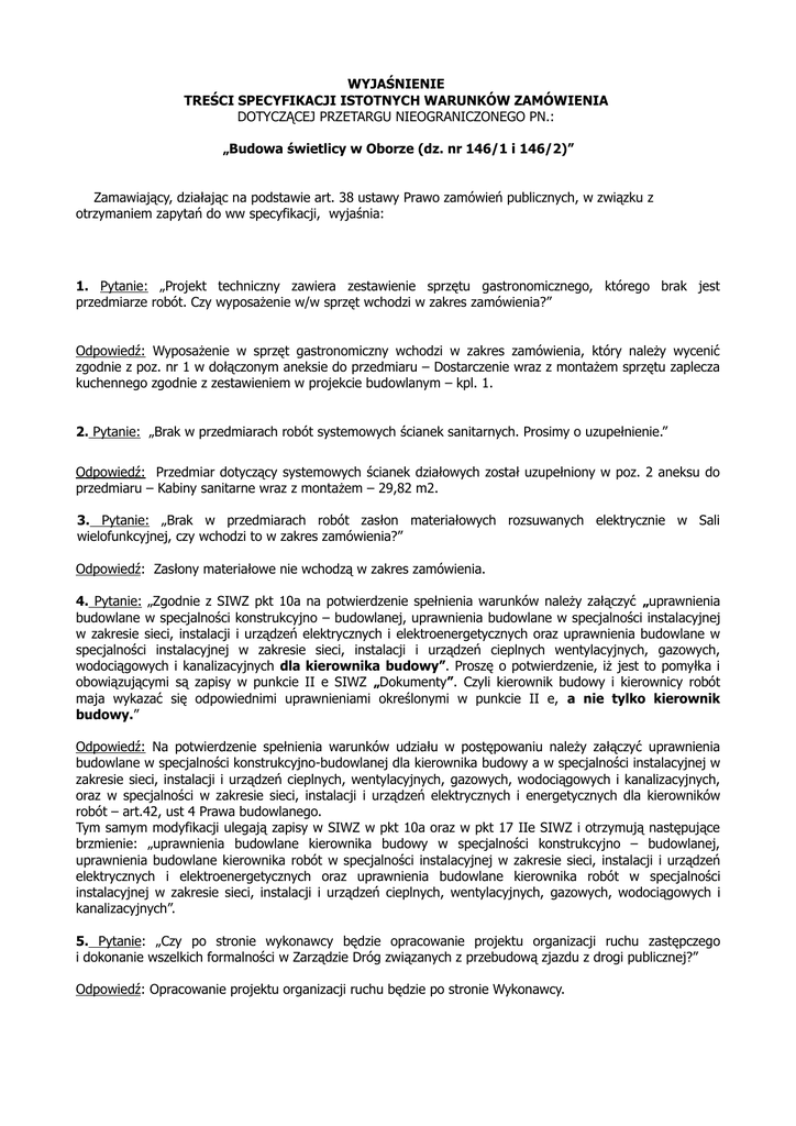 WYJAŚNIENIE TREŚCI SPECYFIKACJI ISTOTNYCH WARUNKÓW ZAMÓWIENIA DOTYCZĄCEJ PRZETARGU NIEOGRANICZONEGO PN.: „Budowa świetlicy w Oborze (dz. nr 146/1 i 146/2)” Zamawiający, działając na podstawie art. 38 ustawy Prawo zamówień publicznych, w związku z otrzymaniem zapytań do ww specyfikacji, wyjaśnia: 1. Pytanie: „Projekt techniczny zawiera zestawienie sprzętu gastronomicznego, którego brak jest przedmiarze robót. Czy wyposażenie w/w sprzęt wchodzi w zakres zamówienia?” Odpowiedź: Wyposażenie w sprzęt gastronomiczny wchodzi w zakres zamówienia, który należy wycenić zgodnie z poz. nr 1 w dołączonym aneksie do przedmiaru – Dostarczenie wraz z montażem sprzętu zaplecza kuchennego zgodnie z zestawieniem w projekcie budowlanym – kpl. 1. 2. Pytanie: „Brak w przedmiarach robót systemowych ścianek sanitarnych. Prosimy o uzupełnienie.” Odpowiedź: Przedmiar dotyczący systemowych ścianek działowych został uzupełniony w poz. 2 aneksu do przedmiaru – Kabiny sanitarne wraz z montażem – 29,82 m2. 3. Pytanie: „Brak w przedmiarach robót zasłon materiałowych rozsuwanych elektrycznie w Sali wielofunkcyjnej, czy wchodzi to w zakres zamówienia?” Odpowiedź: Zasłony materiałowe nie wchodzą w zakres zamówienia. 4. Pytanie: „Zgodnie z SIWZ pkt 10a na potwierdzenie spełnienia warunków należy załączyć „uprawnienia budowlane w specjalności konstrukcyjno – budowlanej, uprawnienia budowlane w specjalności instalacyjnej w zakresie sieci, instalacji i urządzeń elektrycznych i elektroenergetycznych oraz uprawnienia budowlane w specjalności instalacyjnej w zakresie sieci, instalacji i urządzeń cieplnych wentylacyjnych, gazowych, wodociągowych i kanalizacyjnych dla kierownika budowy”. Proszę o potwierdzenie, iż jest to pomyłka i obowiązującymi są zapisy w punkcie II e SIWZ „Dokumenty”. Czyli kierownik budowy i kierownicy robót maja wykazać się odpowiednimi uprawnieniami określonymi w punkcie II e, a nie tylko kierownik budowy.” Odpowiedź: Na potwierdzenie spełnienia warunków udziału w postępowaniu należy załączyć uprawnienia budowlane w specjalności konstrukcyjno-budowlanej dla kierownika budowy a w specjalności instalacyjnej w zakresie sieci, instalacji i urządzeń cieplnych, wentylacyjnych, gazowych, wodociągowych i kanalizacyjnych, oraz w specjalności w zakresie sieci, instalacji i urządzeń elektrycznych i energetycznych dla kierowników robót – art.42, ust 4 Prawa budowlanego. Tym samym modyfikacji ulegają zapisy w SIWZ w pkt 10a oraz w pkt 17 IIe SIWZ i otrzymują następujące brzmienie: „uprawnienia budowlane kierownika budowy w specjalności konstrukcyjno – budowlanej, uprawnienia budowlane kierownika robót w specjalności instalacyjnej w zakresie sieci, instalacji i urządzeń elektrycznych i elektroenergetycznych oraz uprawnienia budowlane kierownika robót w specjalności instalacyjnej w zakresie sieci, instalacji i urządzeń cieplnych, wentylacyjnych, gazowych, wodociągowych i kanalizacyjnych”. 5. Pytanie: „Czy po stronie wykonawcy będzie opracowanie projektu organizacji ruchu zastępczego i dokonanie wszelkich formalności w Zarządzie Dróg związanych z przebudową zjazdu z drogi publicznej?” Odpowiedź: Opracowanie projektu organizacji ruchu będzie po stronie Wykonawcy. 6. Pytanie: „Przedmiar robót sanitarnych: prosimy o uzupełnienie w pozycjach robót podstaw wyceny według KNR.” Odpowiedź: Przedmiar robót branży sanitarnej uzupełniono o podstawy wyceny KNR w załączeniu. 7. Pytanie: „Czy związku z faktem, iż cena za realizację zadania jest ceną ryczałtową i na etapie oceny ofert kosztorys nie będzie podlegał ocenie i oferta nie będzie odrzucana za błędy w kosztorysie (punkt 12c SIWZ) czy można nie załączać kosztorysu do oferty? Wnosimy aby nie załączać kosztorysu do oferty a wykonawca, który zostanie wyłoniony do realizacji zadania będzie zobowiązany do złożenia kosztorysu przed podpisaniem umowy.” Odpowiedź: Do oferty należy dołączyć kosztorys ofertowy zgodnie z zapisem SIWZ. 8. Pytanie: „Paragraf 2 punkt 6.3: proszę o doprecyzowanie o jakie dokumenty chodzi.” Odpowiedź: Zgodnie z zapisem § 6, ust 3 umowy przed pisemnym zawiadomieniem Zamawiającego o zakończeniu robót Wykonawca powinien dostarczyć dokumenty odbiorowe niezbędne do zawiadomienia o zakończeniu robót budowlanych i uzyskania pozwolenia na użytkowanie. 9. Pytanie: „Czy w przedmiotowym postępowaniu wymagane jest pozwolenie na budowę? Czy wykonawca będzie zobowiązany je uzyskać?” Odpowiedź: Zamawiający posiada pozwolenie na budowę Nr AB.7351-525/2009 z dnia 15 .07. 2009r. Ponadto w kosztorysie ofertowym należy uwzględnić następujące pozycje przedmiarowe zawarte w aneksie do przedmiaru: 1/ poz. nr 3 – przewody wentylacyjne z blachy stalowej, kołowe typ S(Spiro) o śr. do 200 mm – 23,255 m2. 2/ poz. nr 4 – parapety wewnętrzne drewnopodobne szerokości 30 cm – 28,70 m. 3/ poz. nr 5 – lada drewniana szatni głównej szerokości 60 cm – 5,00 m. Jednocześnie Zamawiający informuje, o przedłużeniu terminu składania ofert w niniejszym postępowaniu. W celu umożliwienia wprowadzenia w ofertach zmian wynikających ze zmiany treści SIWZ, prowadzącej do zmiany treści ogłoszenia o zamówieniu, Zamawiający przedłuża termin składania ofert do dnia: 10.11.2009r. do godz. 10,00. Otwarcie ofert odbędzie się 10.11.2009r. o godz. 10,15. Powyższą zmianę terminu należy uwzględnić przy składaniu i określaniu terminu ważności wadium. WÓJT GMINY /-/ Irena Rogowska Załączniki: 1. Aneks do przedmiaru, 2. Przedmiar robót sanitarnych, 3. Zestawienie sprzętu gastronomicznego.