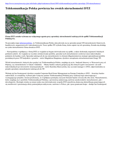 http://www.terenyinwestycyjne.info/index.php/wiadomosci/item/1895-telekomunikacja-polska-sprzedaje-250-nieruchomosci Telekomunikacja Polska powierza los swoich nieruchomości DTZ Firma DTZ została wybrana na wyłącznego agenta przy sprzedaży nieruchomości należących do spółki Telekomunikacji Polskiej SA. Na początku maja informowaliśmy, że Telekomunikacja Polska zdecydowała się na sprzedaż ponad 250 nieruchomości biurowych, handlowych, magazynowych i mieszkaniowych. Teraz spółka TP wybrała firmę, która zajmie się ich sprzedażą, Została nią działają na rynku nieruchomości firma doradcza DTZ. - Nawiązaliśmy współpracę z firmą DTZ ze względu na bogate doświadczenie tej spółki, a także doskonałą znajomość lokalnych polskich rynków. Ze względu na wysokie zróżnicowanie portfela, sprzedaż tych nieruchomości cechować musi indywidualne podejście do każdej z nich. Sprzedaż należących do nas nieruchomości to element długoterminowej strategii optymalizacji portfela posiadanych przez TP budynków i gruntów - mówi Magdalena Hauptman, dyrektor zarządzania nieruchomościami Grupy TP. Wśród nieruchomości, których chce pozbyć się Telekomunikacja Polska, znajdują się m.in.: budynek biurowy w Warszawie przy ul. Pięknej, czy nieruchomości w Gdyni i Gdańsku. - Mamy bardzo ciekawą propozycję dla różnych typów inwestorów: od osób indywidualnych po inwestorów instytucjonalnych – mówi Karolina Skurczyńska, key account manager w DTZ, odpowiedzialna za projekt sprzedaży nieruchomości należących do TP. Wtóruje jej Ian Scattergood, dyrektor zespołu Corporate Real Estate Management na Europę Centralną w DTZ. - Jesteśmy bardzo zadowoleni, że zostaliśmy wybrani jako wyłączny partner Telekomunikacji Polskiej przy realizacji tego interesującego i wymagającego projektu. Jestem przekonany, że współpraca pomiędzy naszymi firmami będzie owocna dla obu stron. Nieruchomości, które znajdują się w portfolio Telekomunikacji Polskiej, z pewnością zainteresują zarówno użytkowników nieruchomości, jak i deweloperów. Rozległa wiedza na temat rynku oraz doświadczenie zespołu DTZ umożliwią skuteczną identyfikację pojawiających się możliwości i prezentację oferty potencjalnym nabywcom, zarówno w Polsce, jak i poza granicami kraju – dodaje Ian Scattergood. Powered by TCPDF (www.tcpdf.org)