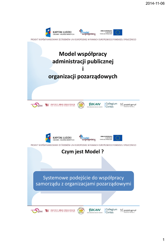 2014-11-06 Model współpracy administracji publicznej i organizacji pozarządowych Czym jest Model ? Systemowe podejście do współpracy samorządu z organizacjami pozarządowymi 1 2014-11-06 Kto jest odbiorcą Modelu ? Poziom krajowy: organy administracji państwowej Poziom regionalny: jednostki samorządu terytorialnego, lokalne organizacje pozarządowe Praca nad Modelem Spotkania lokalne FAOW Grupy Wymiany Doświadczeń prowadzonych przez Związek Miast Polskich Komitet Ekspertów „Okrągłe stoły” Fora Pełnomocników Grupy robocze 2 2014-11-06 Model założenia 3 płaszczyzny Współpraca jednostek samorządu terytorialnego i organizacji pozarządowych w zakresie tworzenia polityk publicznych Współpraca jednostek samorządu terytorialnego z organizacjami pozarządowymi w zakresie realizacji zadań publicznych Infrastruktura współpracy, tworzenie warunków do społecznej aktywności Zasady współpracy Ustawowe zasady współpracy Zasada pomocniczości Zasada pomocniczości Obszary współpracy Zasada partnerstwa Zasada suwerenności stron Zasada suwerenności stron Płaszczyzna współpracy Zasada efektywności Zasada jawności Zasada uczciwej konkurencji Zasada partnerstwa Zasada efektywności Obszary współpracy Zasada jawności Zasada uczciwej konkurencji 3 2014-11-06 Zasada równości szans Zasada pomocniczości Obszary współpracy Zasada równości szans Zasada partnerstwa Zasada suwerenności stron Zasada partnerstwa Zasada równości szans Zasada pomocniczości Zasada suwerenności stron Płaszczyzna współpracy Zasada efektywności Zasada efektywności Obszary współpracy Zasada jawności Zasada uczciwej konkurencji Zasada jawności Zasada uczciwej konkurencji Kultura współpracy Zasada partnerstwa Zasada suwerenności stron Zasada efektywności Zasada jawności Zasada uczciwej konkurencji Obszary współpracy Płaszczyzna współpracy Obszary współpracy Zasada pomocniczości Zasada partnerstwa Zasada suwerenności stron Zasada efektywności Zasada równości szans Zasada równości szans Zasada pomocniczości Zasada jawności Zasada uczciwej konkurencji 4 2014-11-06 Model - założenia 3 płaszczyzny Współpraca jednostek samorządu terytorialnego i organizacji pozarządowych w zakresie tworzenia polityk publicznych Współpraca jednostek samorządu terytorialnego z organizacjami pozarządowymi w zakresie realizacji zadań publicznych Infrastruktura współpracy, tworzenie warunków do społecznej aktywności Zasady współpracy Płaszczyzna 1 Współpraca jednostek samorządu terytorialnego i organizacji pozarządowych w zakresie tworzenia polityk publicznych 5 2014-11-06 Płaszczyzna 1 Obszar 1: Obszar 2: Współpraca samorządu terytorialnego i organizacji pozarządowych przy Wzajemne diagnozowaniu lokalnych problemów i wyzwań informowanie się samorządu terytorialnego i organizacji pozarządowych o planach, zamierzeniach i kierunkach działań. Obszar 3: Współtworzenie przez samorząd terytorialny i organizacje pozarządowe strategii i programów realizacji polityk publicznych oraz rozwiązań instytucjonalnych . Obszar 4: Konsultowanie przez samorząd terytorialny i organizacje pozarządowe założeń projektów i aktów normatywnych oraz zasad realizacji innych przedsięwzięć. Obszar 5: Współpraca samorządu terytorialnego i organizacji pozarządowych przy wdrażaniu polityk publicznych Obszar 6: Uczestnictwo organizacji pozarządowych w ocenie realizacji polityk i programów. Narzędzia/wzorce działań Obszar 5: Współpraca samorządu terytorialnego i organizacji pozarządowych przy wdrażaniu polityk publicznych 1. Średnio- i krótkookresowe plany realizacji polityk uwzględniają organizacje pozarządowe jako partnera i realizatora polityk. Wzorzec minimalny: Roczne i wieloletnie programy współpracy samorządu z organizacjami pozarządowymi. 2. Stałe zespoły doradczo-inicjatywne prowadzące systematyczną analizę wybranego obszaru. Wzorzec minimalny: Powołanie Rady Działalności Pożytku Publicznego lub ciała o podobnym charakterze. 6 2014-11-06 Rekomendowane minimalne wskaźniki: Obszar 5: Współpraca samorządu terytorialnego i organizacji pozarządowych przy wdrażaniu polityk publicznych 1. Czy istnieje roczny program współpracy z organizacjami, w którym ujęte są również zasady współpracy przy realizacji lokalnych polityk publicznych? 2. Czy tworząc polityki publiczne, organizacje współpracują z samorządem w ramach zespołów problemowych, rad, forów, komisji konkursowych, komitetów sterujących itp.? Płaszczyzna 2 Współpraca jednostek samorządu terytorialnego z organizacjami pozarządowymi w zakresie realizacji zadań publicznych 7 2014-11-06 Płaszczyzna 2 Obszar 1: Realizacja zadań publicznych z wykorzystaniem form finansowych Obszar 2 : Realizacja zadań publicznych z wykorzystaniem form niefinansowych Obszar 3: Partnerstwo projektowe w realizacji zadań publicznych Narzędzia / wzorce działań Obszar 1: Realizacja zadań publicznych z wykorzystaniem form finansowych 1. Powierzanie realizacji zadania publicznego Wzorzec minimalny: a) Standardy realizacji zadań/usług przekazywanych do realizacji organizacjom na zasadzie powierzenia. Standardy obejmują wymóg zapewnienia równego dostępu i dostosowania usług do specyficznych potrzeb grup mniejszościowych i dyskryminowanych. b) Umowy wieloletnie przy realizacji zadań. 2. Wsparcie realizacji zadania publicznego. Wzorzec minimalny: Ogłoszenie o konkursie określa kryteria wyboru ofert zgodne z programem współpracy i innymi dokumentami planistycznymi, które funkcjonują w samorządzie. 3. Zakup usług. Wzorzec minimalny: a) Porównanie cen na rynku przy wyborze oferenta przy kwotach poniżej 14 tys. euro, stosowanie zasad zam. publicznych, w tym zasady konkurencyjności b) Stosowanie klauzul społecznych przy zamówieniach publicznych 8 2014-11-06 Obszar 1: Realizacja zadań publicznych z wykorzystaniem form finansowych Obszar 2 : Realizacja