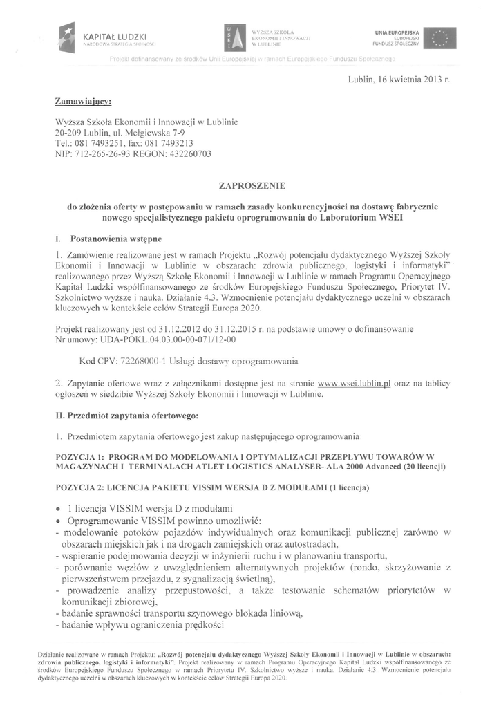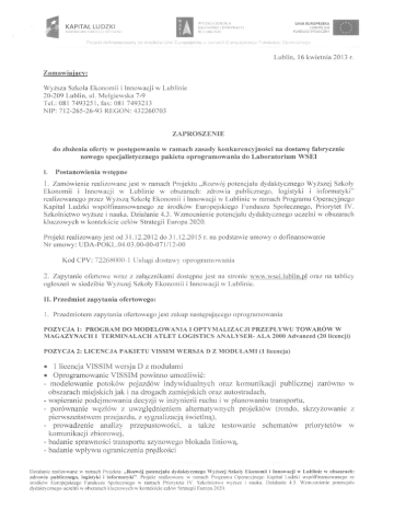 KAPITAŁ L U D Z K I N A R O D O W A STRATEGIA SPÓJNOŚCI WYŻSZA SZKOLĄ EKONOMII 1 INNOWACJI W LUBLINIE UNIA EUROPEJSKA EUROPEJSKI FUNDUSZ SPOŁECZNY H Projekt dofinansowany ze środków Unii Europejskiej w ramach Europejskiego Funduszu Społecznego Załącznik nr 2 S Z C Z E G Ó Ł O W Y OPIS PRZEDMIOTU Z A M Ó W I E N I A P O Z Y C J A 1: PROGRAM DO M O D E L O W A N I A I O P T Y M A L I Z A C J I P R Z E P Ł Y W U T O W A R Ó W W M A G A Z Y N A C H I T E R M I N A L A C H A T L E T L O G I S T I C S A N A L Y S E R - A L A 2 0 0 0 A d v a n c e d (20 licencji) P O Z Y C J A 2: L I C E N C J A P A K I E T U V I S S I M W E R S J A D Z M O D U Ł A M I (1 licencja) • 1 licencja VISSIM wersja D z modułami • Oprogramowanie VISSIM powinno umożliwić: - modelowanie potoków pojazdów indywidualnych oraz komunikacji publicznej zarówno w obszarach miejskich jak i na drogach zamiejskich oraz autostradach, - wspieranie podejmowania decyzji w inżynierii ruchu i w planowaniu transportu, - porównanie węzłów z uwzględnieniem alternatywnych projektów (rondo, skrzyżowanie z pierwszeństwem przejazdu, z sygnalizacją świetlną), - prowadzenie analizy przepustowości, a także testowanie schematów priorytetów w komunikacji zbiorowej. - badanie sprawności transportu szynowego blokada liniową. - badanie wpływu ograniczenia prędkości - określenie elementów stochastycznych takich jak rozkłady pożądanych prędkości, przyspieszenia czy odstępu pomiędzy pojazdami, - projektowanie, testowanie i oceny sterowania zależnego od ruchu, - definiowanie przez użytkownika typy pojazdów jak różnej konfiguracji samochody osobowe, ciężarowe, ciężarowe z przyczepą, autobusy, autobusy przegubowe, tramwaje jedno lub wielowagonowe, piesi, rowerzyści. P O Z Y C J A 3: LICENCJA PAKIETU VISUM Z M O D U Ł A M I • 1 licencja VISUM z modułami • Oprogramowanie VISUM powinno umożliwiać: - modelowanie sieci transportu indywidualnego- procedura wszystko albo nic oraz stopniowania, procedura równoważenia, procedura iteracyjna, procedura TRIBUT dla dróg płatnych, - modelowanie sieci transportu publicznego- procedura oparta na trasach, rozkład wszystko albo nic dla transportu publicznego, procedura oparta na liniach, czas przesiadek uzyskuje w oparciu o średnie odstępy, procedury oparte na rozkładach jazdy, - analizy potoków ruchu- porównanie tras transportu indywidualnego i komunikacji publicznej pomiędzy dwoma rejonami, - analiza sieci- filtrowanie wybranych elementów sieci według wyników, poszukiwanie drogi: graficzne porównywanie tras pomiędzy węzłami i rejonami dla transportu publicznego i indywidualnego. > Pakiet oprogramowania musi być w chwili dostarczenia w wersji najnowszej. > Dostawca obowiązany jest do udzielenia minimum 6 miesięcznego (e-niailowego) wsparcia technicznego w języku polskim, polegającego na pomocy przy instalacji oraz obsłudze programu. Działanie realizowane w ramach Projektu: „ R o z w ó j potencjału d y d a k t y c z n e g o W y ż s z e j Szkoły Ekonomii i Innowacji w Lublinie w obszarach: zdrowia publicznego, logistyki i informatyki". Projekt realizowany w ramach Programu O p e r a c y j n e g o Kapitał Ludzki współfinansowanego ze środków Europejskiego Funduszu Społecznego w ramach Priorytetu IV. Szkolnictwo wyższe i nauka. Działanie 4.3. Wzmocnienie potencjału dydaktycznego uczelni w obszarach kluczowych w kontekście celów Strategii Europa 2020.